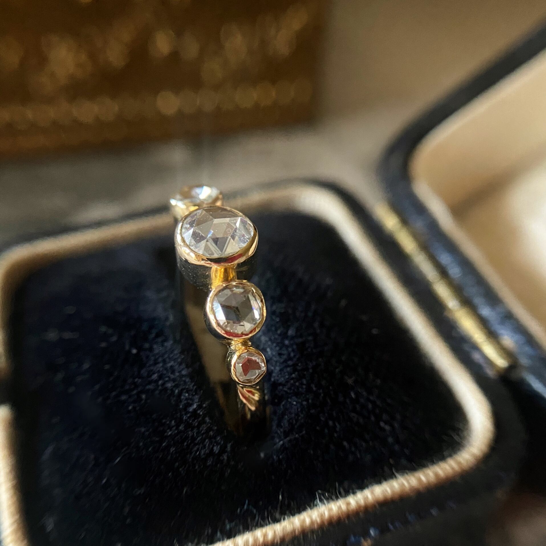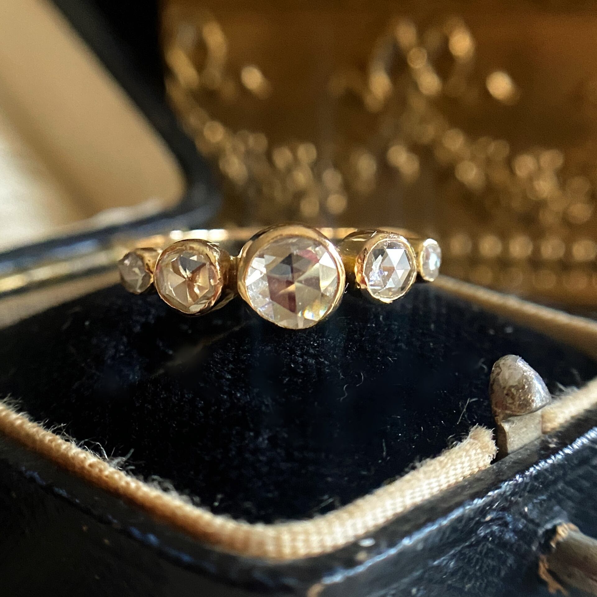アンティークらしい軽い着け心地やセッティング、水滴がゴールドの枠にぽたりぽたりと5滴落ちたような雰囲気は、ダイヤモンドをたて爪で5つ並べてセットしたものとはまた違い、光を多く取り込めないセッティングとは思えないほど、ローズカットらしいウルウルとした煌めきを放ちます。