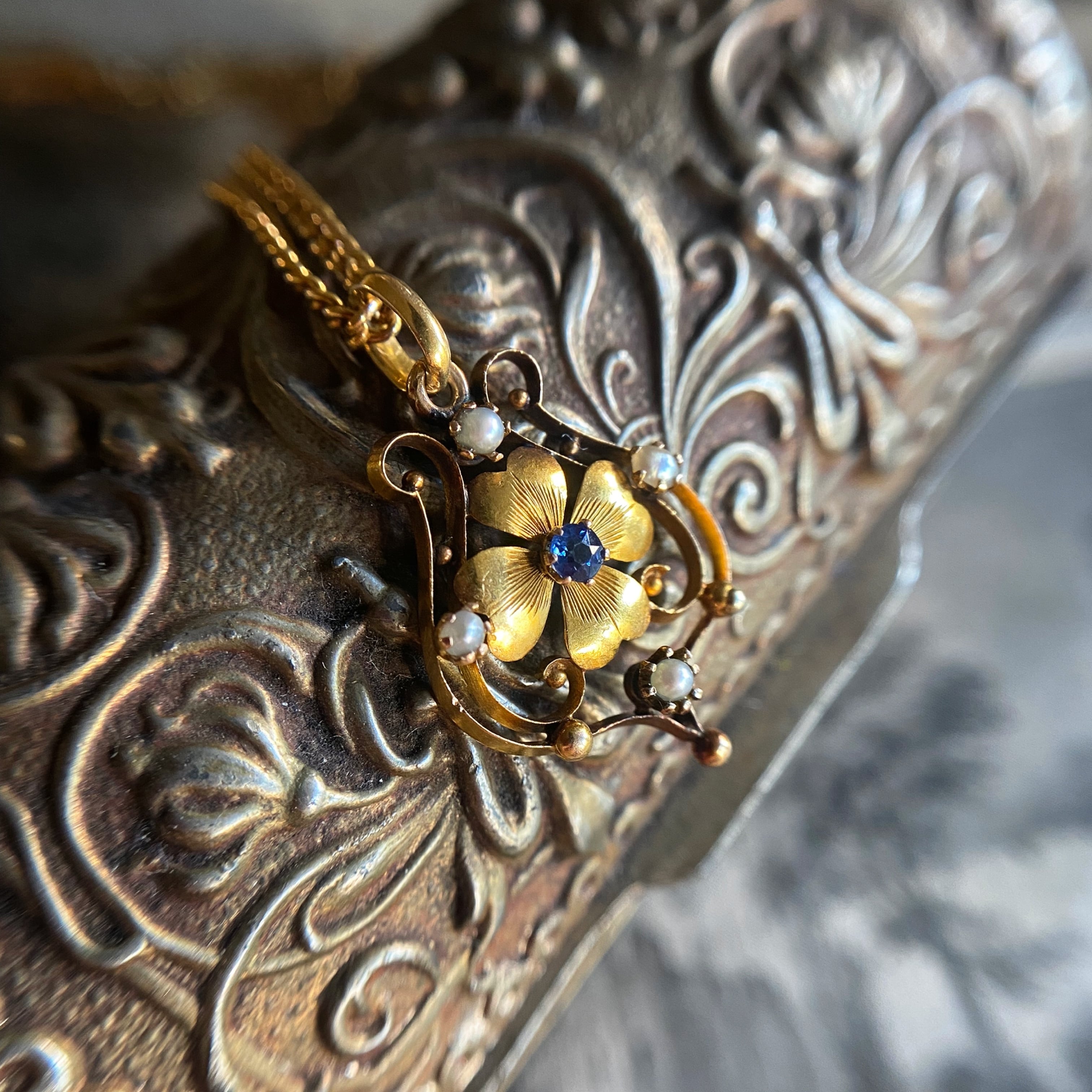 咲いたばかりのような生き生きとした四葉のクローバーにはブルーサファイアを添えて、葉脈もしっかりと表現した美しい表情のペンダントです。