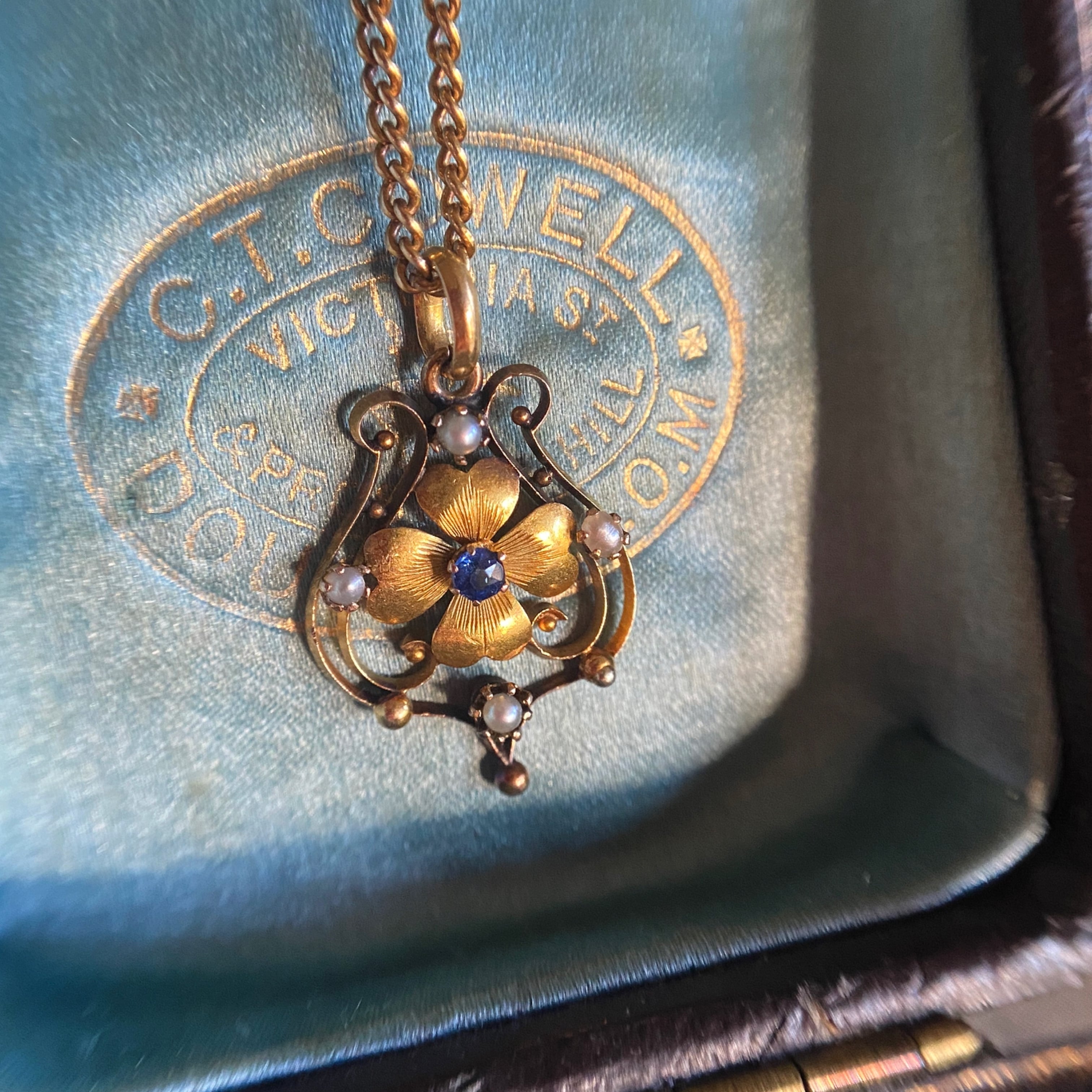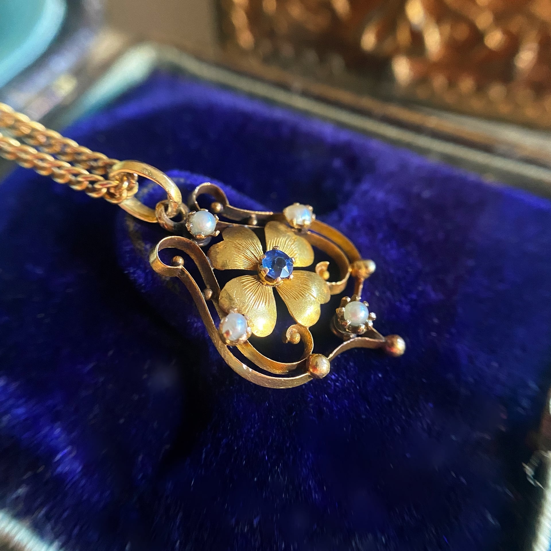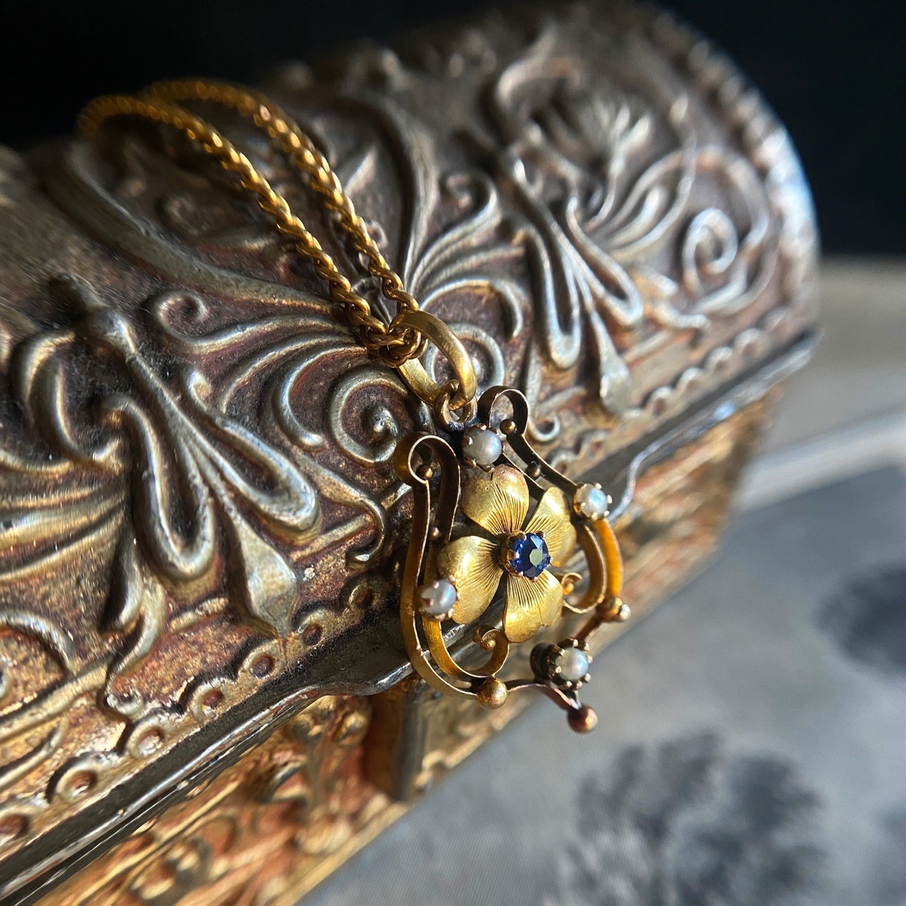 ギリシャ神話の伝説的音楽家オルフェウス、彼が奏でる竪琴を聴くものは、人も動物も植物も、みんなうっとりと聞き入ったと、というフレーズが思い浮かんだこちらのアールヌーヴォーの竪琴とクローバーのうっとりしてしまうペンダント。