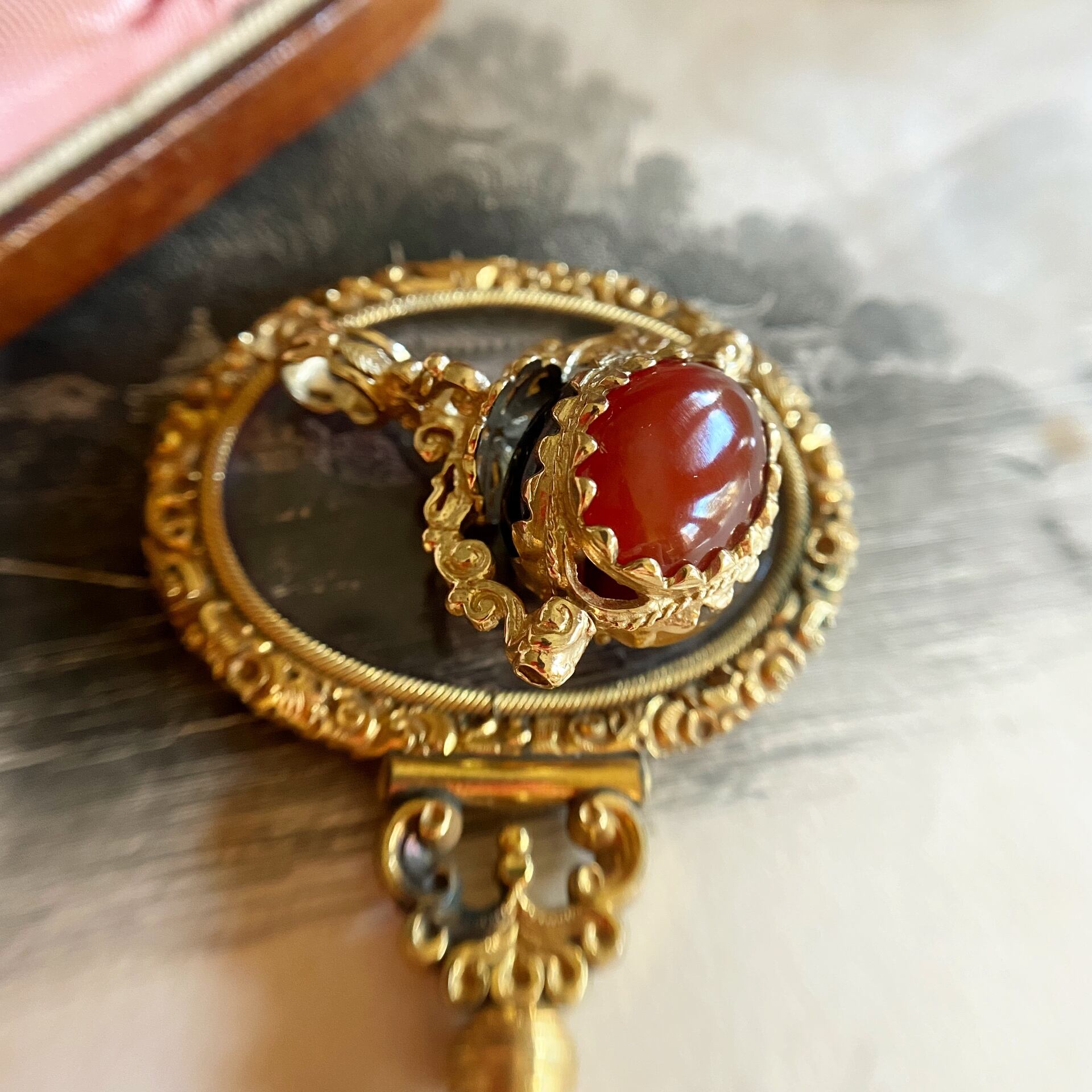 9金無垢のフレームのデコラディブな装飾が華やかで、3色の石はそれぞれダークトーンですが、その色味をしっかりと豊かに引き立て、バチカンのリーフデザインがとっても生き生きとして、一見派手にみえますが、全く嫌味がなく、気軽にお愉しみ頂けるフォブシールペンダントです。