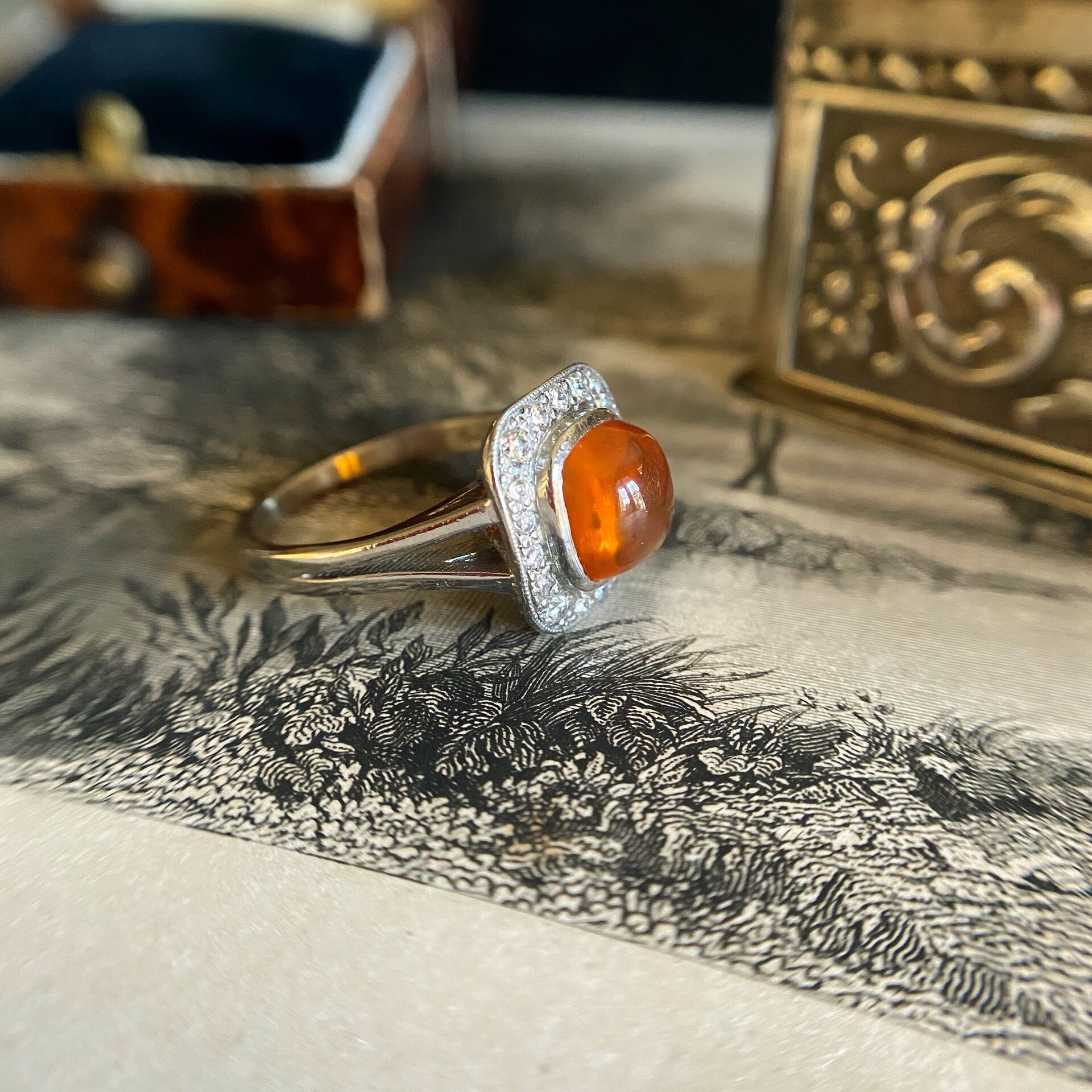 厚みのある鮮やかなオレンジ色の輝き、角度によって夕焼けのようにも、自然が作り出した天然故の美しい姿とエネルギーを感じるファイアオパールのポストアールデコリングのご紹介です。