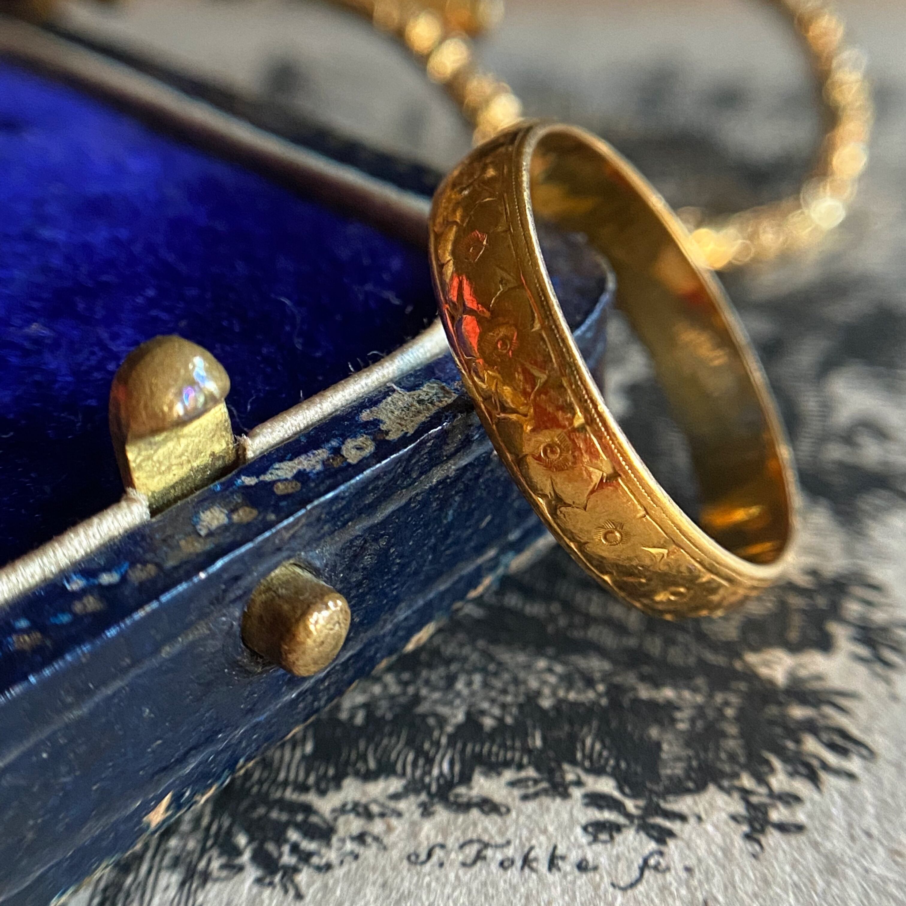 一周にわたり途切れる事なく勿忘草のお花がまるで花冠のように彫金された22カラットゴールドの愛らしいバンドリング。