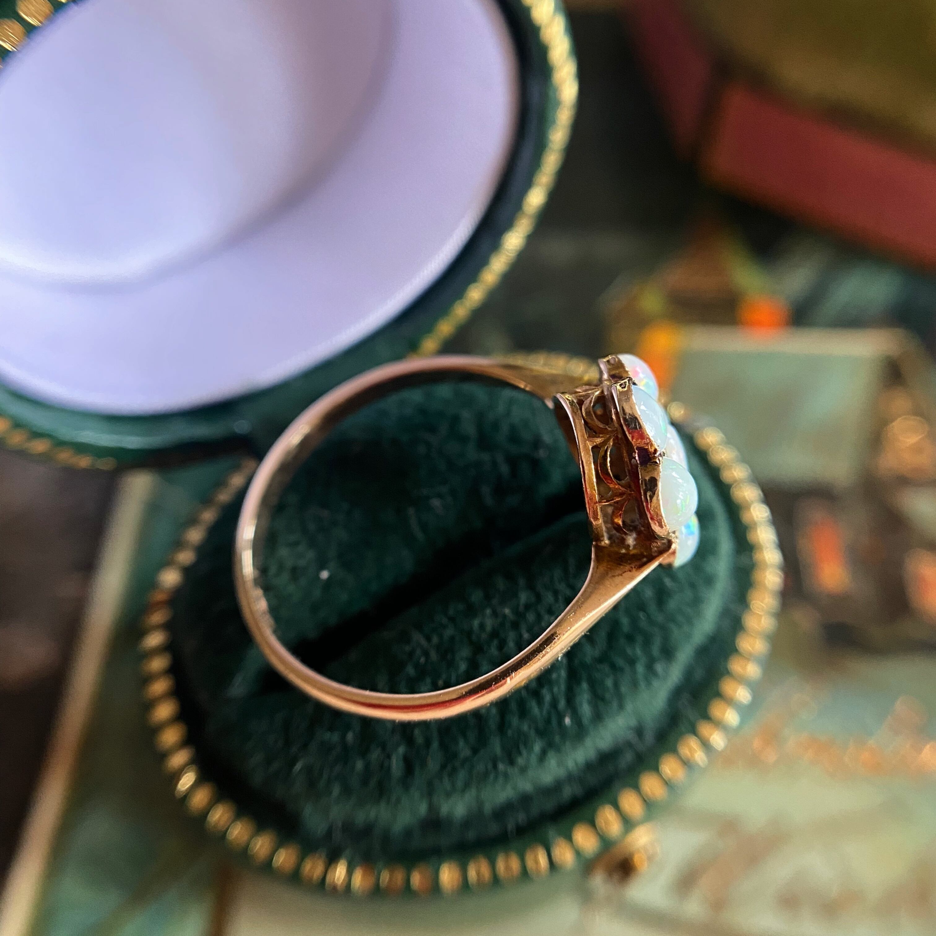 ヴィクトリア時代に好まれた石でもあるオパールは性質上デリケートな石の為アンティークの物になると時の経過分だけ表面が幾分マットで輝きが薄れてしまっている事が多くあります。こちらの石も時代によるマット感が少し見受けられる箇所もありますが、キズやカケはなく、指を動かす度に本当に美しいオレンジやグリーン、ブルーのクリーミーな浮遊色をそれぞれの石がしっかりと見せてくれます。