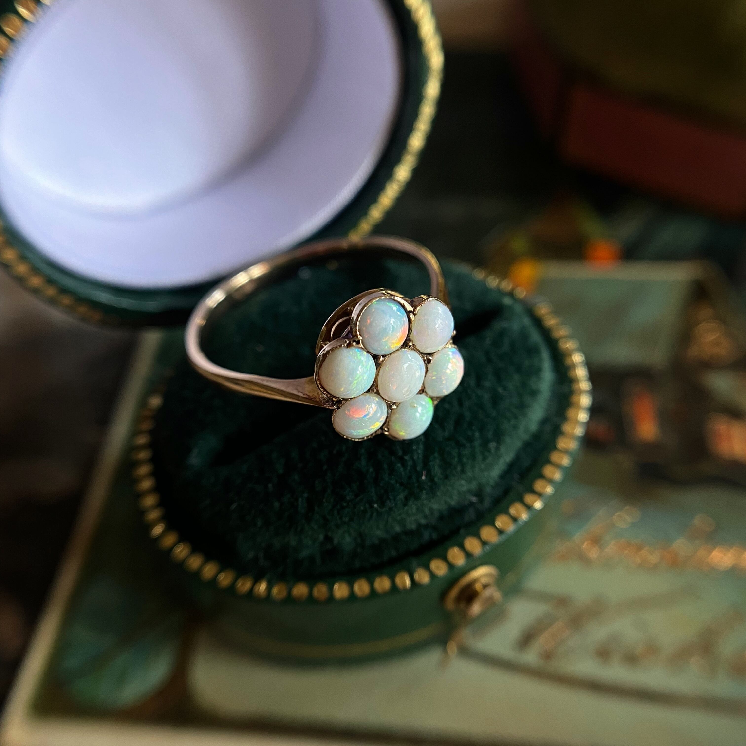 コロンとまん丸にカボッションカットされた乳白色のオパールを7石集めてデイジーリングに仕立てたセンチメンタルなヴィクトリアンらしい可愛いリングのご紹介です。