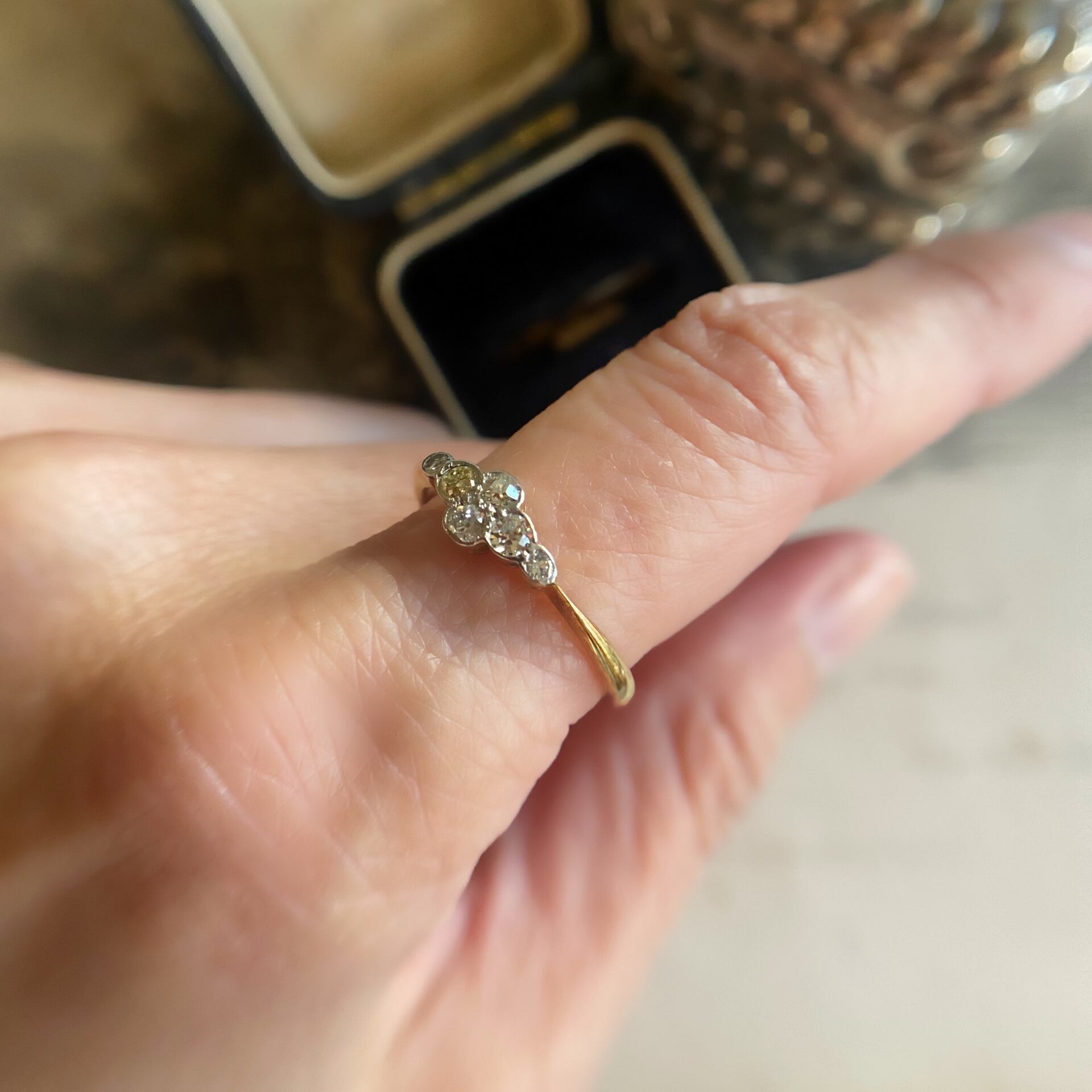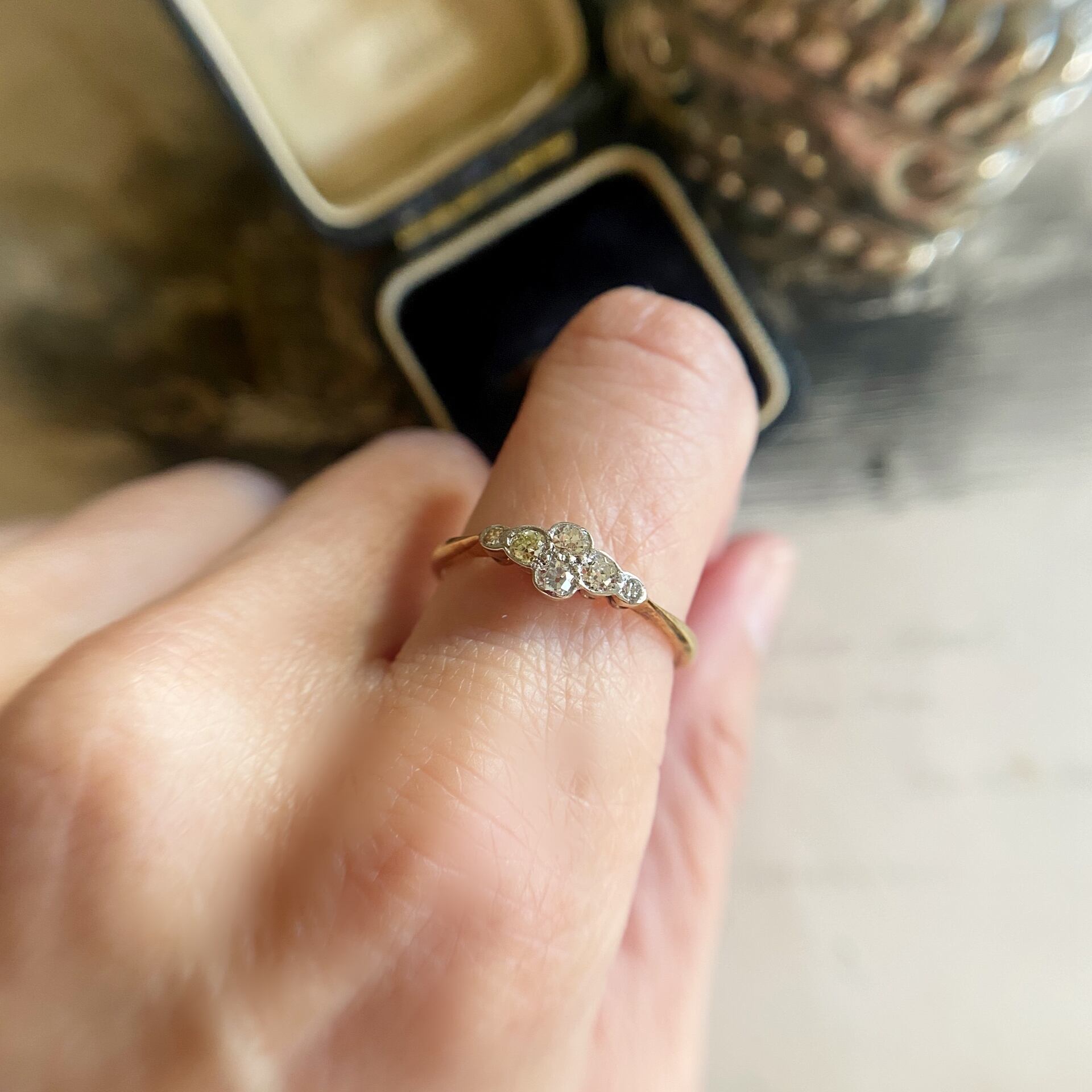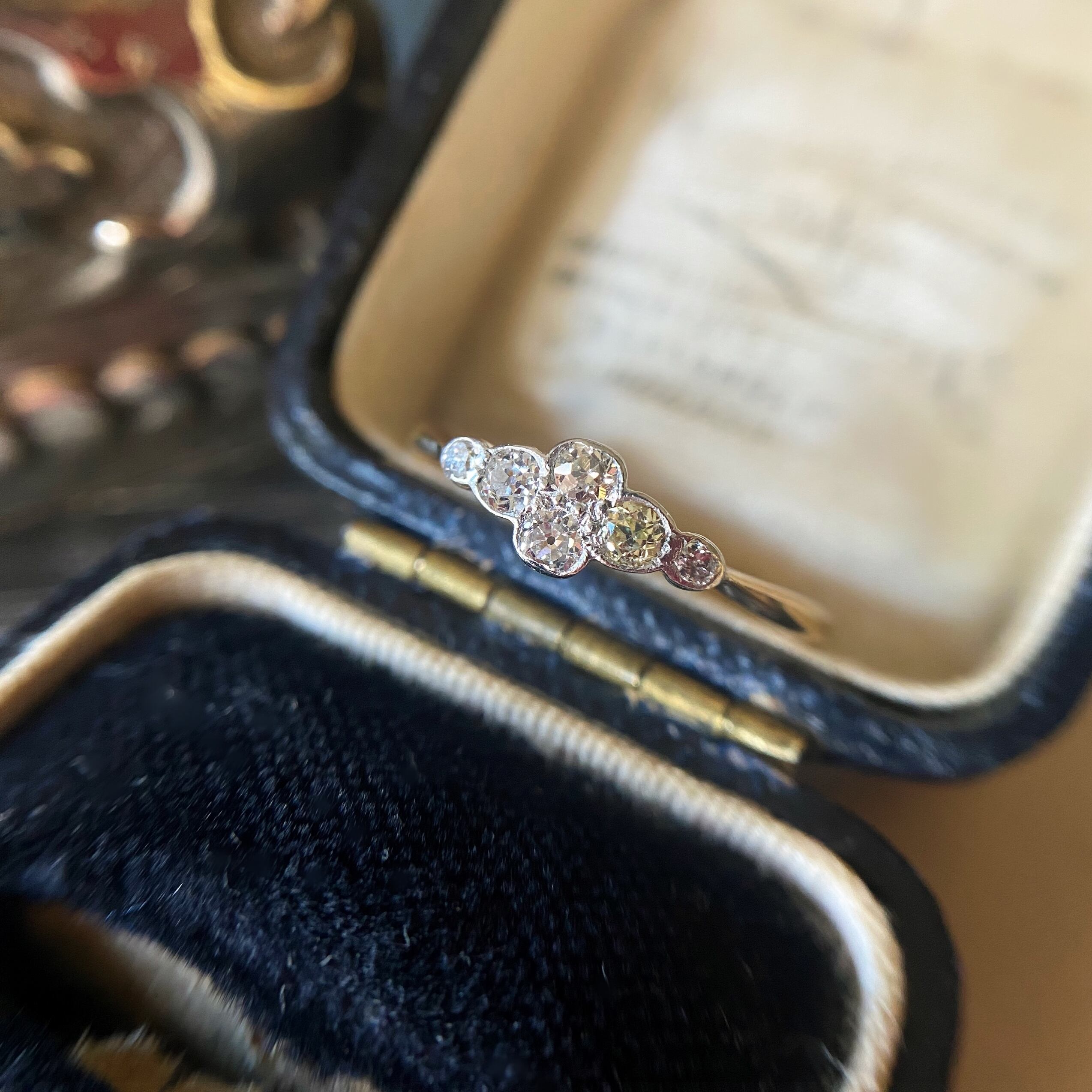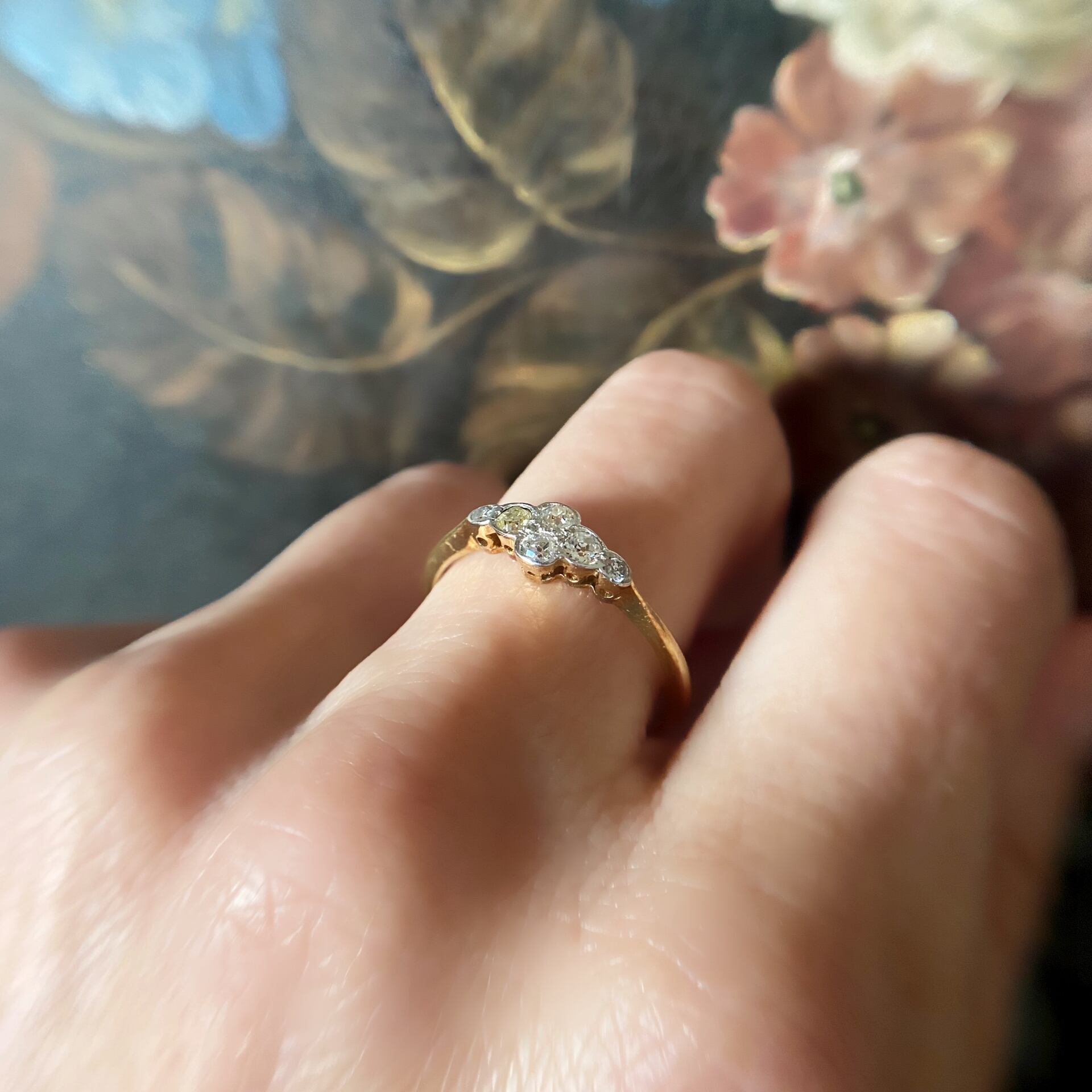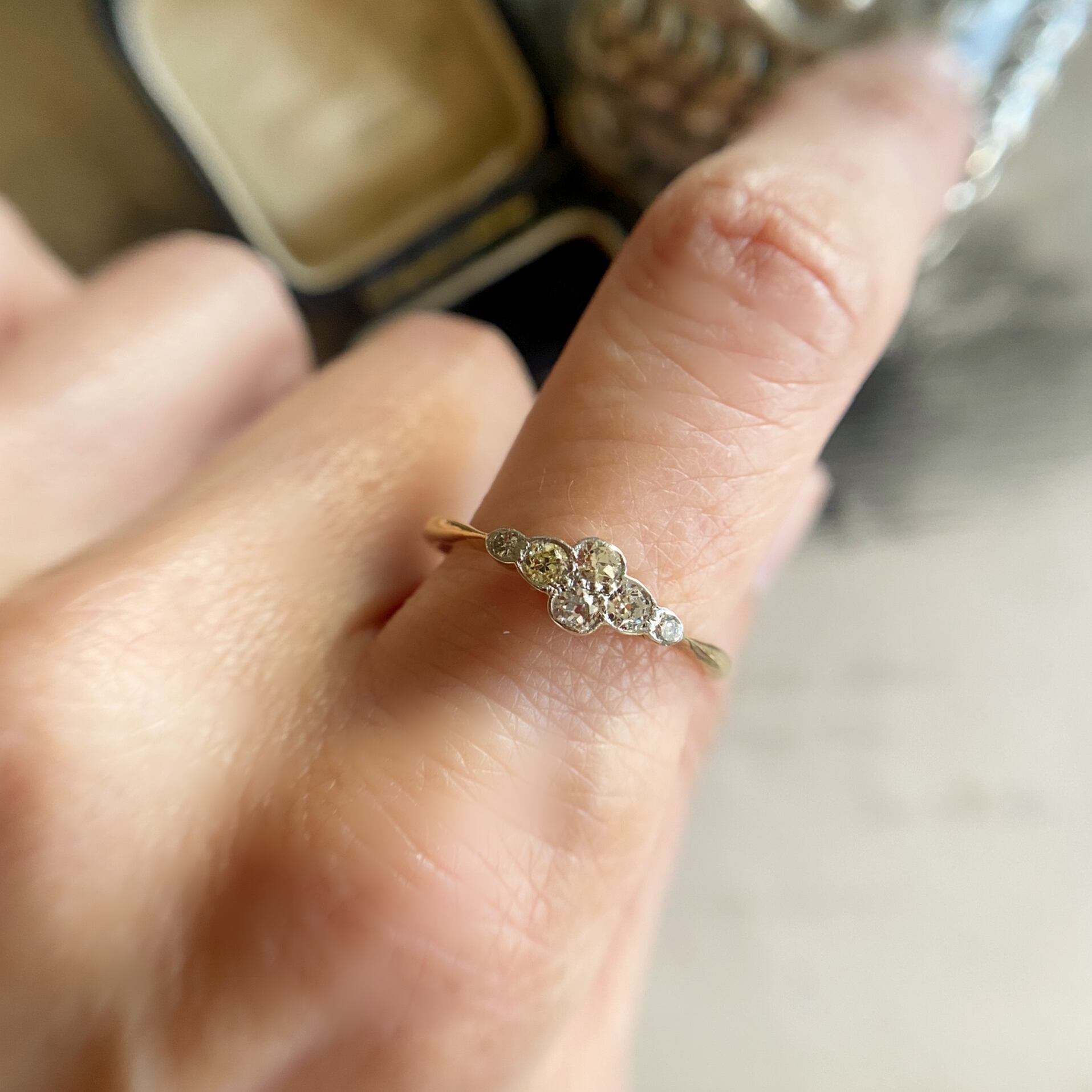 小さなオールドシングルカットダイヤモンドを四つ集めてクローバーに見立てた愛らしいエドワーディアンリング。