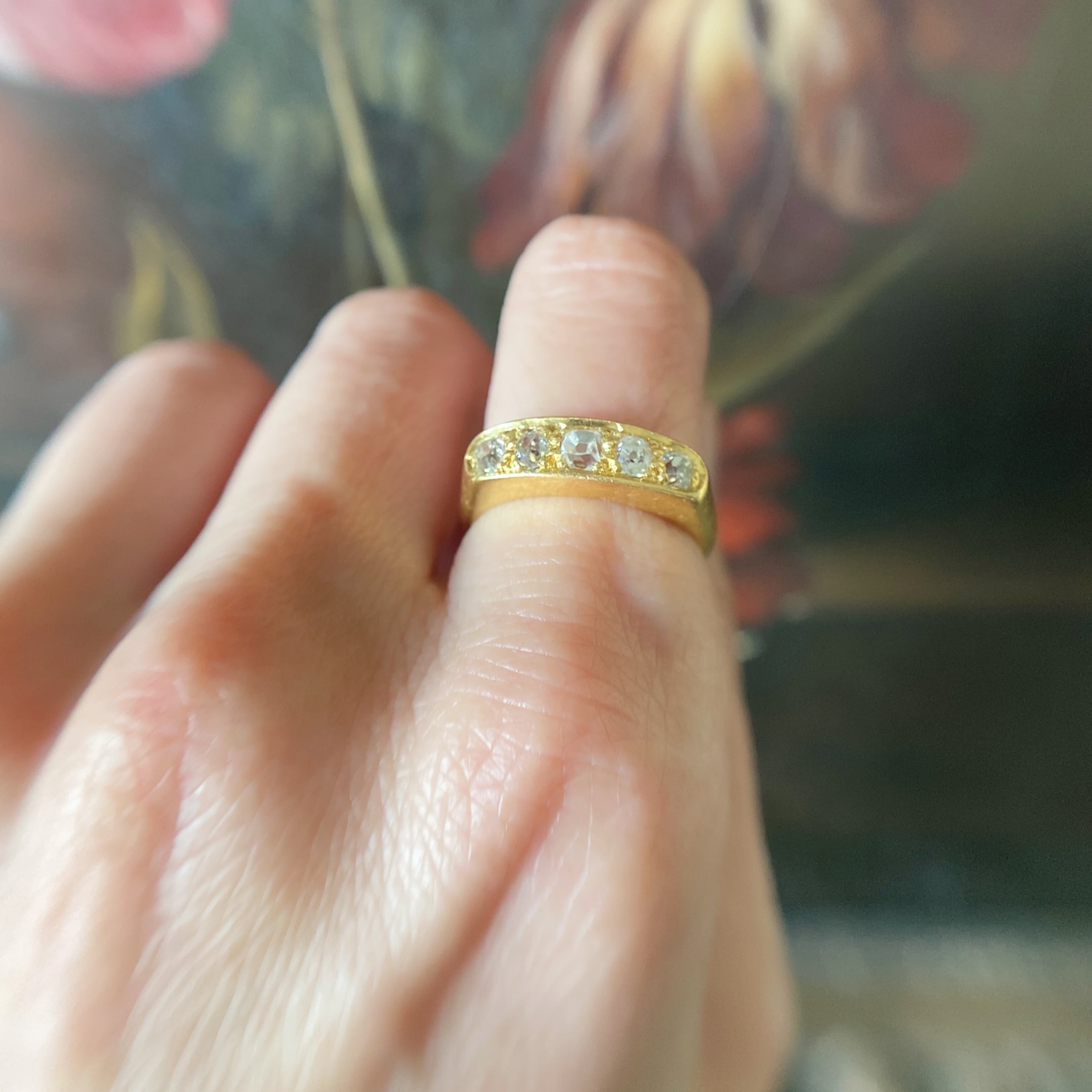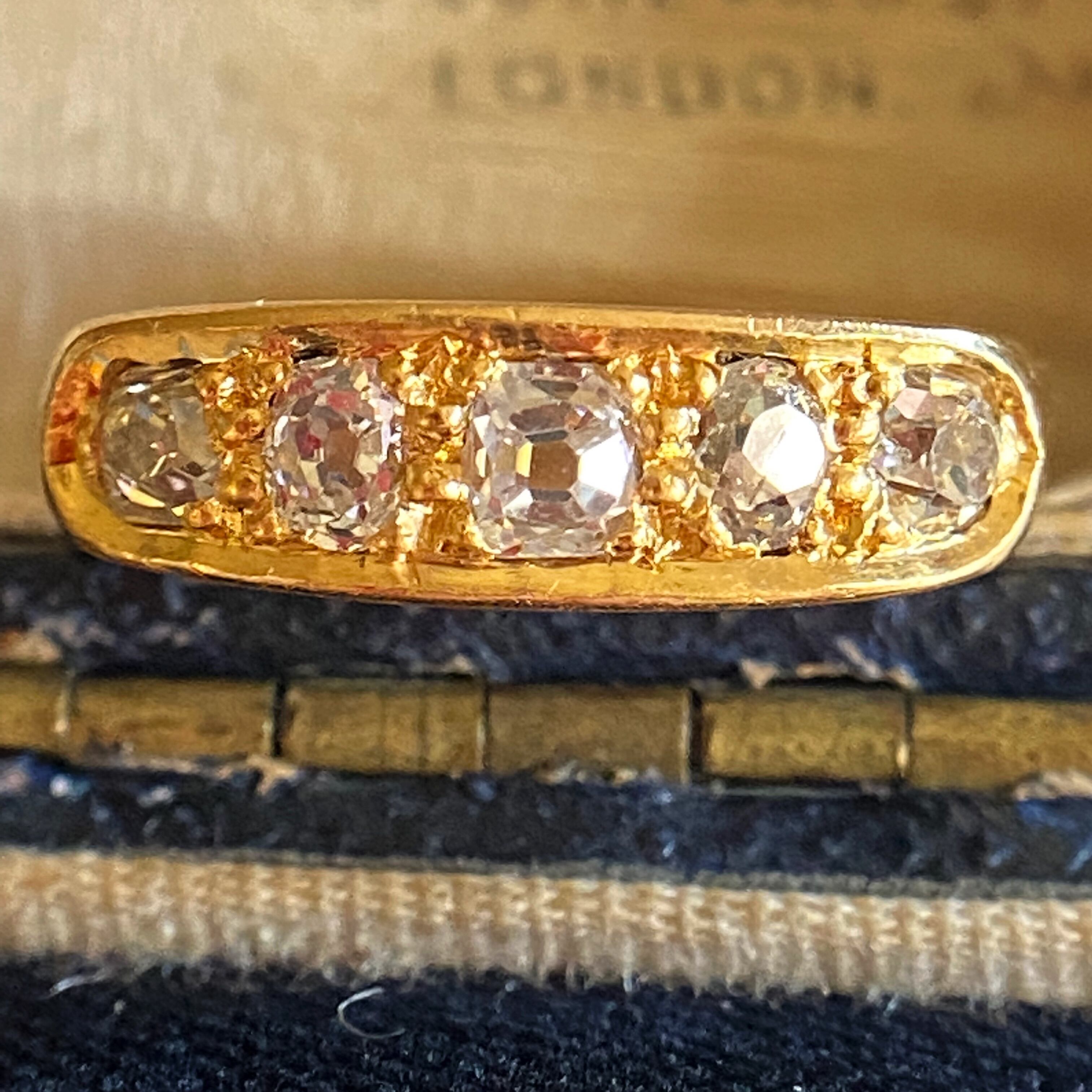ファイブストーンには色々なデザインのタイプがありますが、こちらのリングは22ctを生かしてあけえ彫金などはなく、ソリッド感を主張したデザインになっています。ダイヤモンドをホールドしているぽこぽこと小さな金粒なような爪は、光がさすとダイヤモンドと共鳴し、美しい煌めきをみせてくれるとっておきのヴィクトリアンファイブストーンリングです。