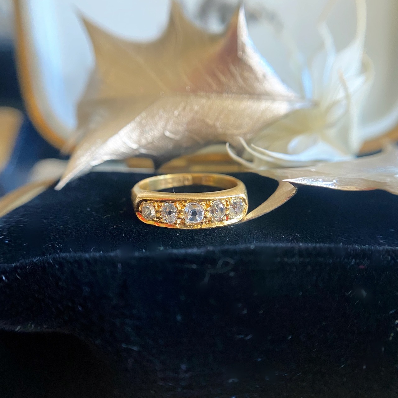 ソリッドゴールドの艶めきの中に遠い夜空の星々のように深々と台座に鎮座するオールドマインカットダイヤモンド達がシックな美しさを誇るファイブストーンリングのご紹介です。