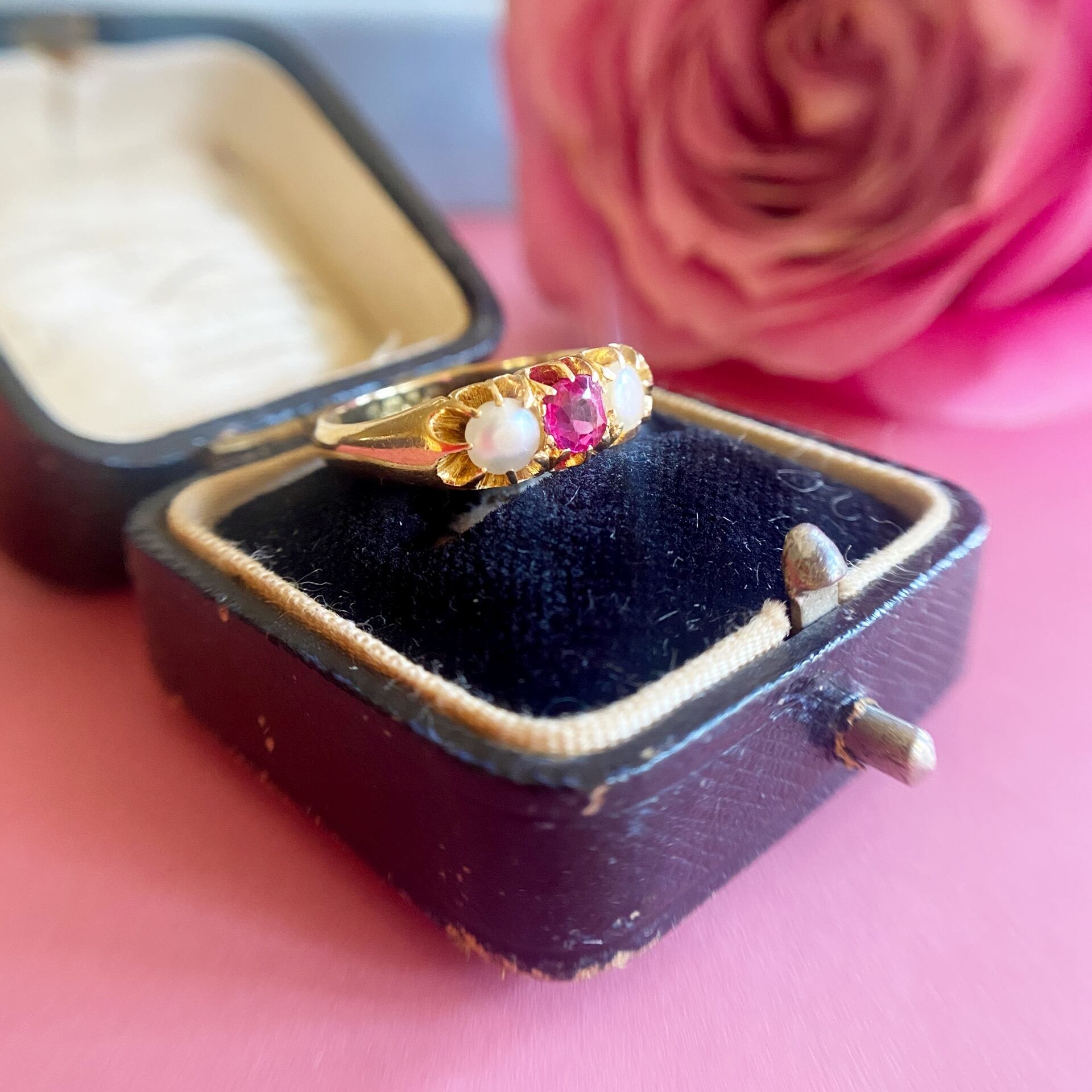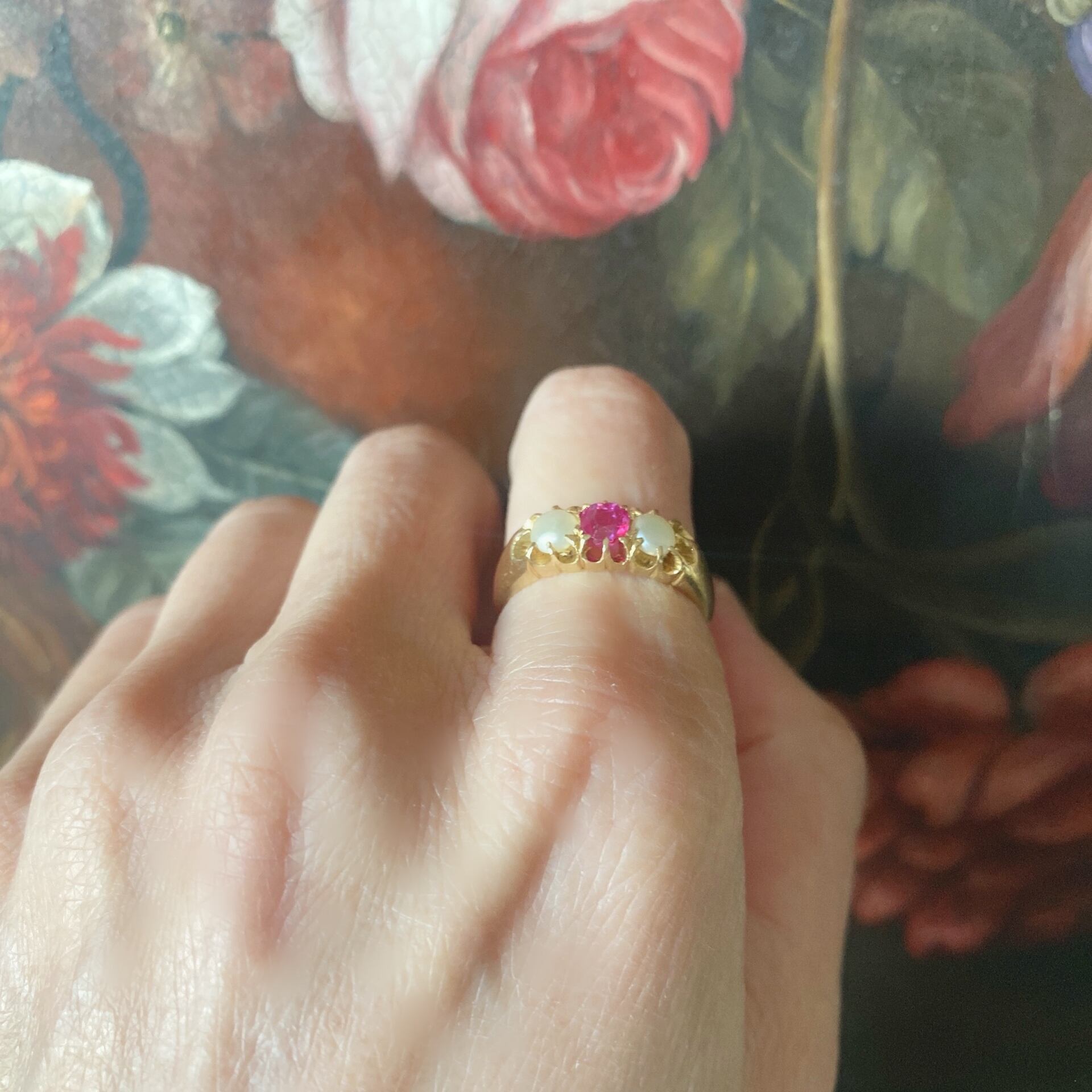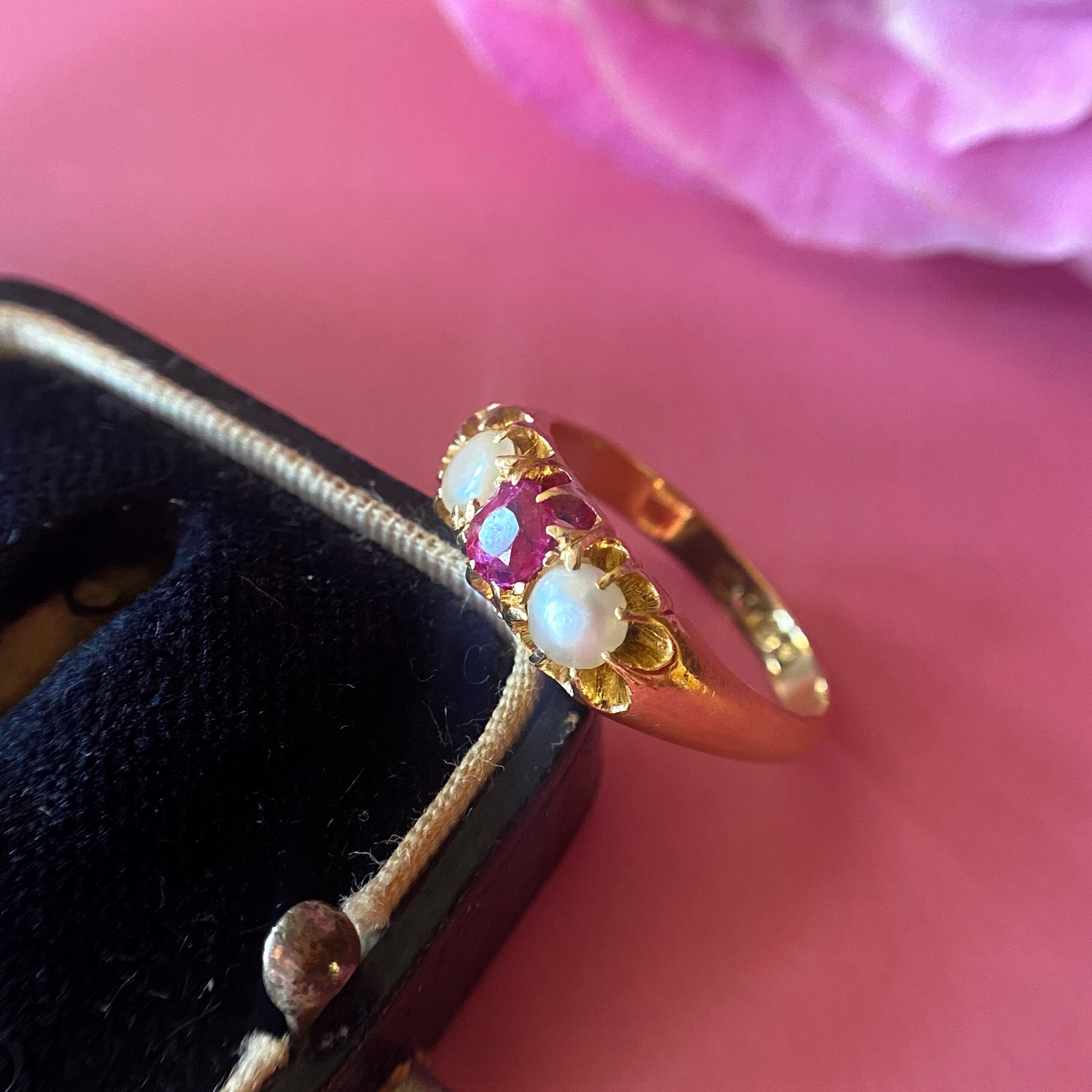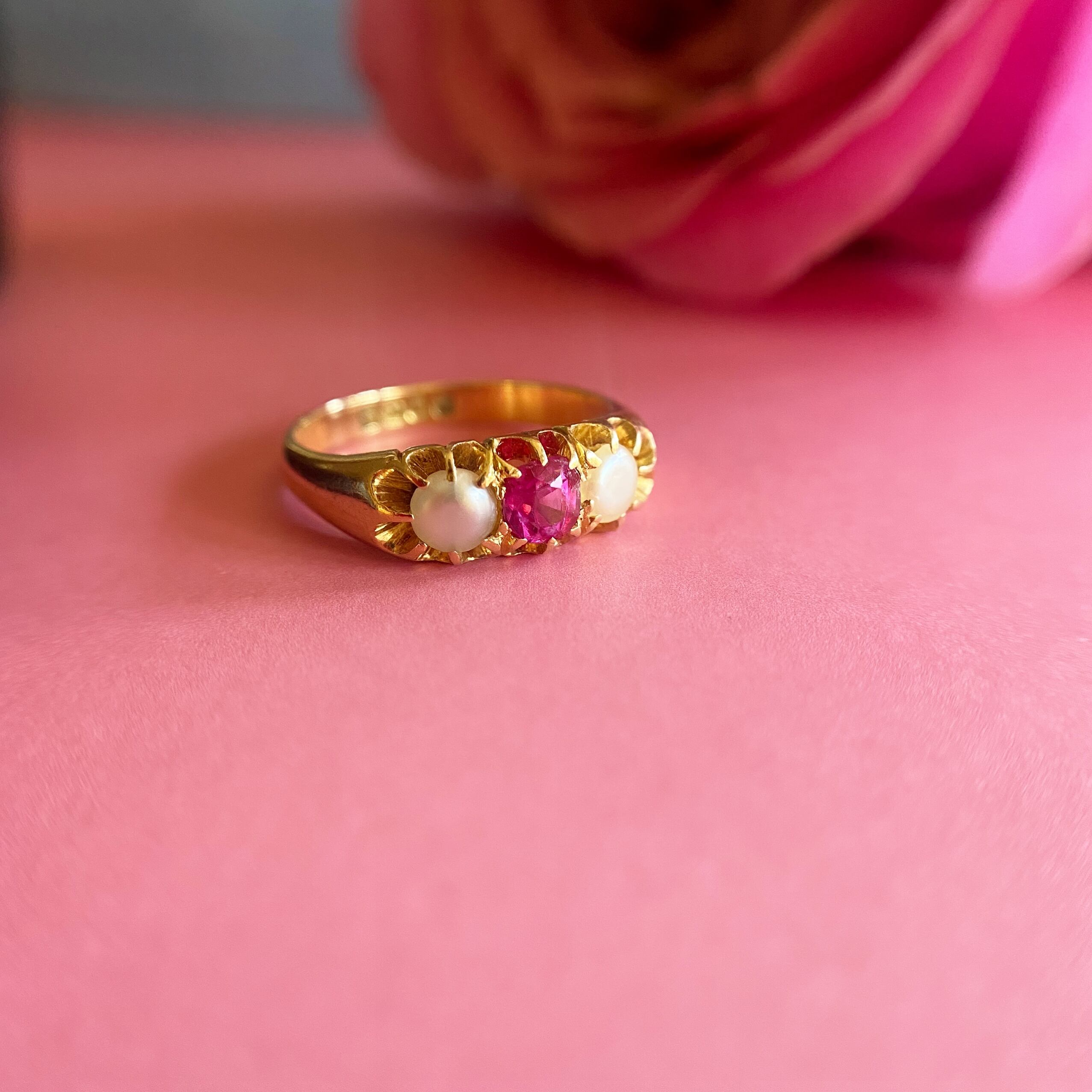 ピンクサファイア&ナチュラルパールのバターカップセッティングスリーストーンリング