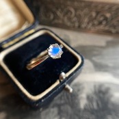 光の当たる角度によってブルーの色が湧きあがるようにフンワリ広がったり、消えて水晶のような姿を見せたり、幻想的で神秘的なぷっくりと山高のカボションカットムーンストーンがただ一粒シンプルなプラチナの細い爪に持ち上がるようにして支えられている、まるで夜空に蒼白く光る満月を思わすひと品です。