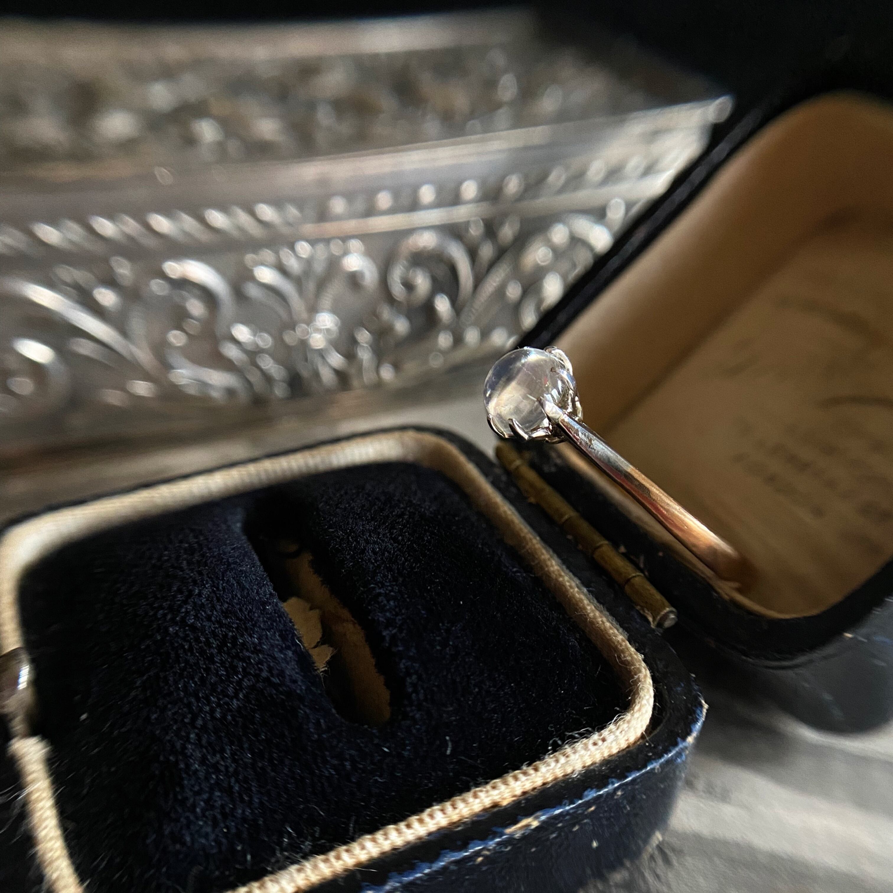 華美な装飾がない理由がわかるほど、石の美しさだけで充分な存在を放つ本当に透明度が高く、インクルージョンも少ないムーンストーンがセットされており、小さくとも充分な存在を放つ素敵なリングリングです。