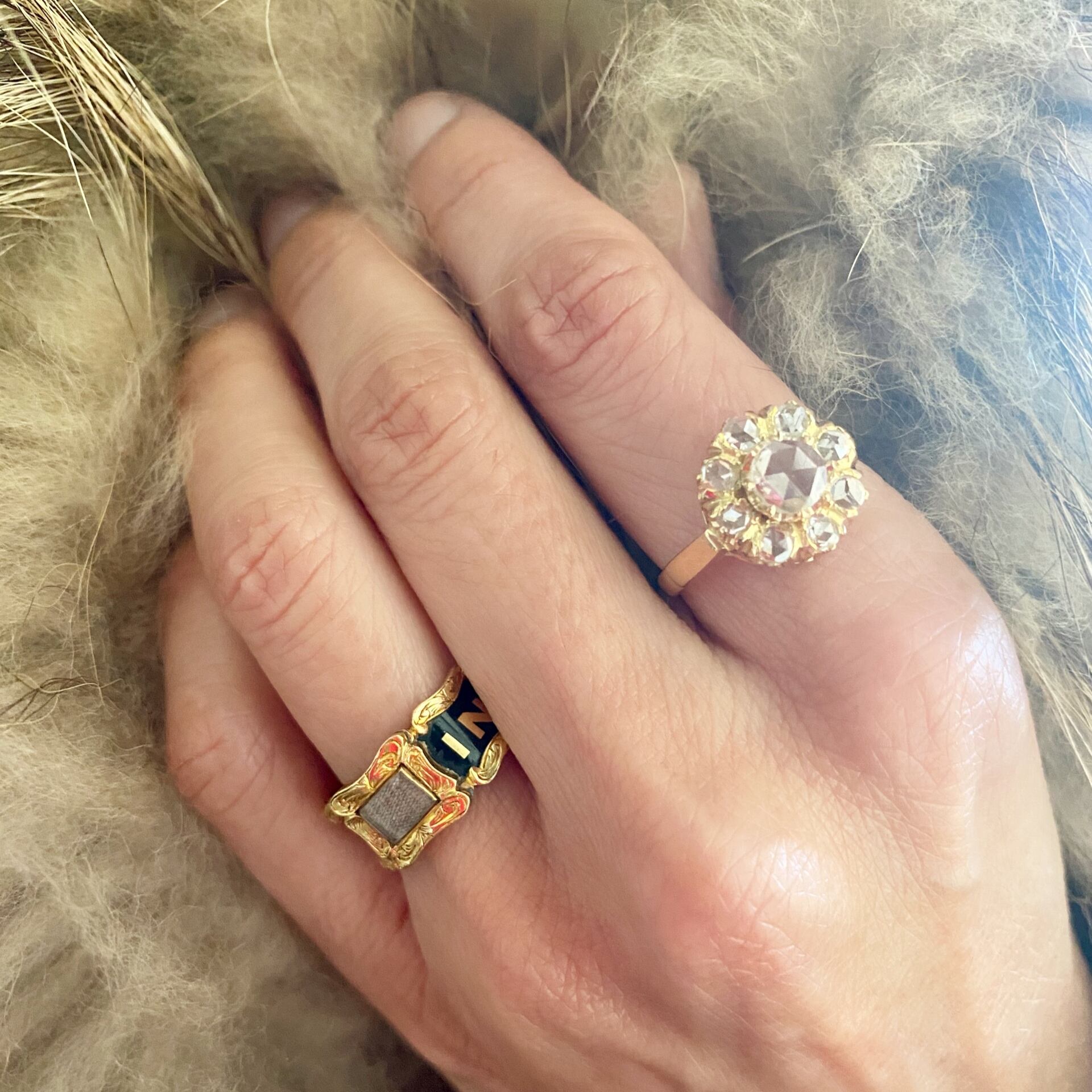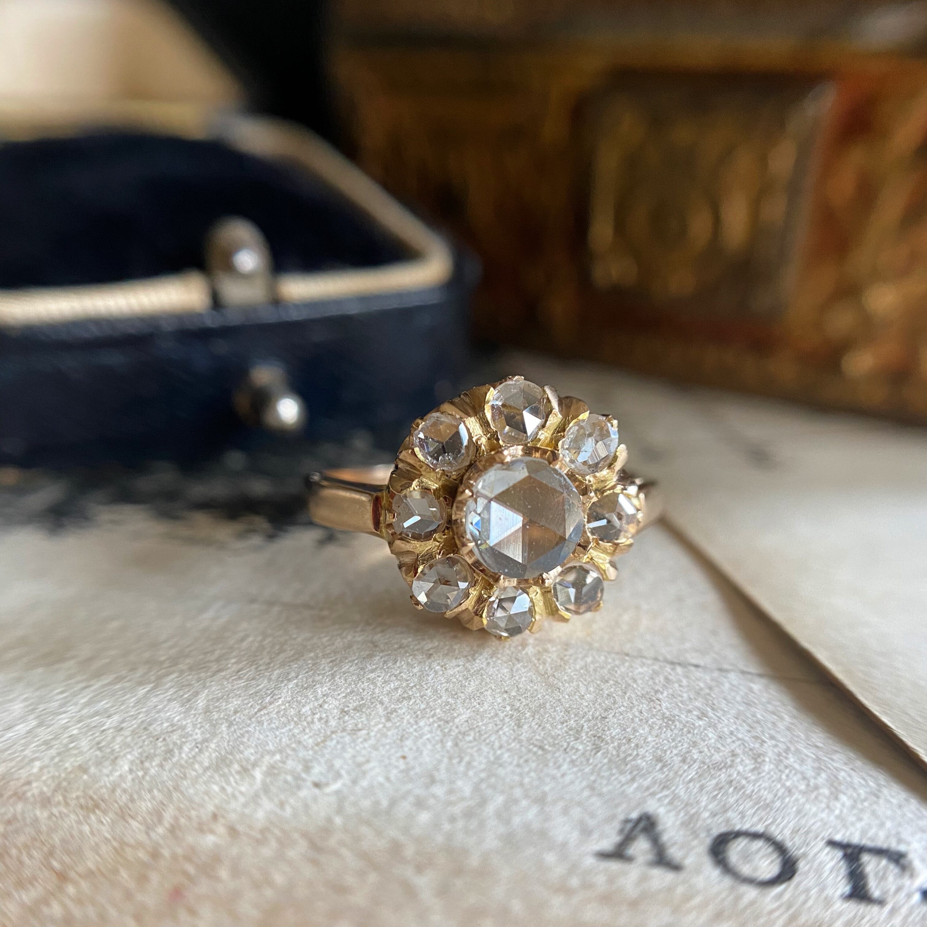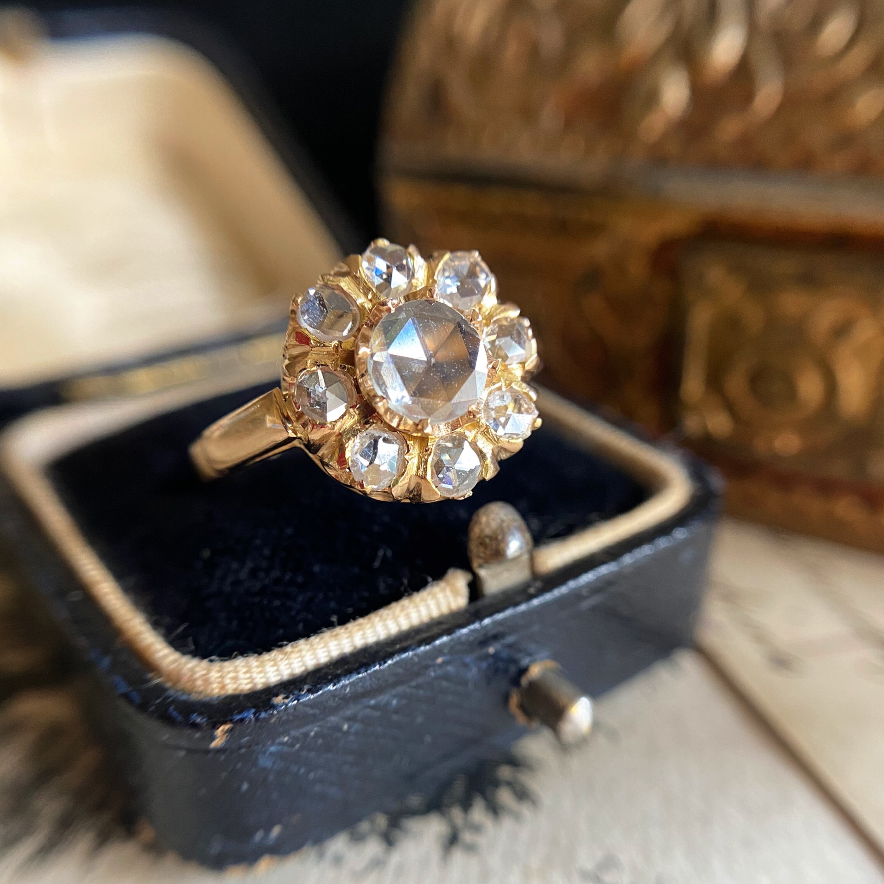 カット面の少ないローズカットの場合、反射が少ないゆえに中の内包物やカラーの品質がありのままに現れます。58面のカットにより光を反射することで輝くダイヤモンドにとって、24面で勝負をするのは自信のある証!だと思いませんか? だからこそコンディションがよく、上質のローズカットダイヤモンドアンティークリングを見つける事は簡単ではないのです。
