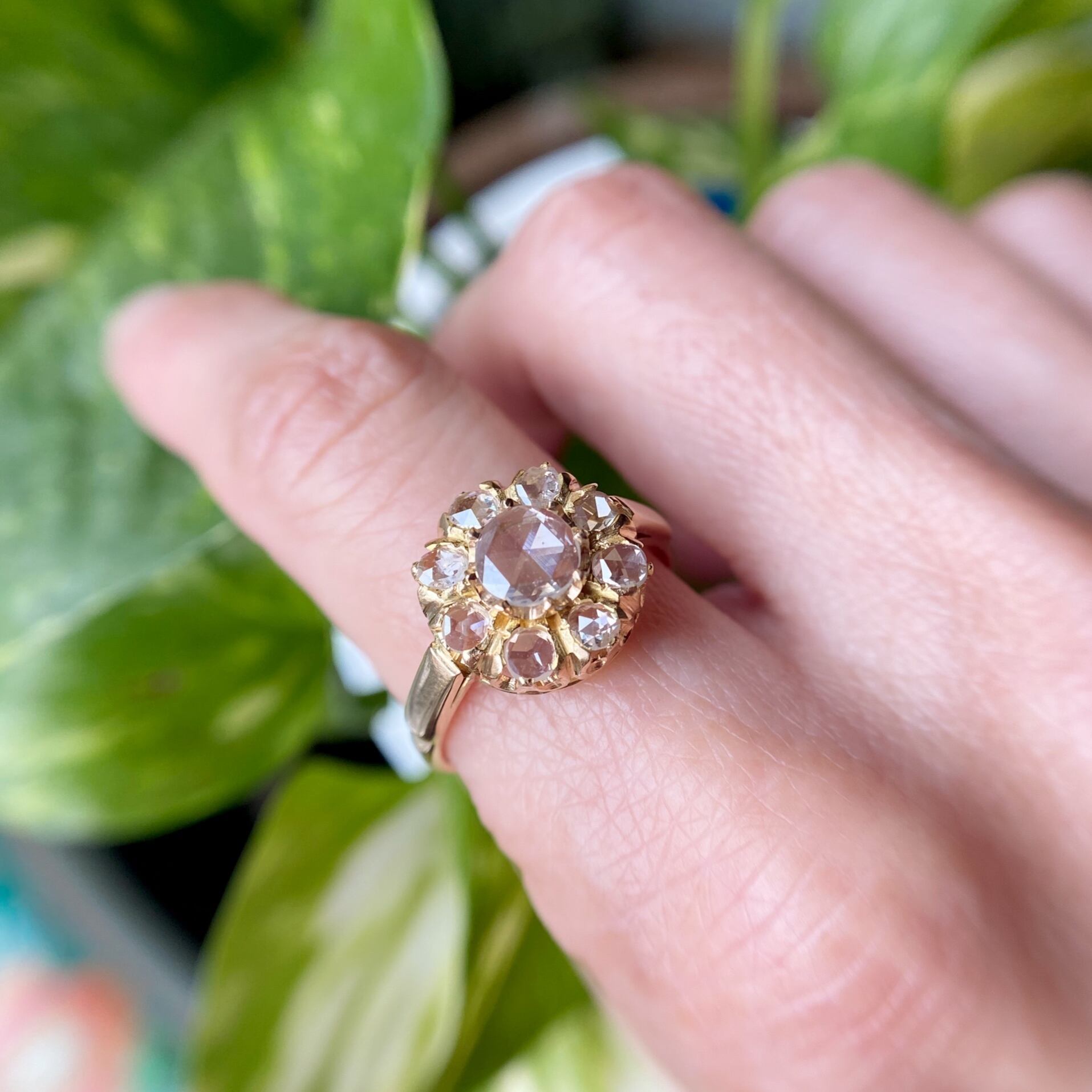 無色透明でクリアーなダイヤモンドの氷のようなクールな表情が美しいローズカットダイヤモンドクラスターリングのご紹介です。