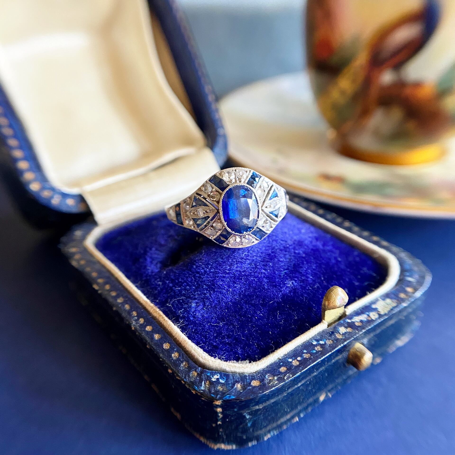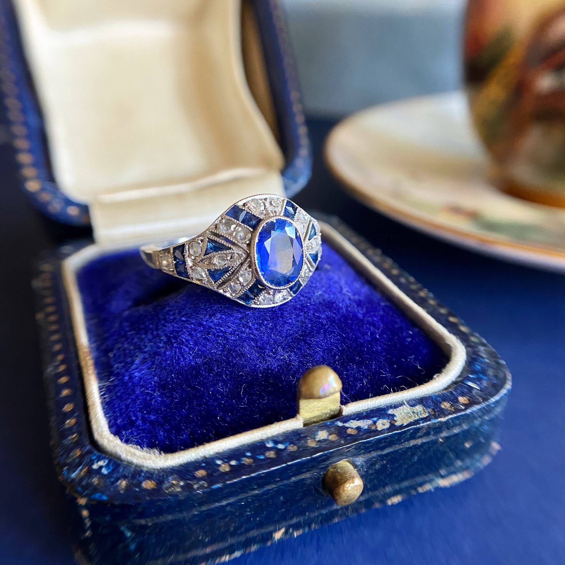 程よい高さと程よく膨らみのあるデザイン、フェイスの透し彫りや枠の隅々まで打たれたミルグレイン、カリブレカットサファイアとトライアングルカットサファイアが脇石として使われ、デザイン上の大きなポイントとなり、オールドシングルカットダイヤモンドとローズカットダイヤモンドがフェイスやショルダーに散りばめら、全てが繊細精緻で、台座のギャラリーに施された透かしまでも美しく、ハイレベルのリングである事が分かって頂けるひと品です。