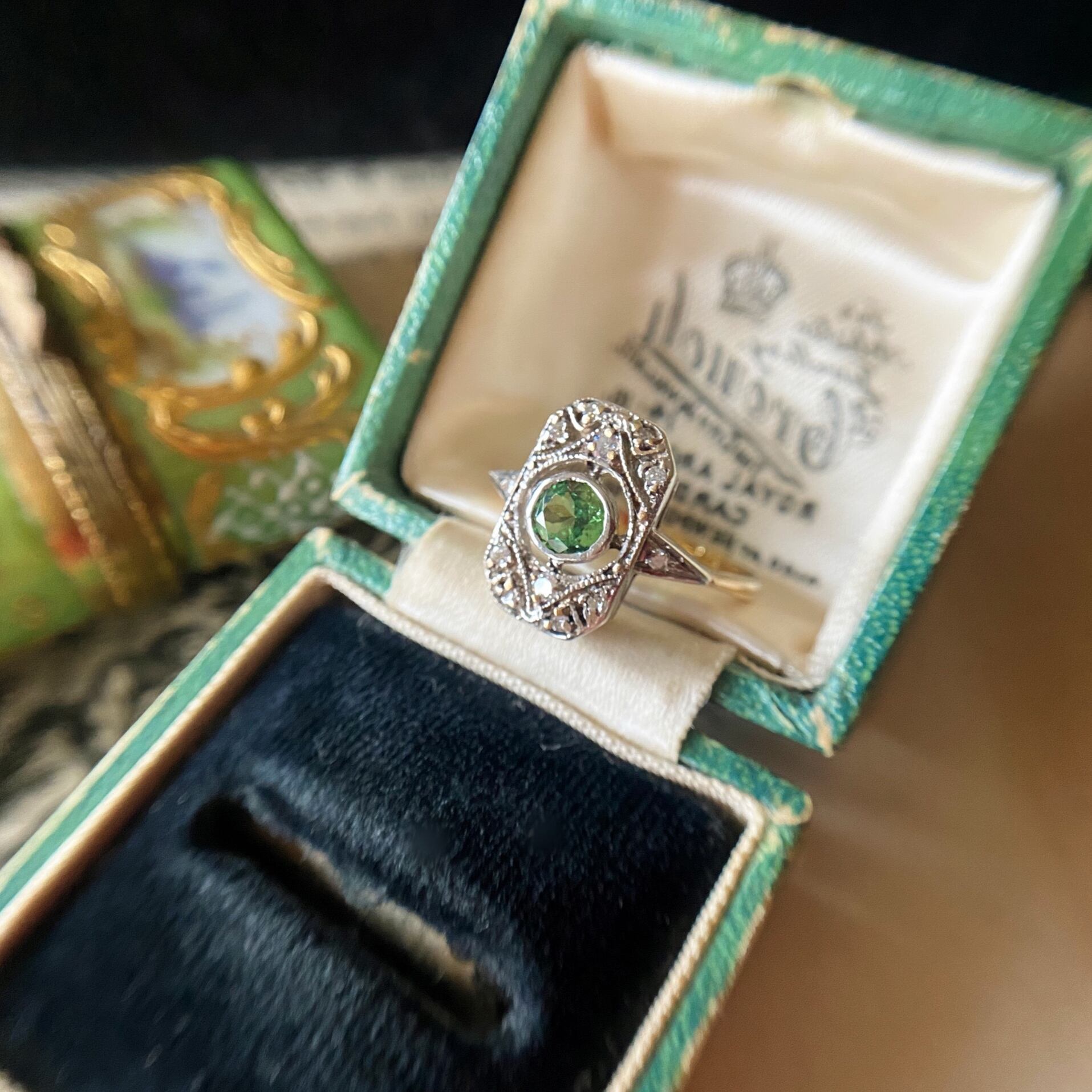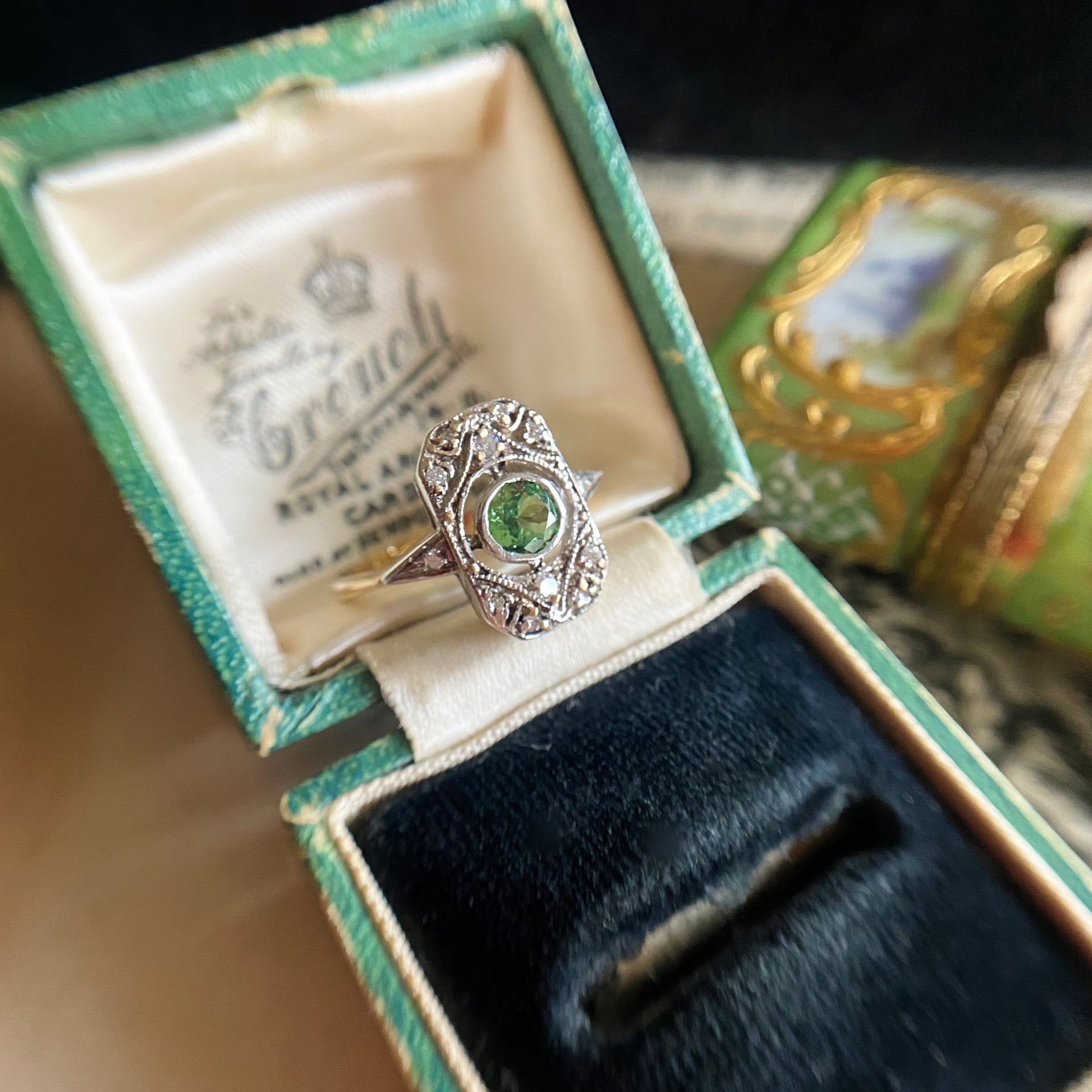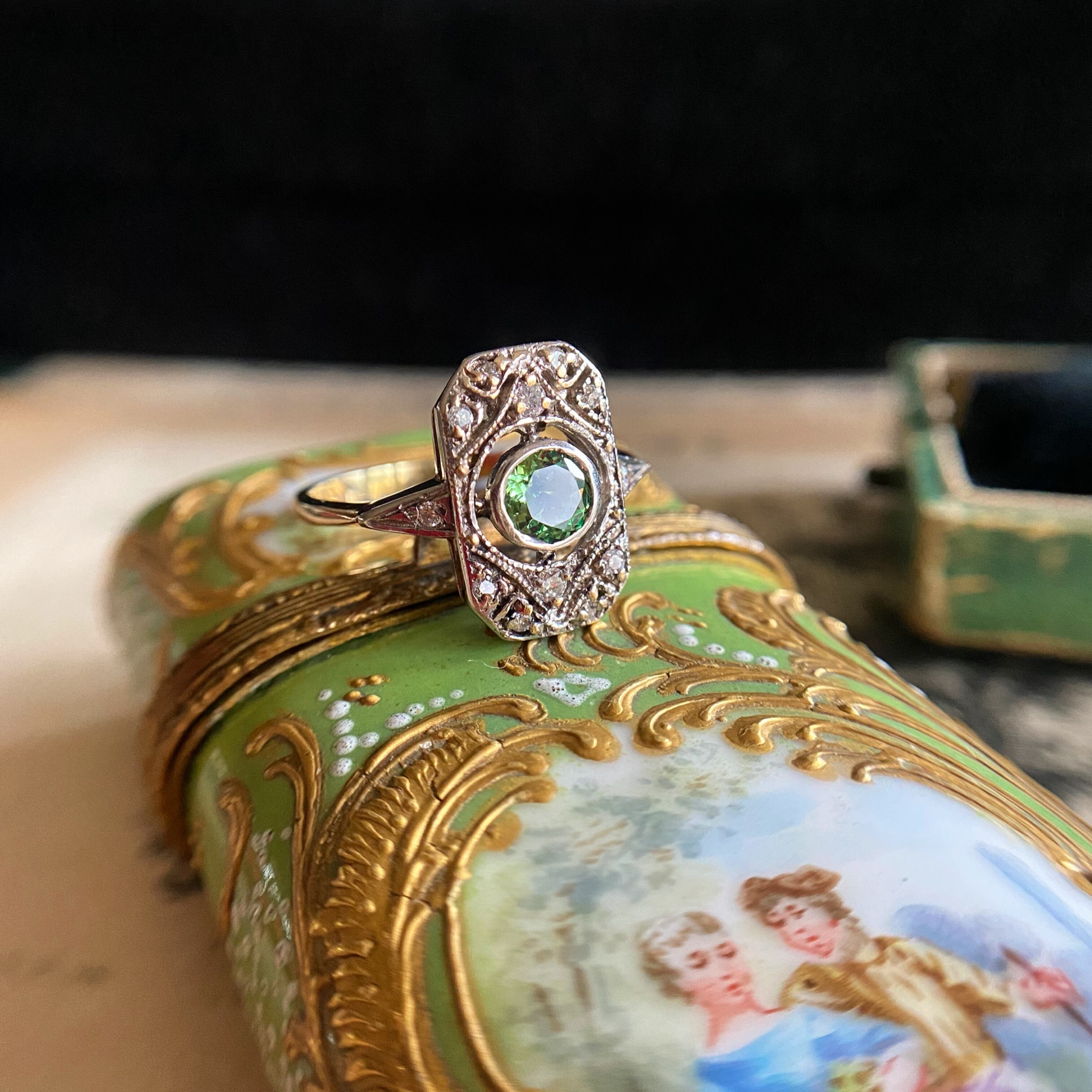 凛とした澄んだグリーンが美しいグロッシュラーライトガーネット(ツァポライト)に思わず視線を奪われる、自然が育んだ色彩の力強さに美しさを感じるアールデコリングのご紹介です。