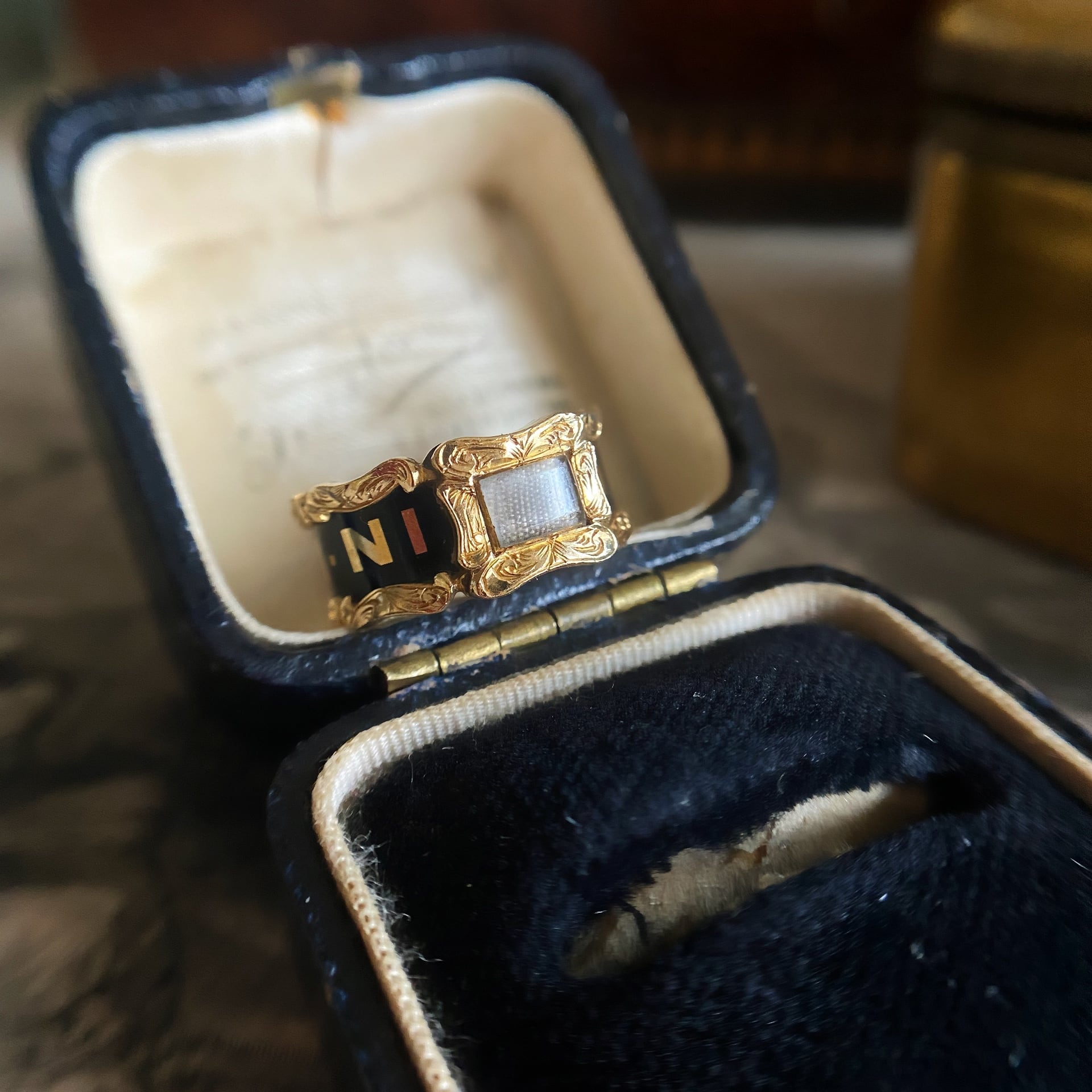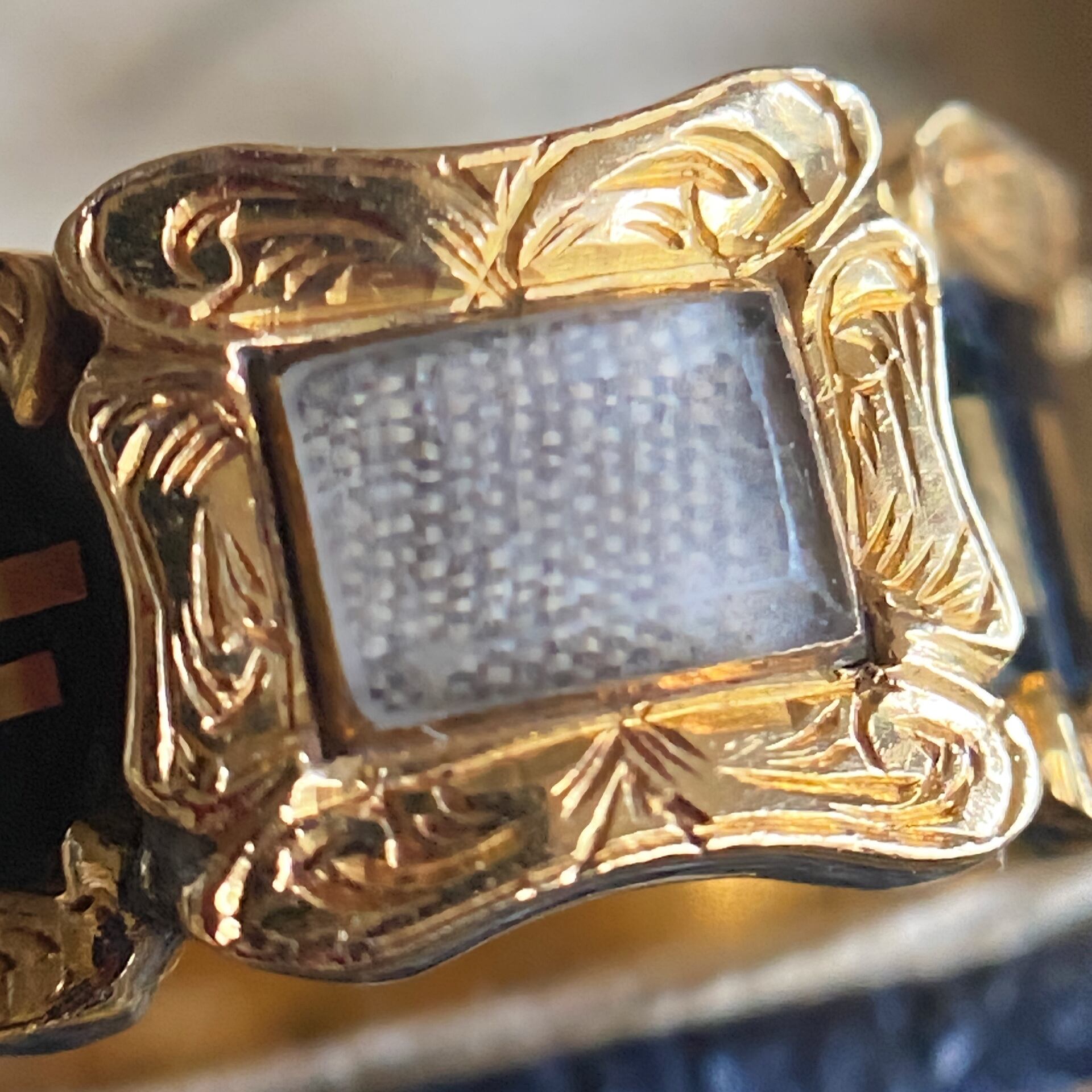 額縁のようなフレーム、リングの縁取りに施されたゴールドのアカンサスの彫金のうねりの迫力と対比色の美しさはモーニングジュエリーならではですね。遠い時代の記憶の痕跡を感じられる素晴らしいリングはコレクションリングの一つとして加えてみるだけで、アンティークの世界観が一気に広がり、お守りのようなひと品として、飾っておくだけでも素敵だと思います。