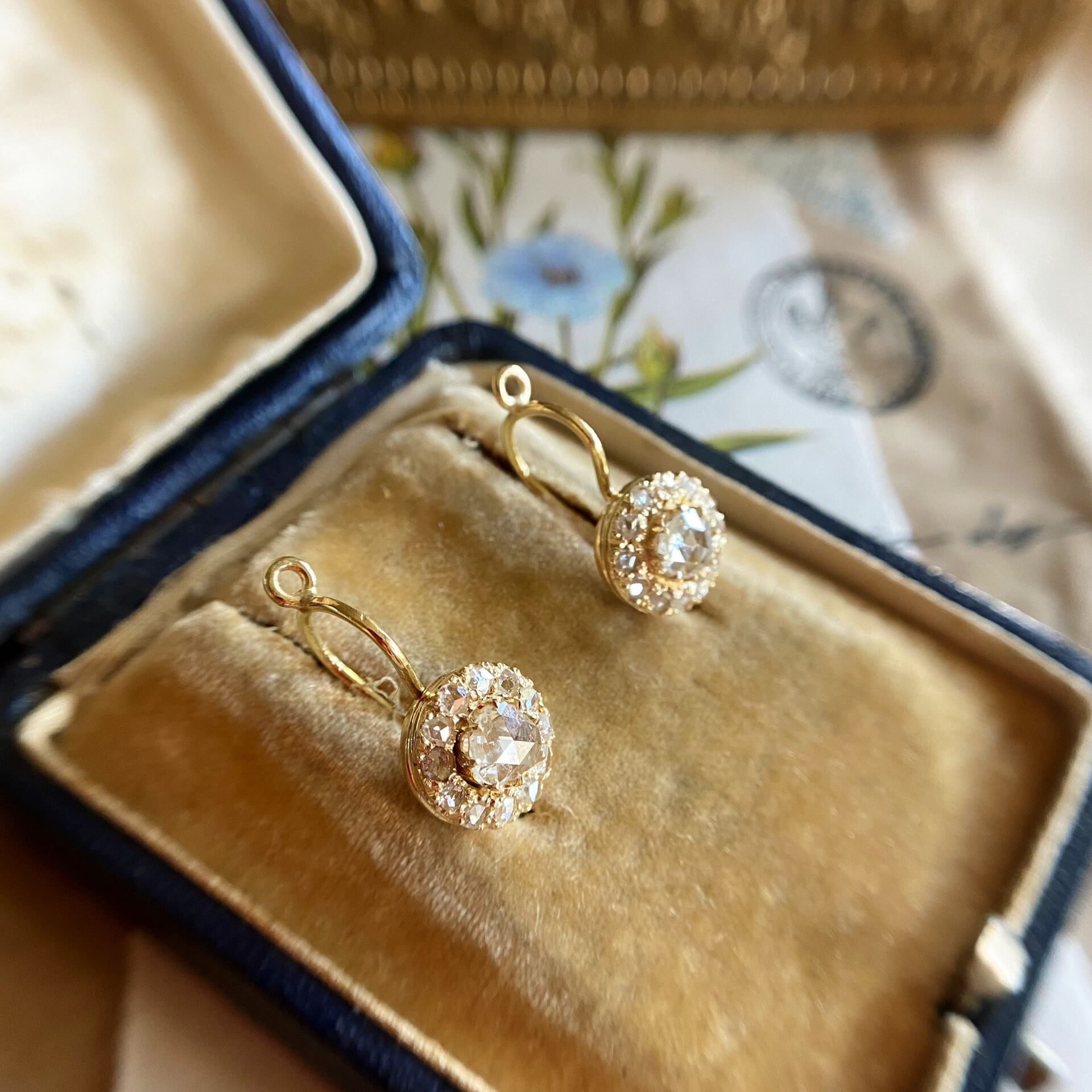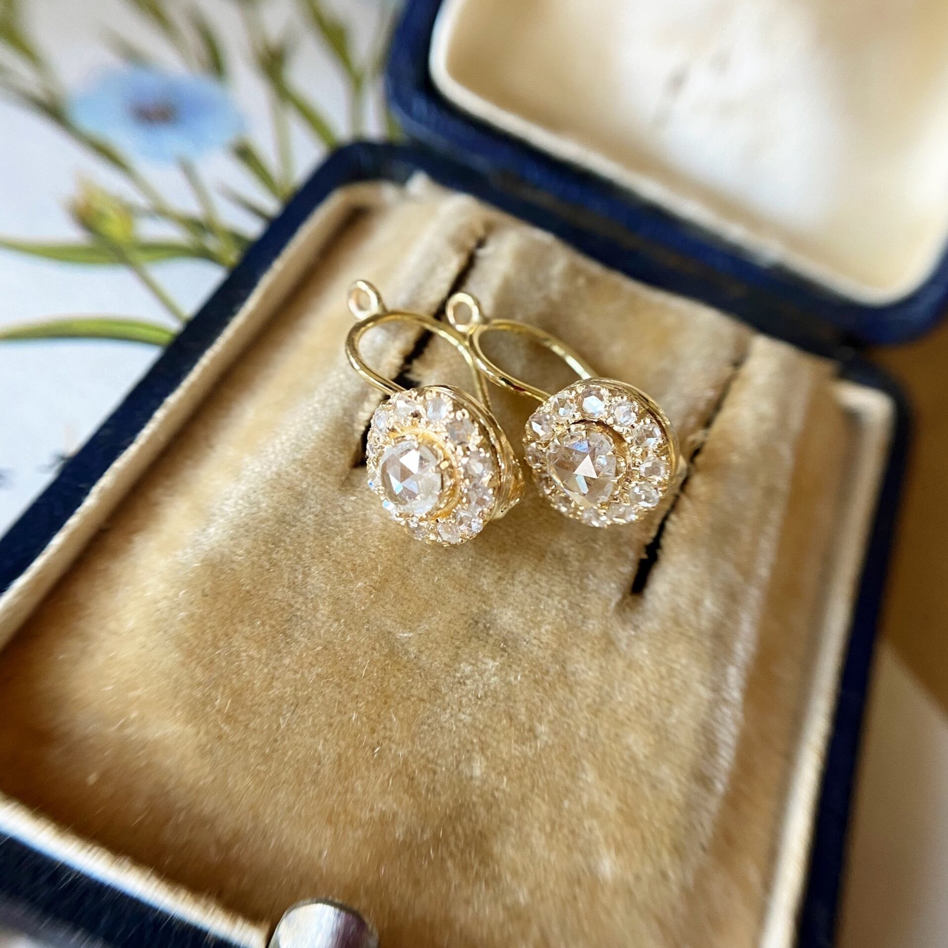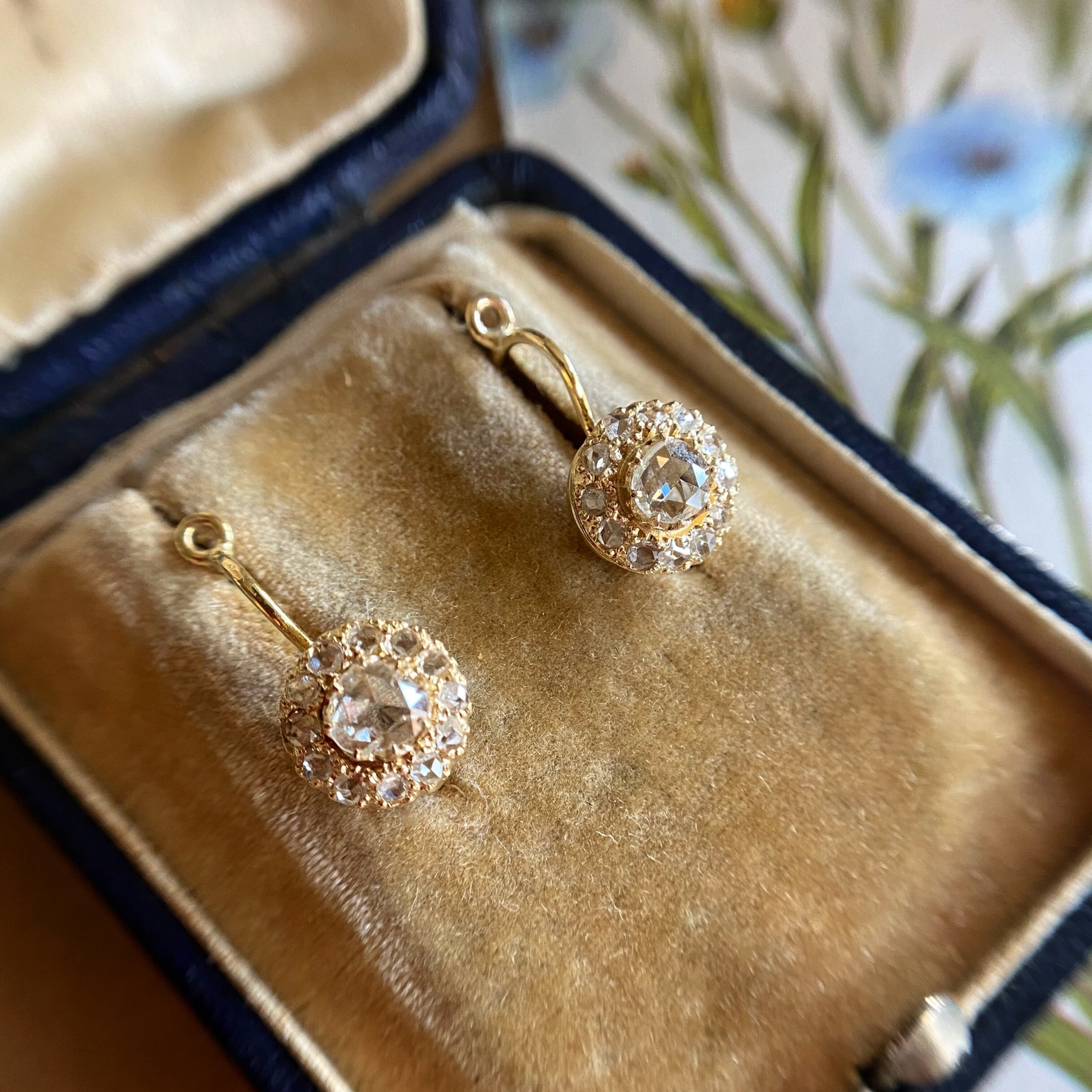中心に収められた澄み渡るような瑞々しいダイヤモンド!花びらには一枚一枚まるで原石のような荒削りのローズカットダイヤモンドが12石丁寧に小さな爪にセットされ、中心のまんまるではない少し歪なバンドカットならではのアンティークダイヤモンドらしいシェープのダイヤモンドと共鳴しそれらが光の矢を放ち、お顔周りをより一層明るくてらして、気持ちまでもポジティブになりそうなアイテムです。