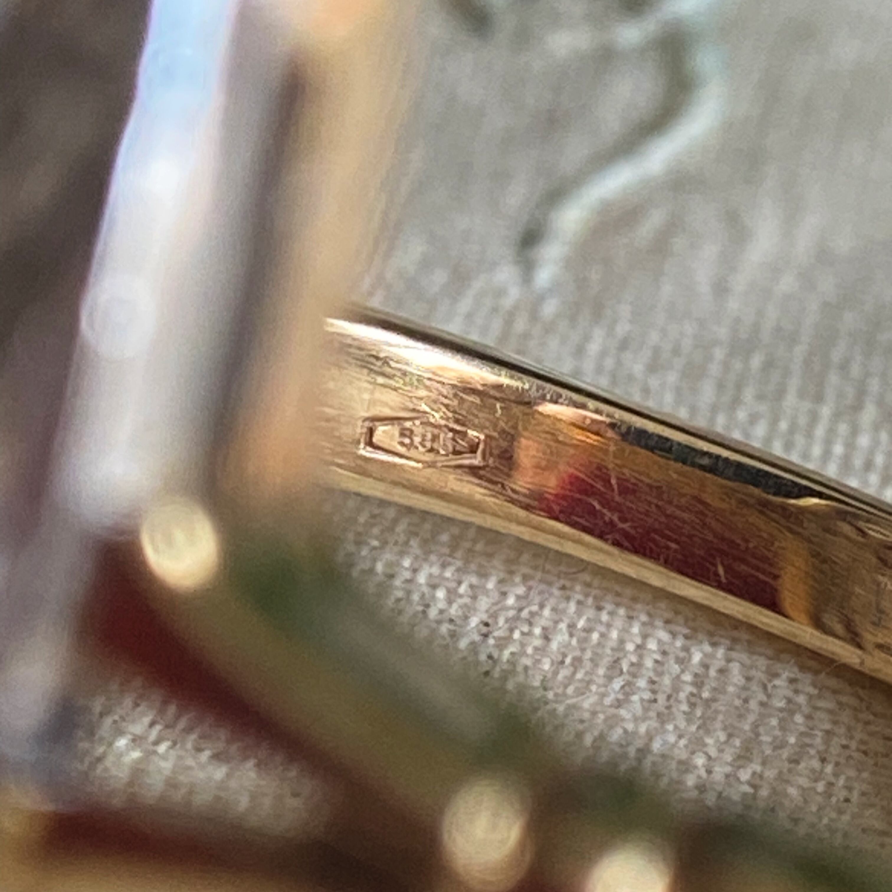 この時代に自由に使えるようになったプラチナをフェイスに使い、そのフェイスに施された無数のミルグレイの粒達、小さなダイヤモンドの輝きと共鳴する繊細な美しさはこの時代特有の"美"だと思います。左右対称の端正なデザインはすっきりとした印象を与え、白色の時代のジュエリーらしいひと品ですね。