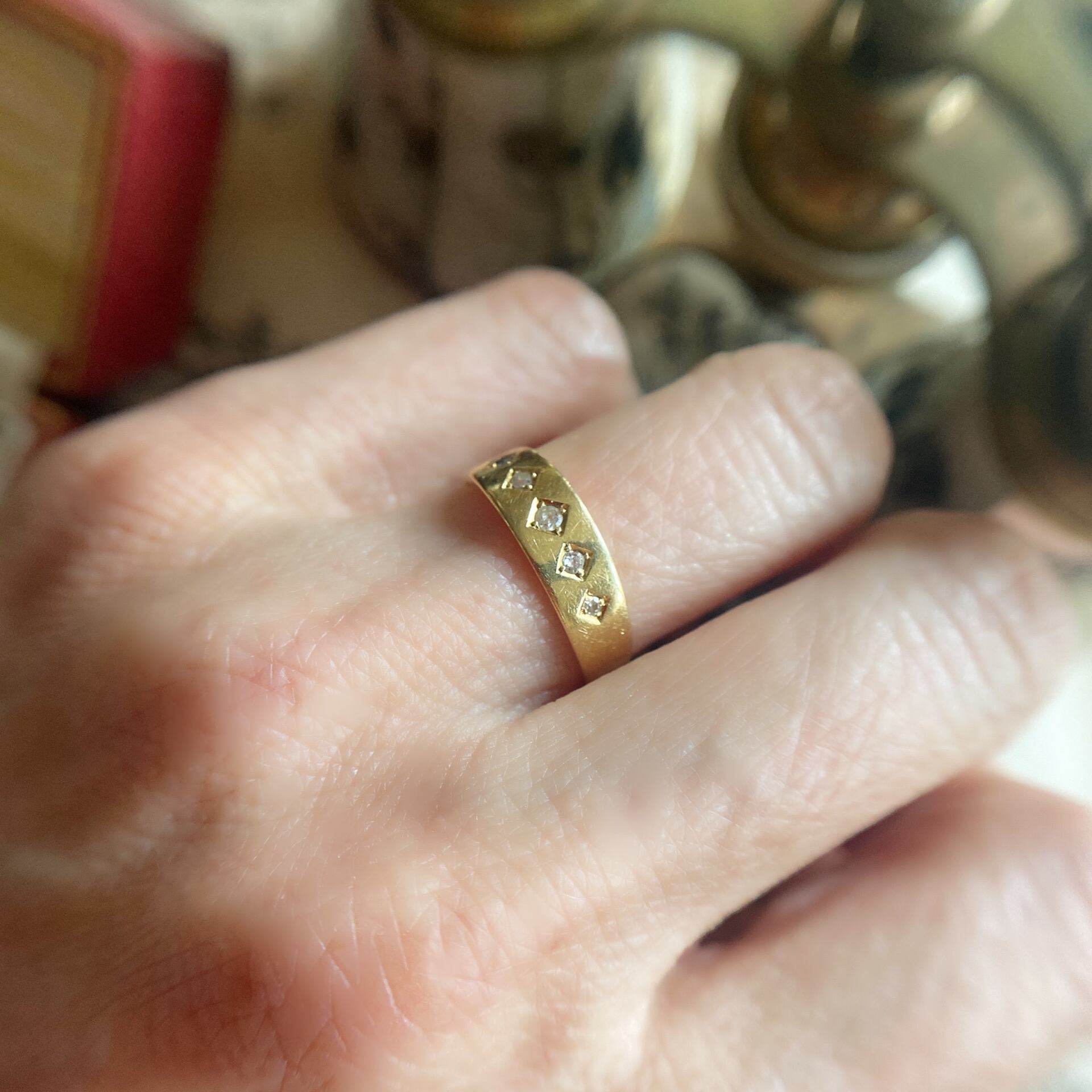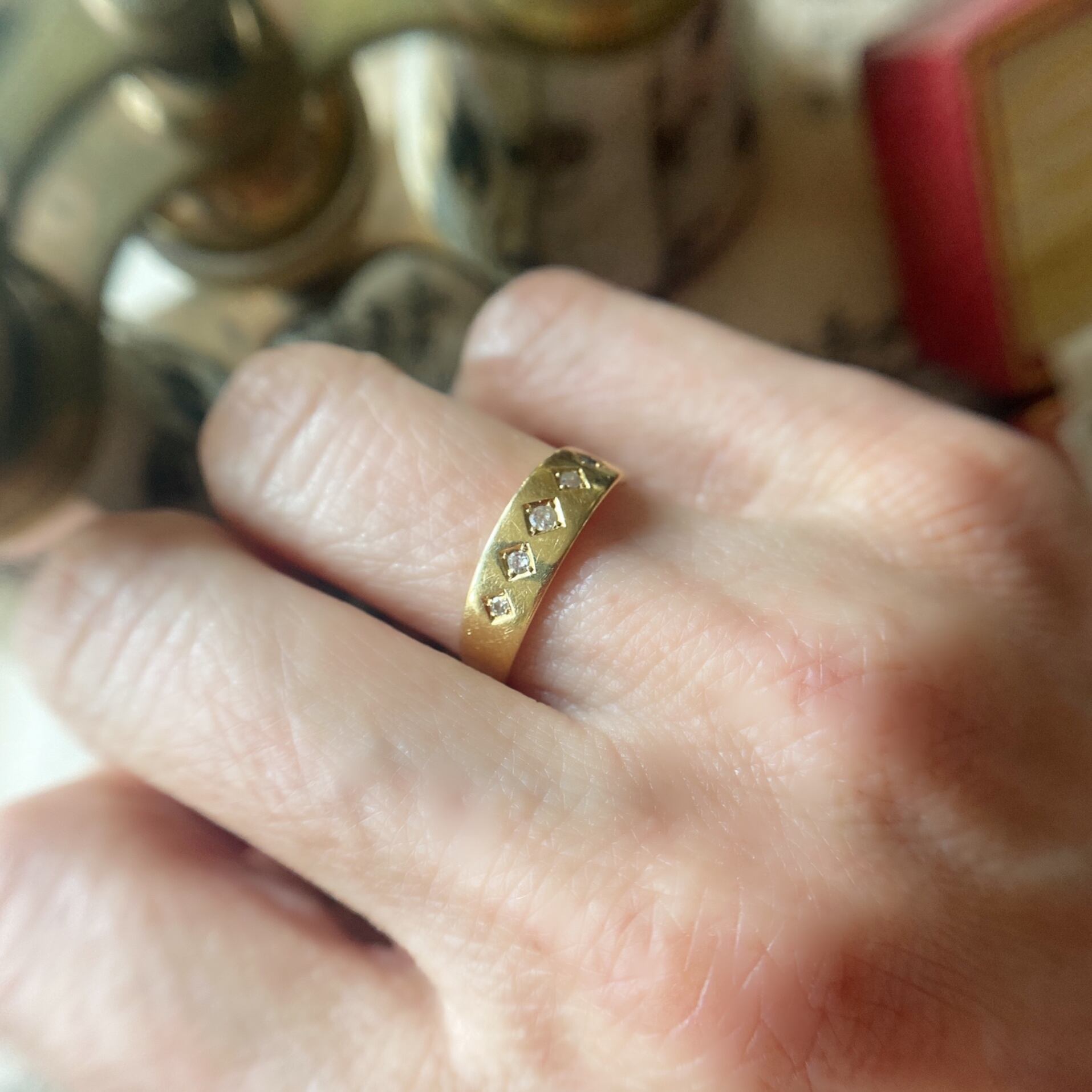 こちら、実は私のコレクションの一つです。かれこれ28年ほど前イギリスに留学中にアンティークショップで購入しました。薬指専用リングとして可愛がっていたのですが、最近歳と共に指だけゴツゴツと魔女の手のように痩せ細り、(お腹まわりや腰回りは痩せるどころか太る一方なのに、なぜなのだろう?)ここ数年は宝石箱に眠ってばかりで、誰かの指を飾り、また活躍させてあげたいと思い、この度は新たなオーナー様を募集する事に致しました。