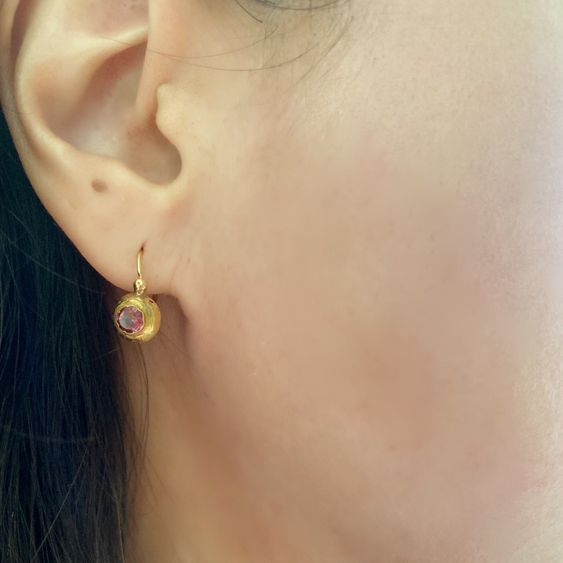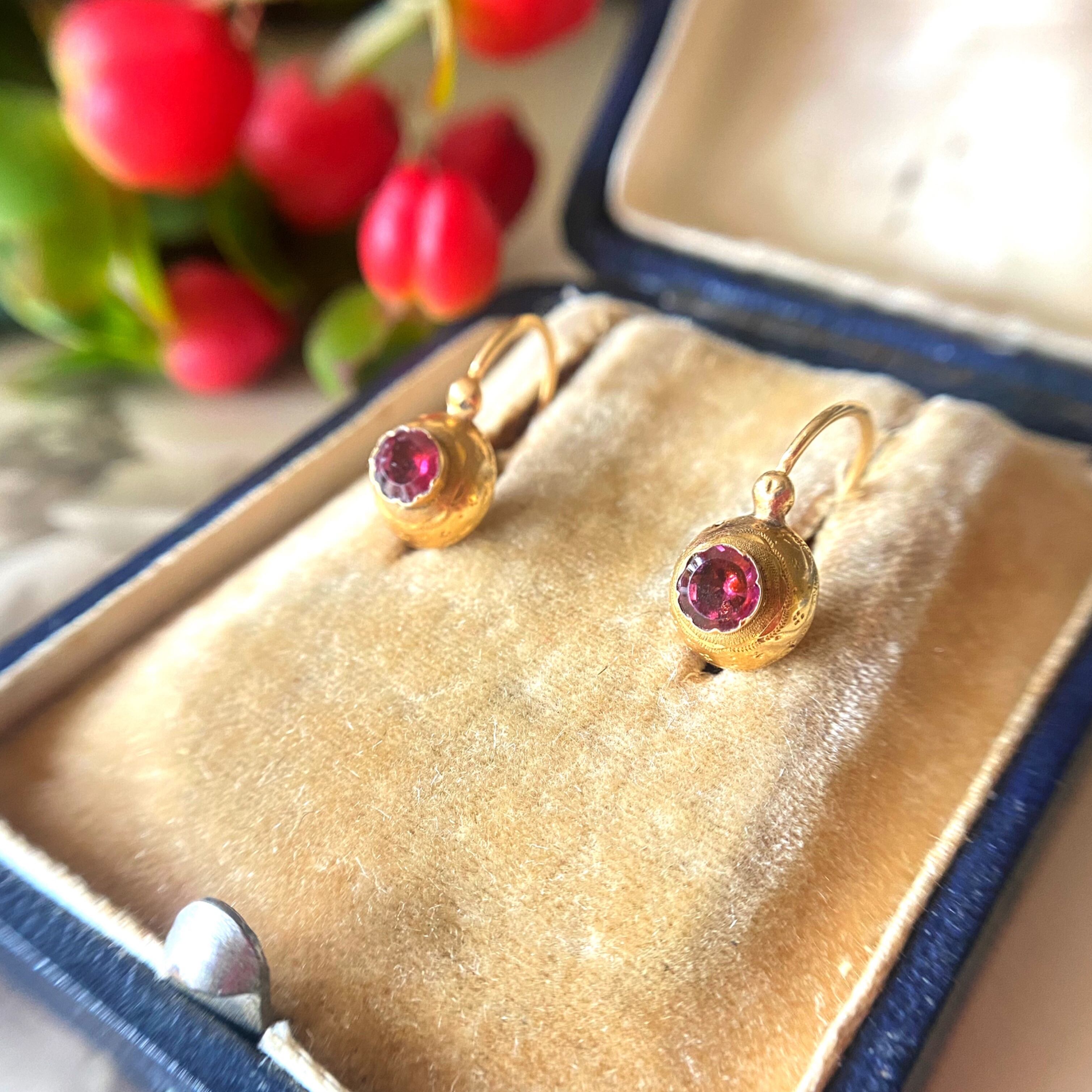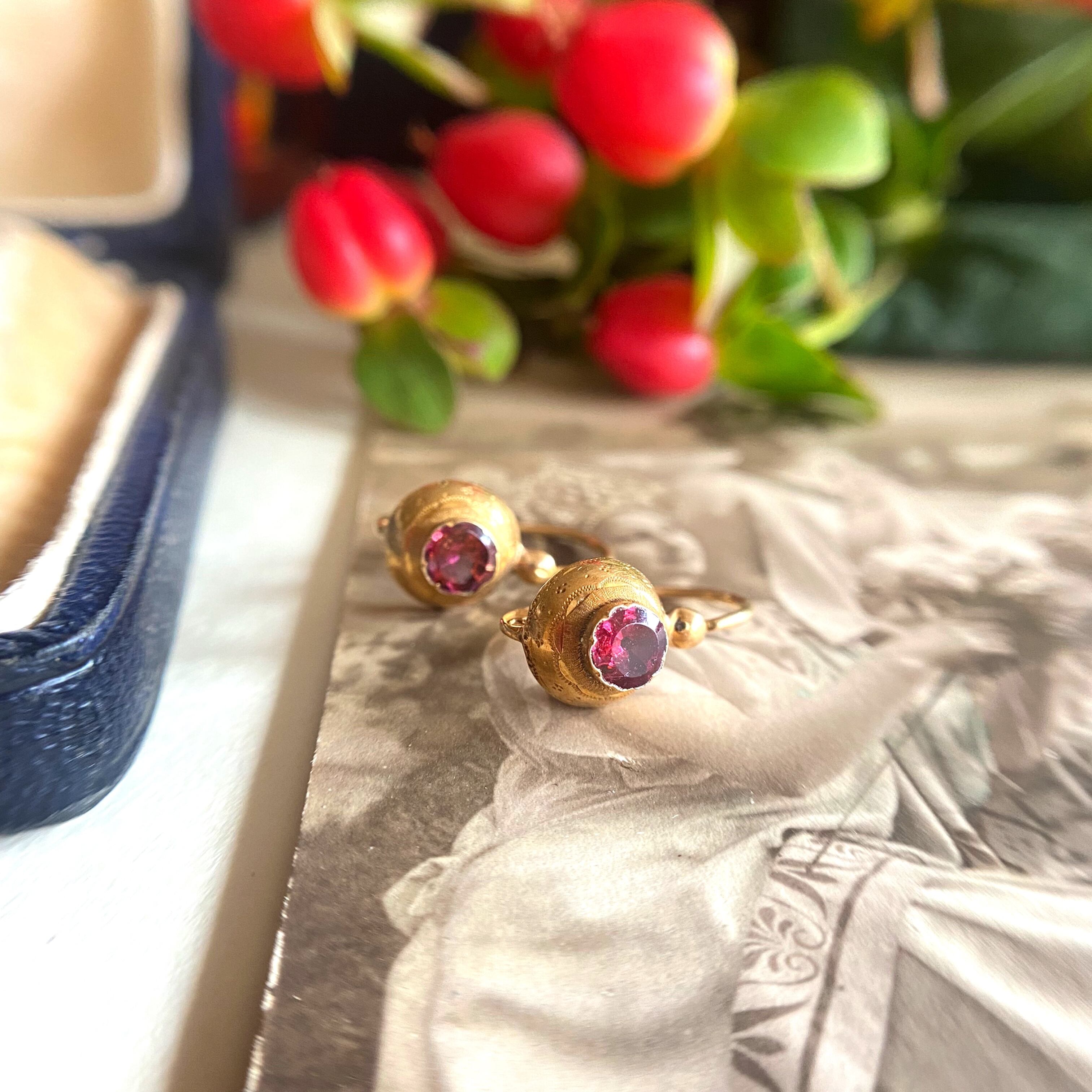 ゴールドの地金に生き生きと赤紫色のガーネットが宝石そのものの美しい色合いをさらに凝縮されるように映える、アンティークらしい深い輝きが格別なピアスです。