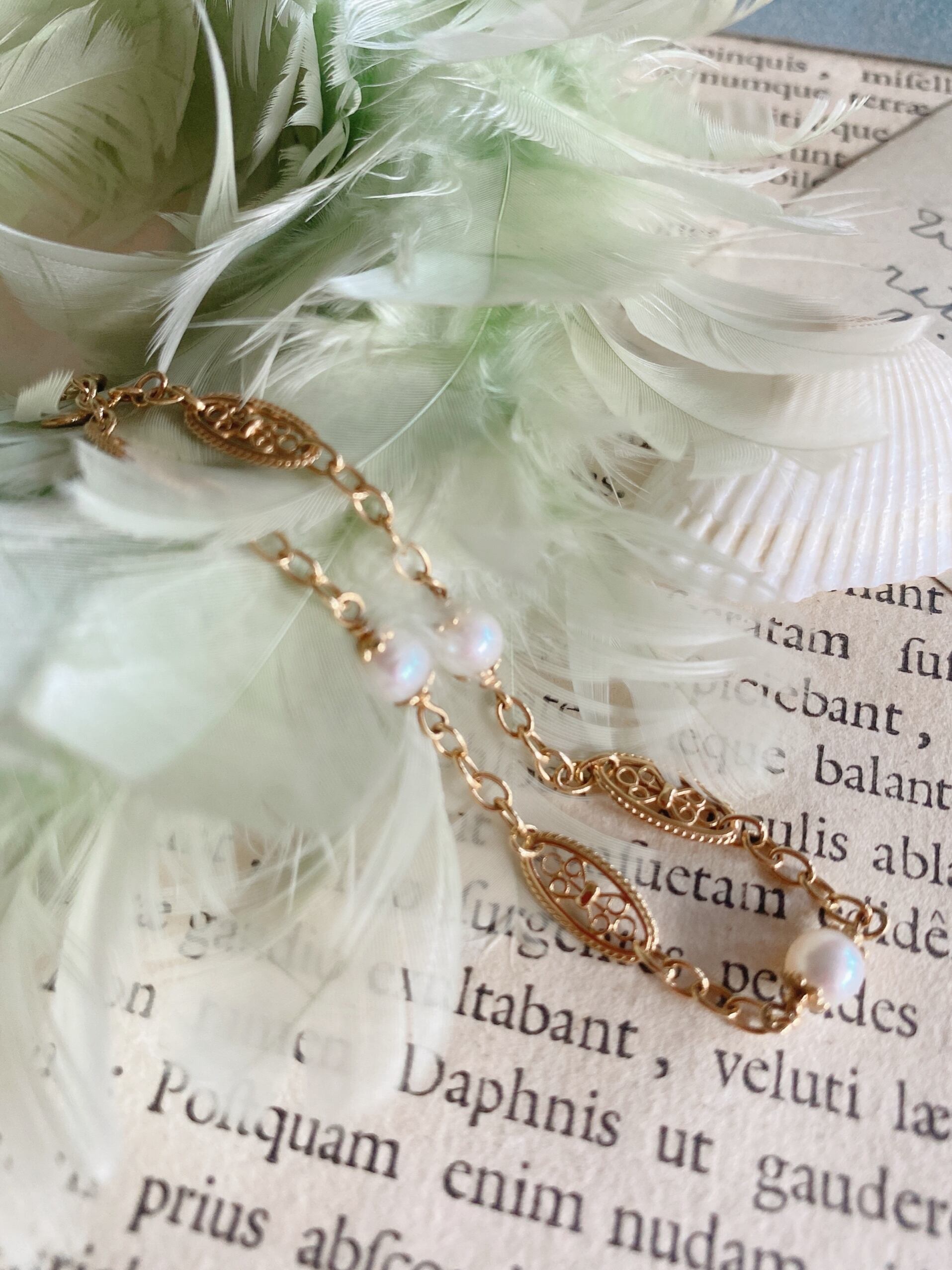 これからの季節に大活躍しそうなフィリグリー(マーユ)とパールのチェーンブレスレットのご紹介です。