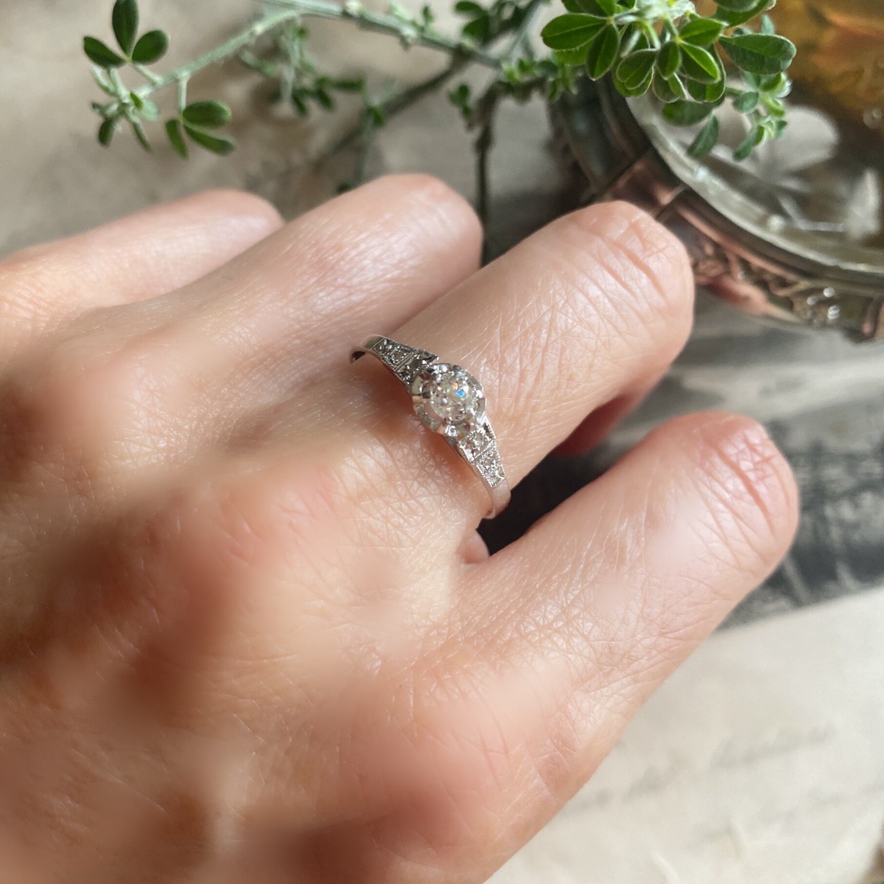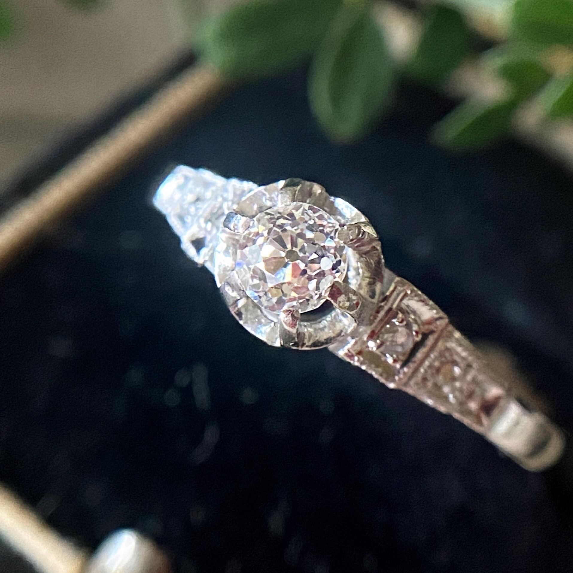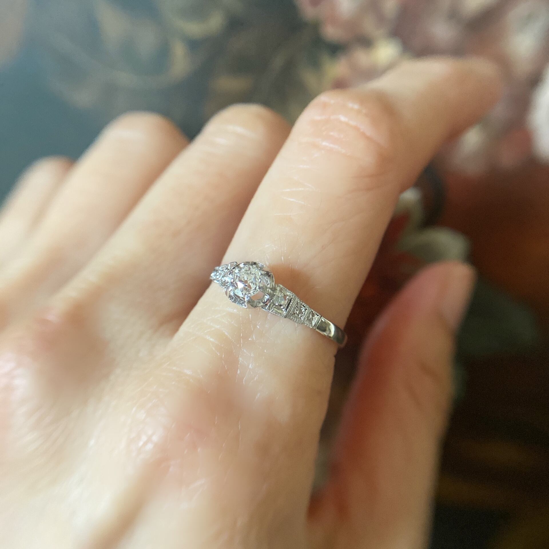 オールドヨーロピアンカットダイヤモンドを中央に、広がりを見せるようにして、ショルダー上部にはローズカットダイヤモンド、下にはシングルカットダイヤモンドが添えられ、その枠には小さな小さなミルグレインが打たれ、その小さな輝きが幾つも重なり、あちらこちらに煌めきを放ちます。カットの違うダイヤモンドだからこその味わいを感じますね。なるほどぉーと思ってしまいます。