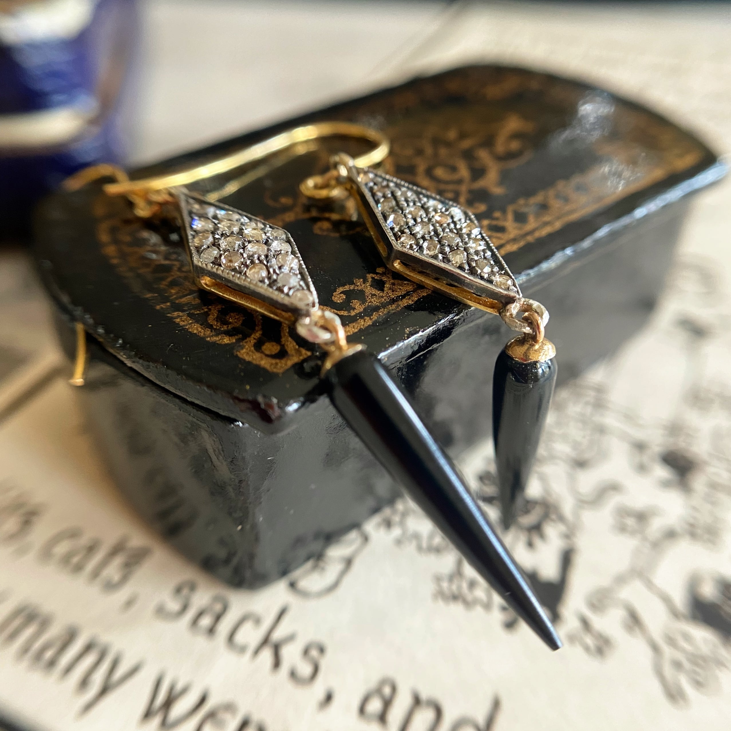 菱形の枠にはリズミカルにミルグレインが打たれて、ダイヤモンドの輝きと共鳴し、耳元が揺れるたびに華やかな煌めきを放ち、視線を下げた先にはスッキリとスリムなシェープのオニキスが輝き、とってもスタイリッシュでカッコいいピアスだなぁとつくづく感じます。