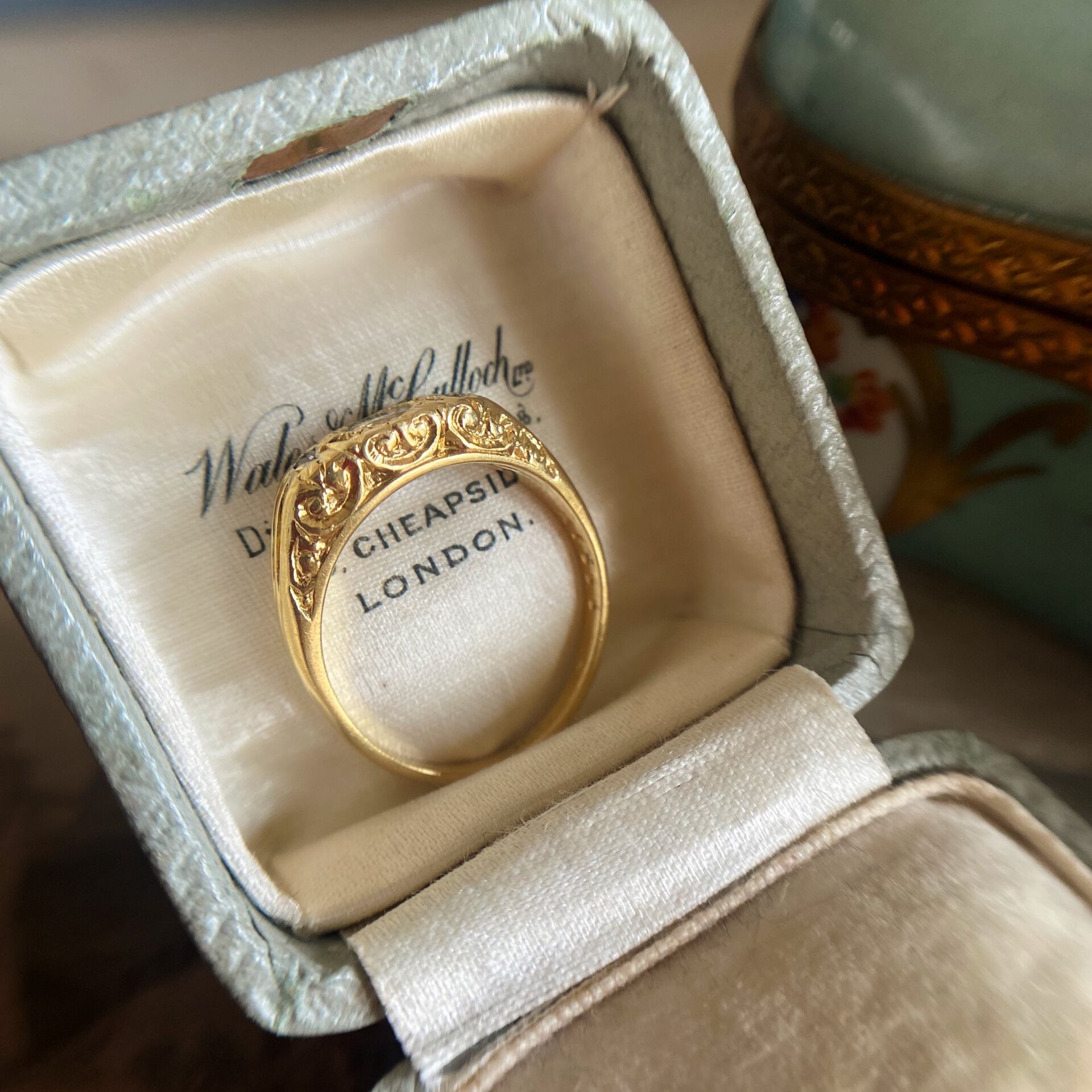 18金イエローゴールドのフェイスのジュエルの周りに彫られた彫金や台座のロータスつまり睡蓮を表現した彫金など、さりげない存在のリングですが、じっくりと眺めると、見どころ満載で、100年以上生き抜いたリングと共に更なる年月を過ごしてみたくなるようなひと品に思います。