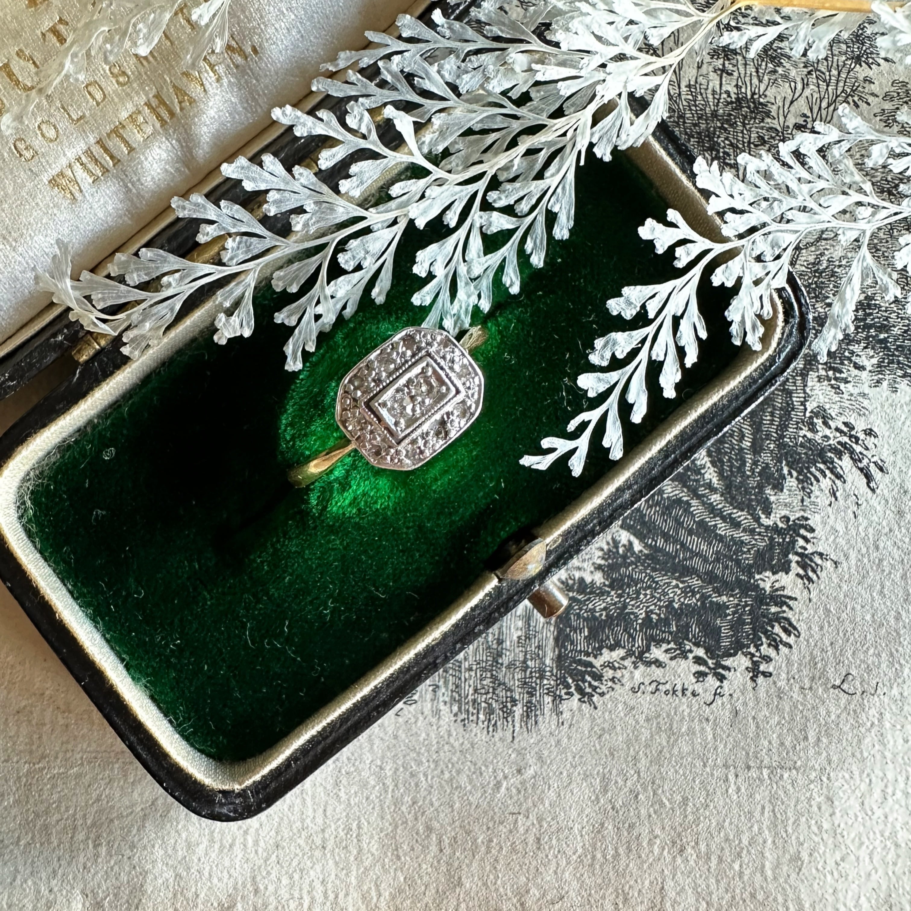 こちらのリング、エドワーディアン時代のジュエリーの細かいディテールとアールデコの幾何学的な八角形が組み合わされたリングですが、フェイス中心の長方形部分の周りはさりげなく透し彫りが施され、コンマ何ミリの世界ですが、ここに透かしがほどこされているかないかではリングの印象が全くちがい、この手間のお陰で軽やかさが生まれてます。また、ダイヤモンドが止められた爪もミルグレインの様に粒状の模様を掘り込む様にしている為、小さなシングルカットダイヤモンドがミルグレインの模様と重なることで、ダイヤモンドがより輝きを増し、エレガントで華やかな印象を与えます。