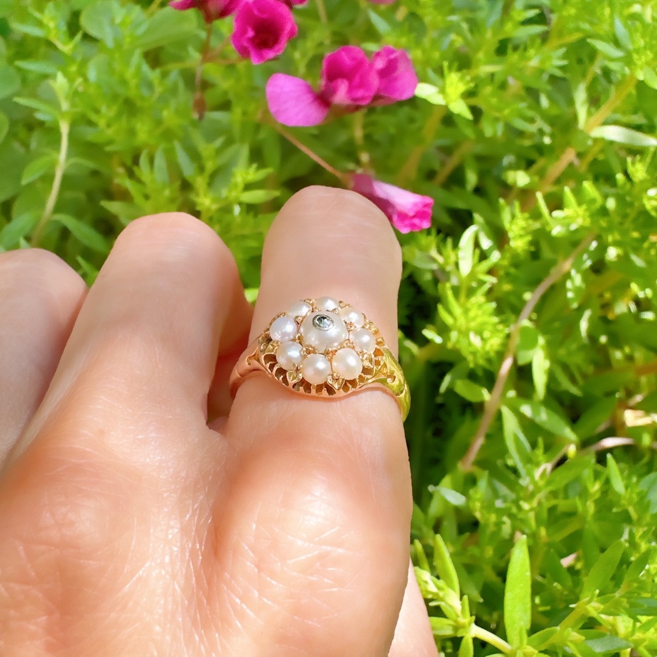 つややかなパールの花びらが8枚と、花芯のひとまわり大きなパールには小さなダイヤモンドが止められていて、まるで朝露に濡れたお花のように、指先に咲き誇るヴィクトリアンらしいひと品が届きました。