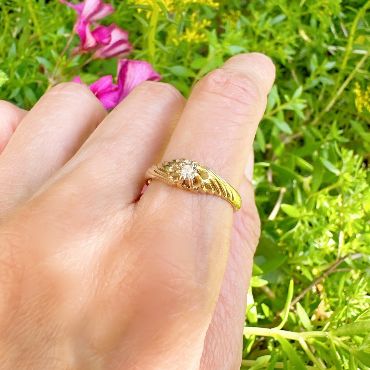 シャンクの左右から植物の芽生えを表現しているかのような押し寄せるツイストに持ち上げられるようにして上がったフェイスに佇むようにして、小さなオールドカットダイヤモンドが添えられた、時間を超えて継承された美しいストーリーを語っているかのようなリングがやってきました。
