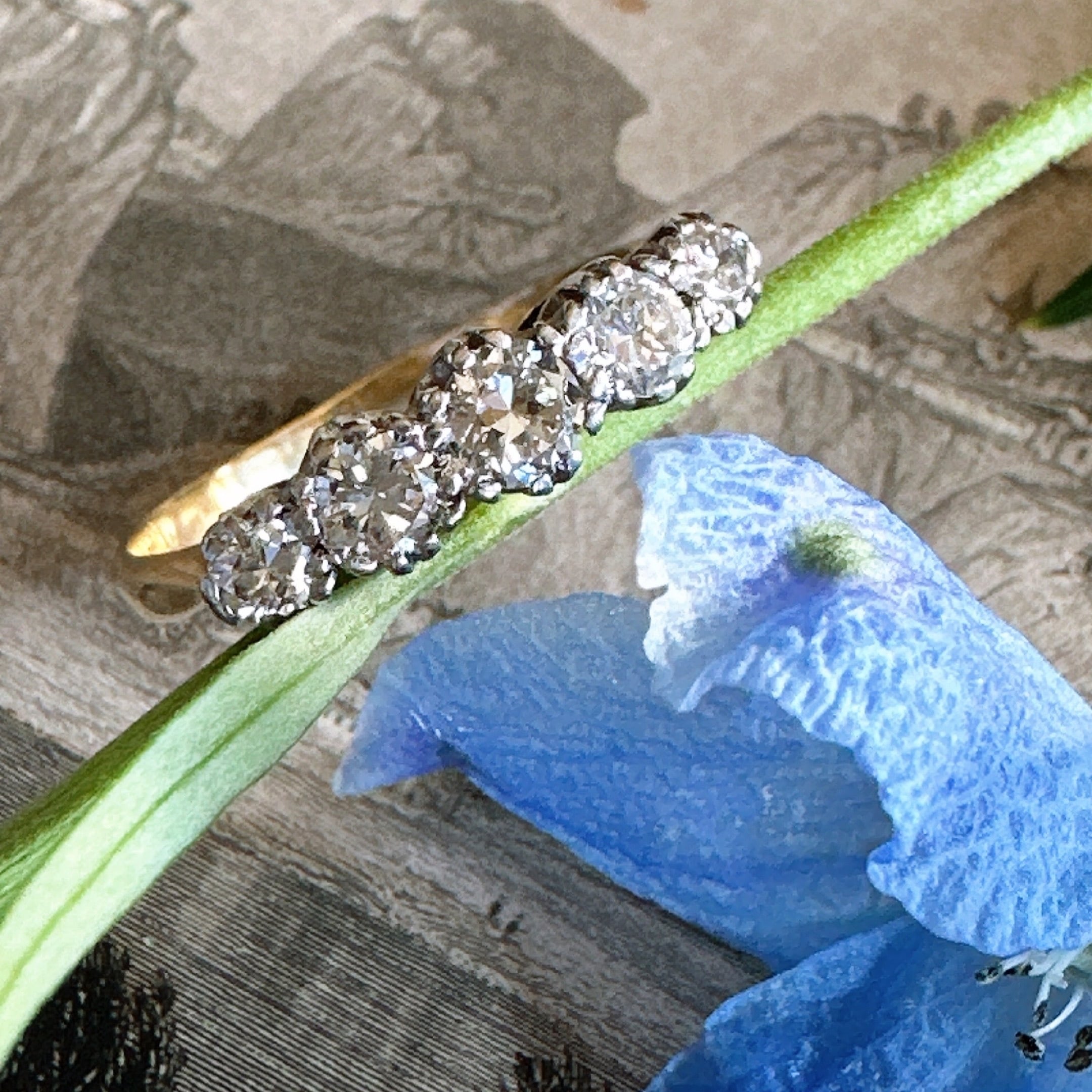ダイヤモンドはオールドヨーロピアンカットからブリリアントカットに向かっていく端境期の物らしく、オールドヨーロピアンカットのようにテーブル面が小さくとも、キュレットは点描のように極小で、典型的なオールドヨーロピアンカットとは違い、でもブリリアントカットとも違う、この時代だからこその味わえる不思議なリングかもしれないですね。