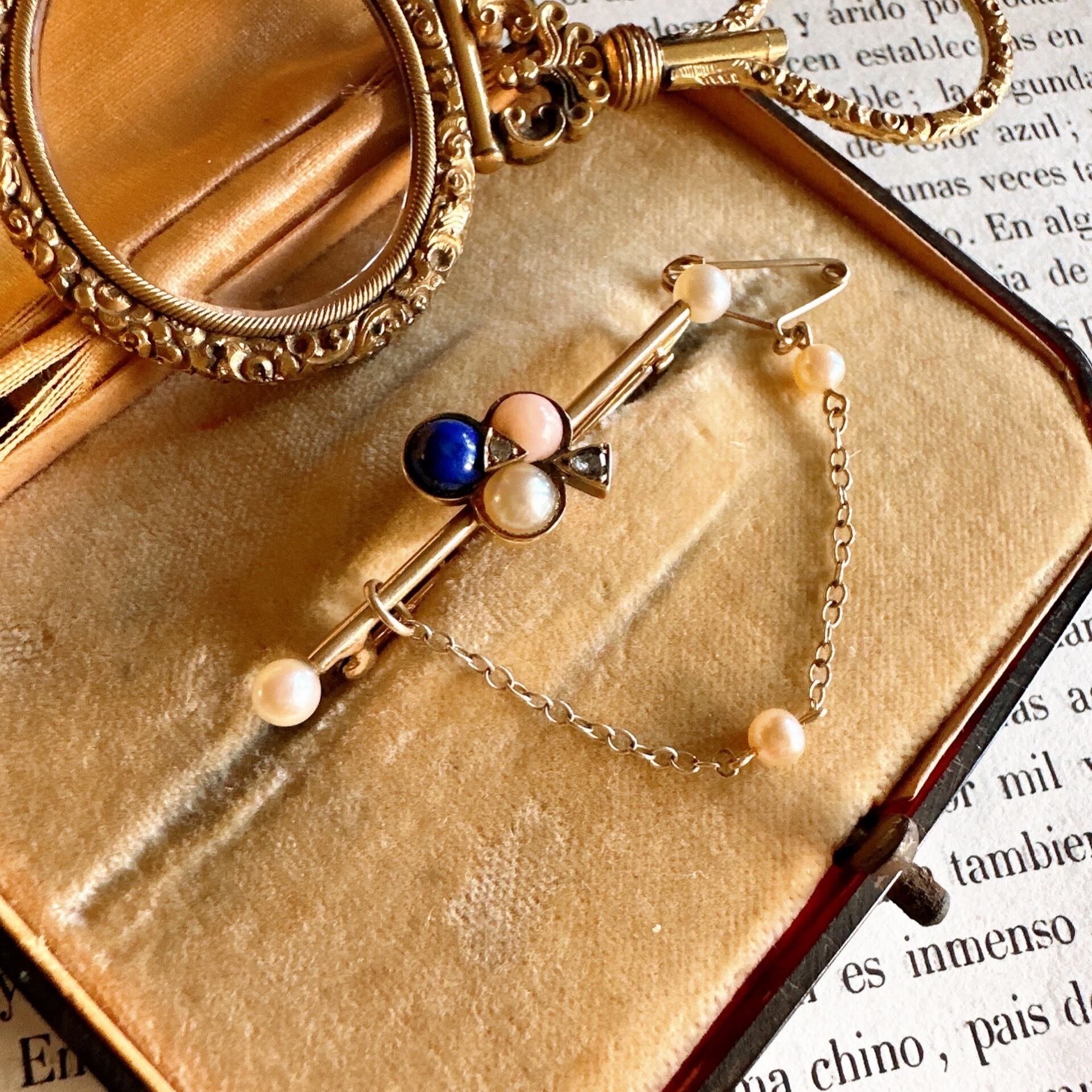 トランプのクローバーモチーフを華やかに演出したとっておきのひと品は、クローバーの葉の部分には、真っ青のラピスラズリ、優しい色合いの珊瑚、そして上品な輝きを放つパールがセットされています。これらの宝石が、ブローチに独自の魅力と深みを与え、花芯と茎には、小さな輝きを放つローズカットダイヤモンドが巧みにあしらわれています。茎のダイヤモンドは雫型のローズカットがセットされていて、ルーペでみないとわからない部分にもこだわりを感じますね。