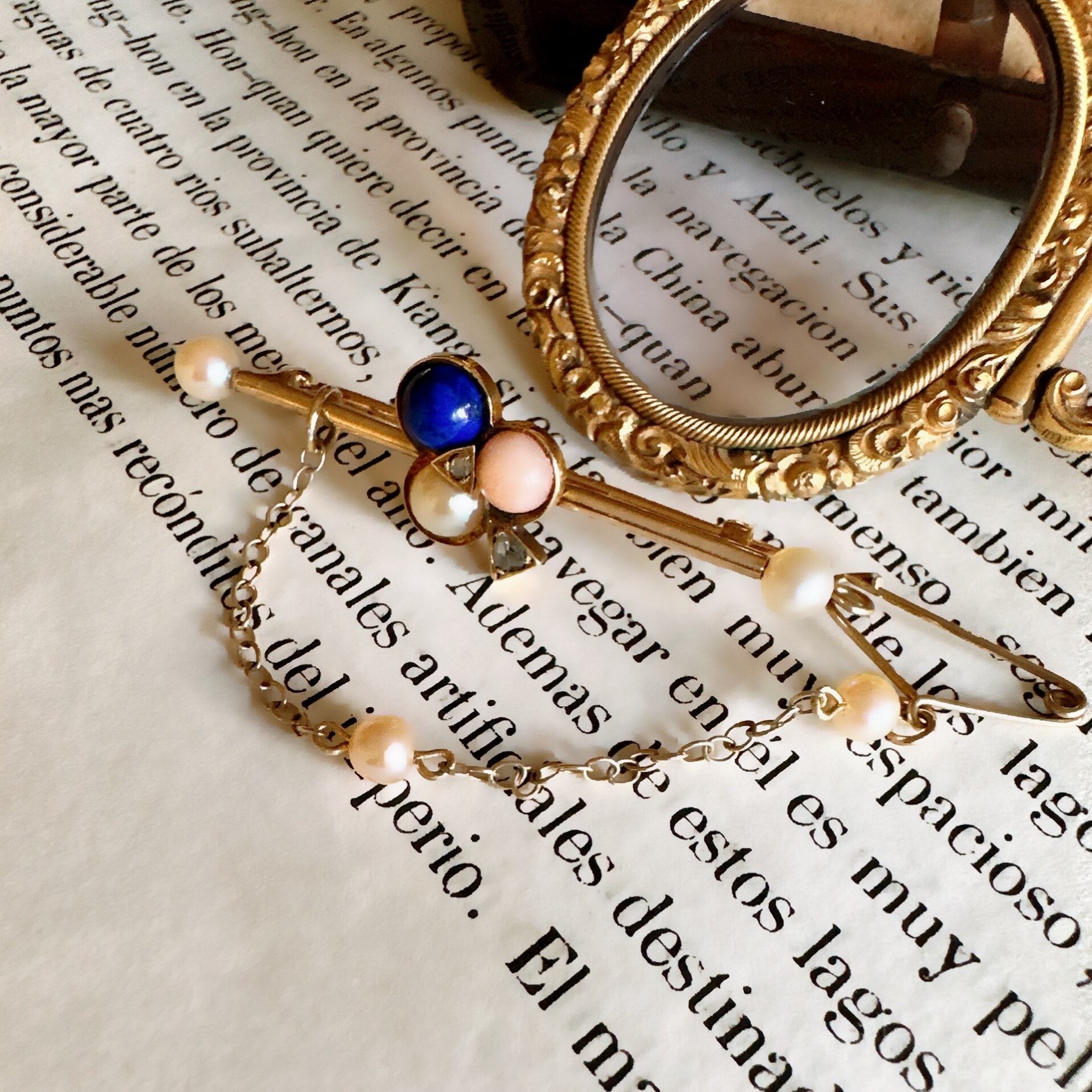 バーの両端、そしてセーフティーチェーンにまで上品さを演出するパールが優雅に配されています。パールはそのデザインに繊細なアクセントを与え、ブローチ全体の美しさを引き立てていますね。