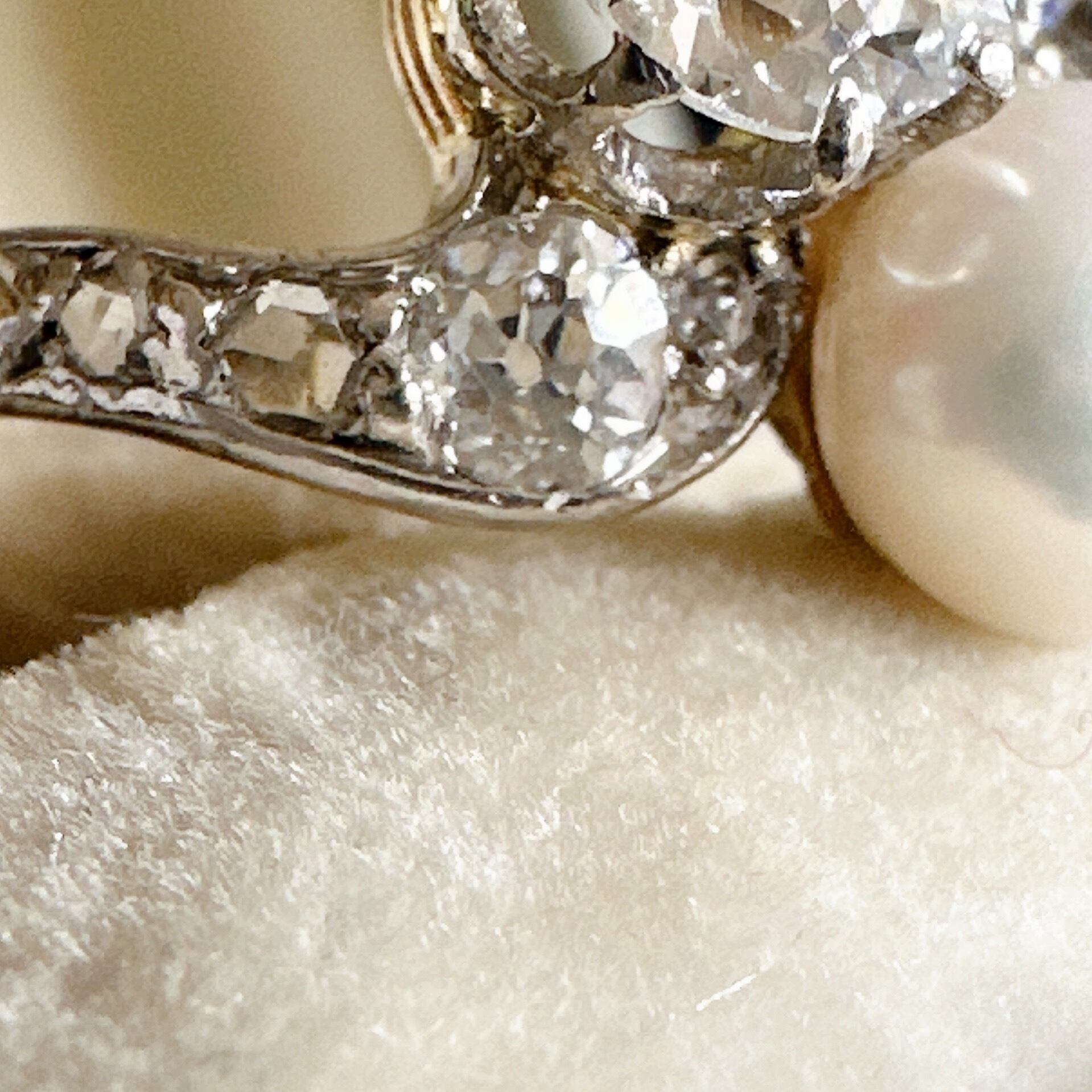 ※ 100年程前の古いお品になります。ダイヤモンドは経年によるアンティーク品特有の微小なスレ、インクルージョンなどルーペで見てわかる程度にございます。カケや目立つキズはございません。時代を考えても全体的にみて状態はとても良好です。