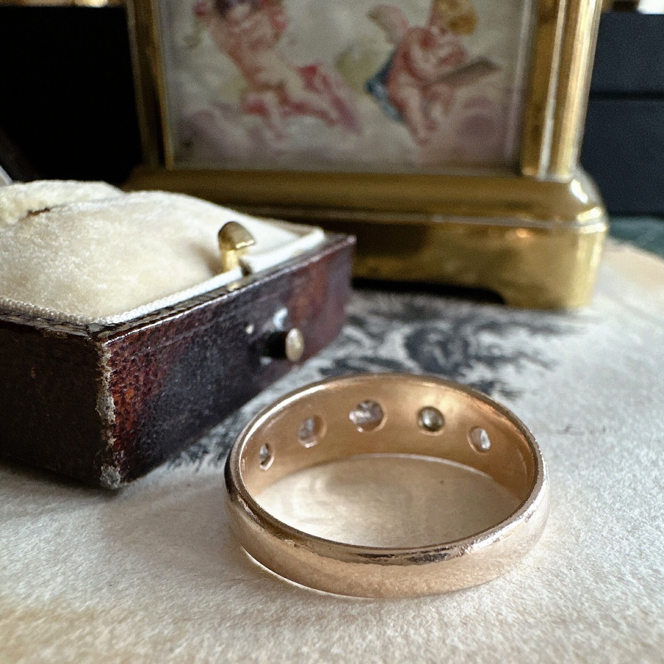 こちらのクッションシェープのオールドマインカットダイヤモンド、5石ともカケのない状態で残っていて、テーブル面が小さく、キュレットがカットされている事も目の良い方ならばわかるかと思います。荒々しいカットがアンティーク好きにはたまらなく感じますね。小さなダイヤモンドですがしっかりとアンティークらしさを感じられるのも嬉しいですね。