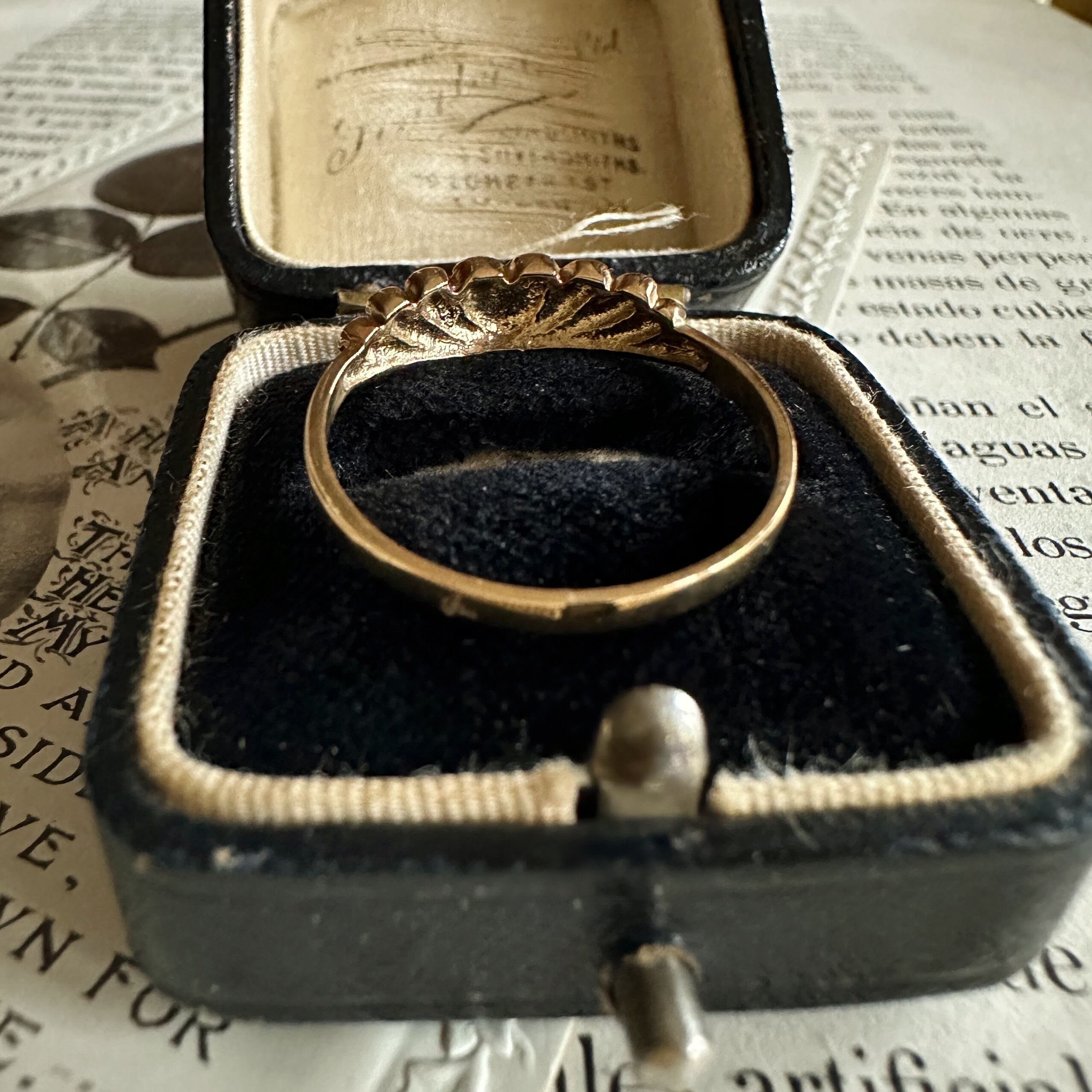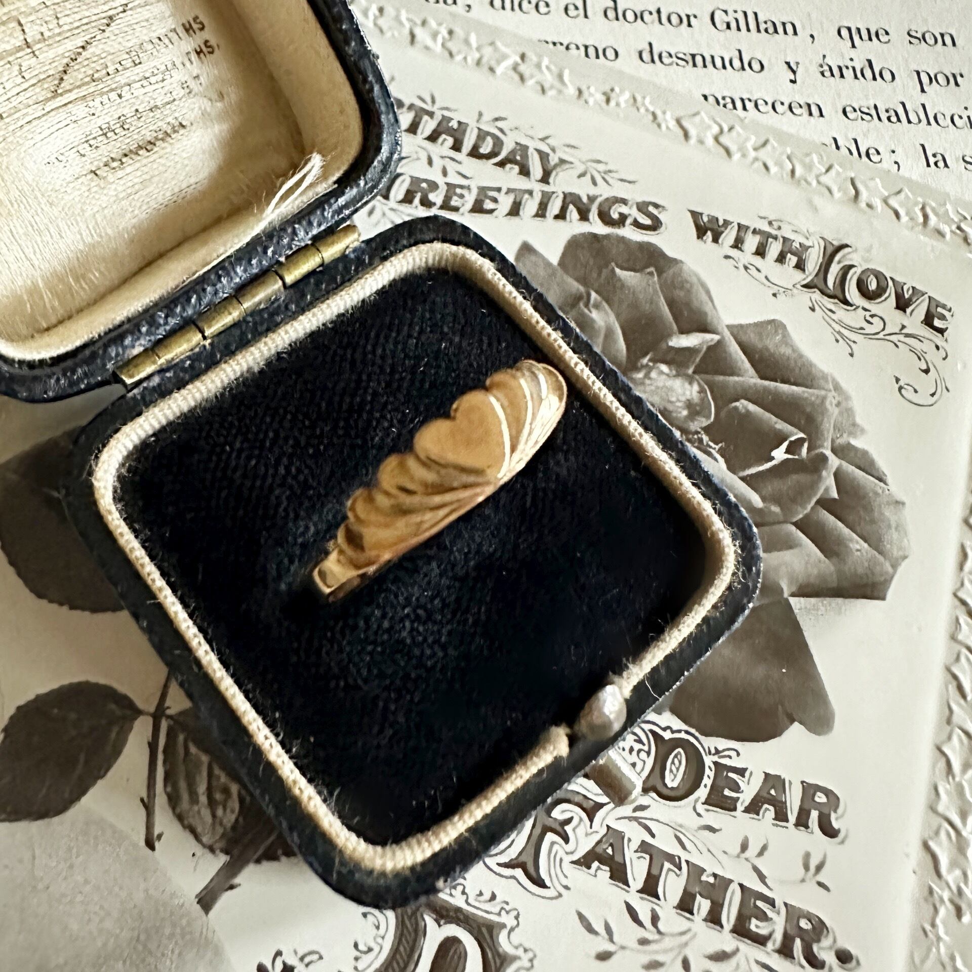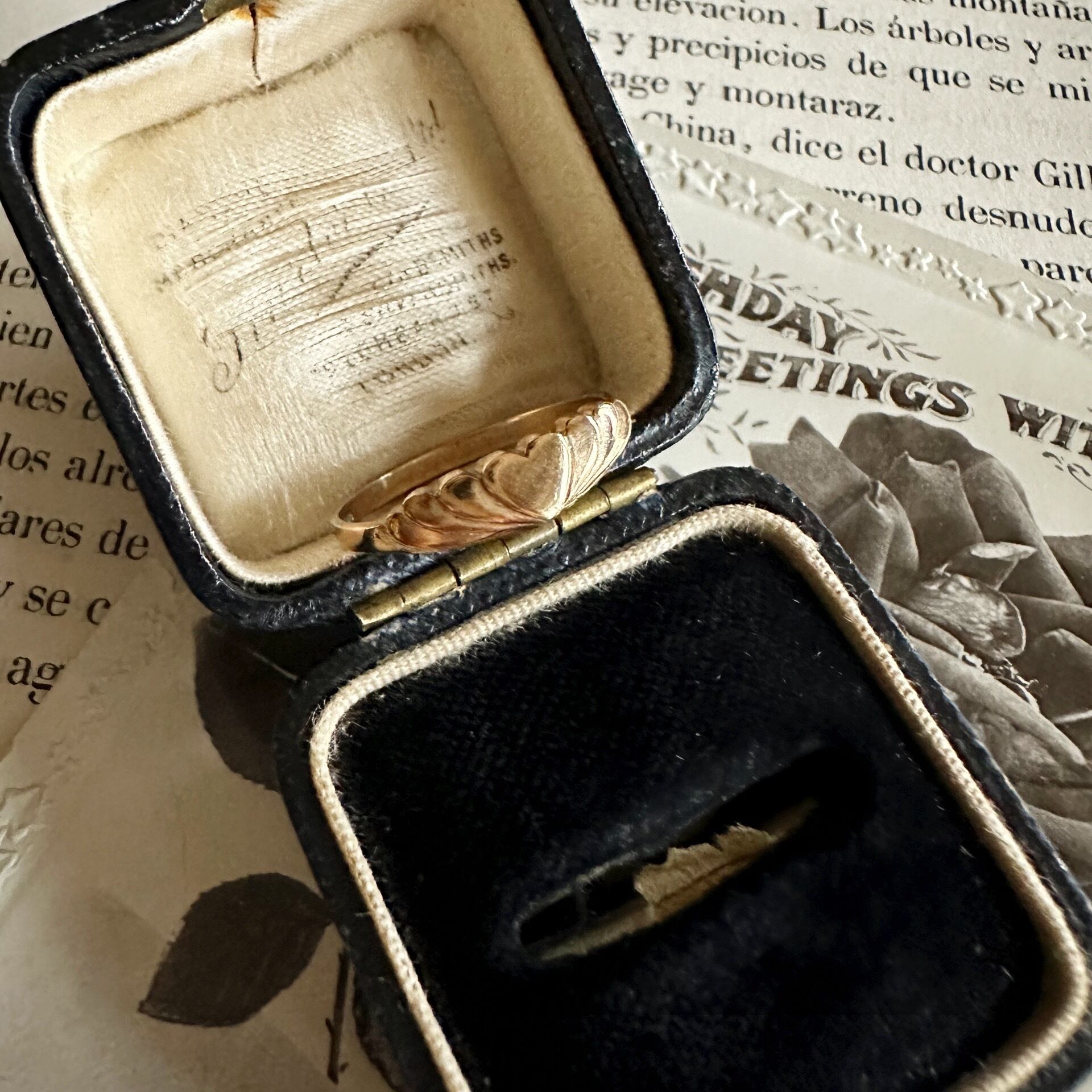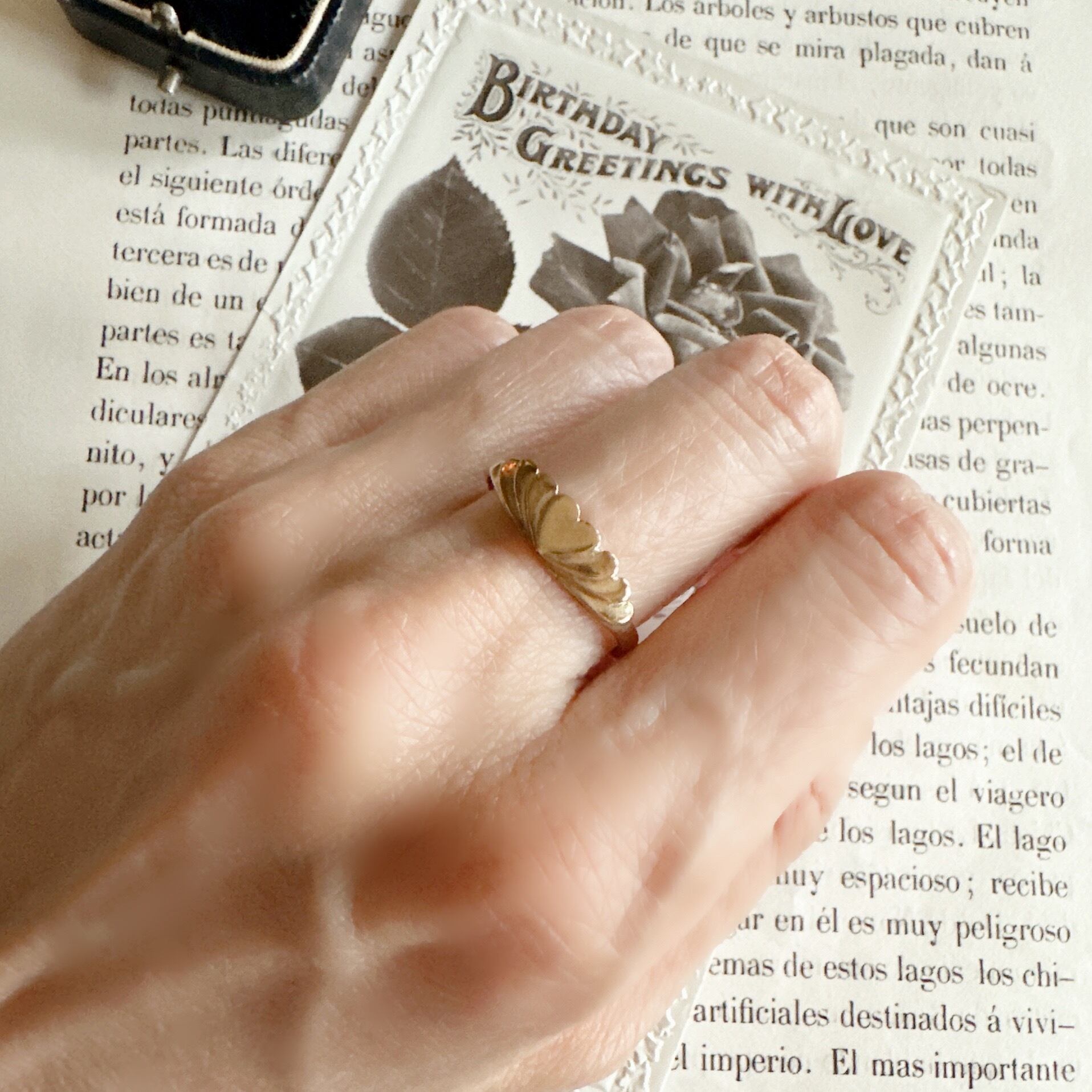 しっとりとしたゴールドの艶感、ドレープのような連なるハートの丸みがとても可愛らしく、滑らかなテクスチャーの中で輝くまろやかな9金ゴールドの輝きはヴィンテージならでの美しさを放ち、とても魅力的なハートリングです。