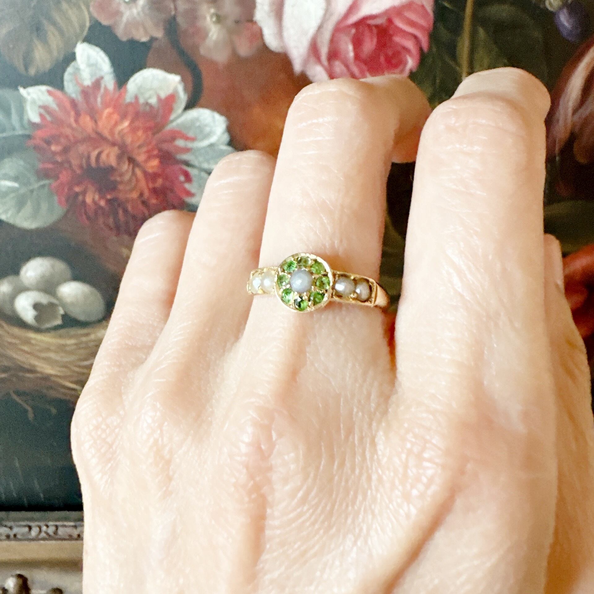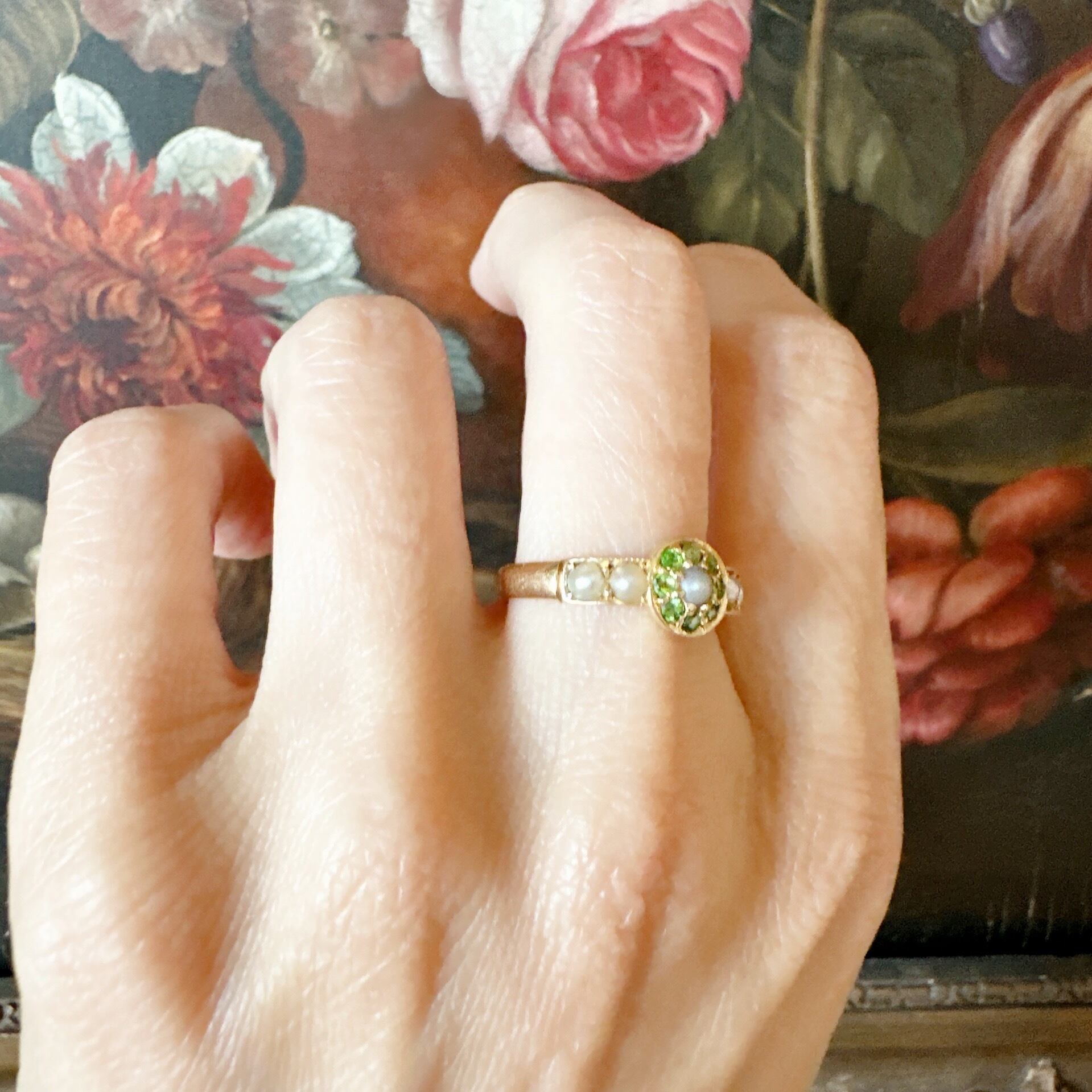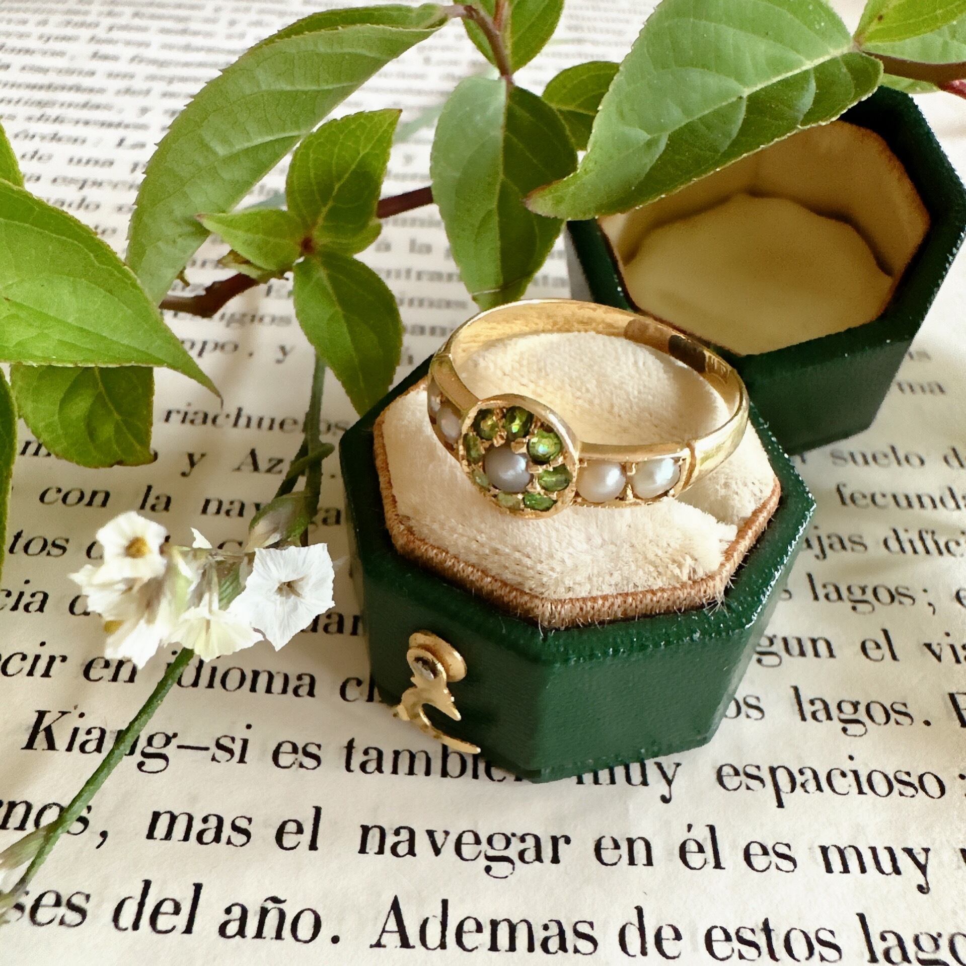 中央には、小さなハーフパールが輝き、周囲のデマントイドガーネットたちとともに、古き時代のエレガンスを感じますね。