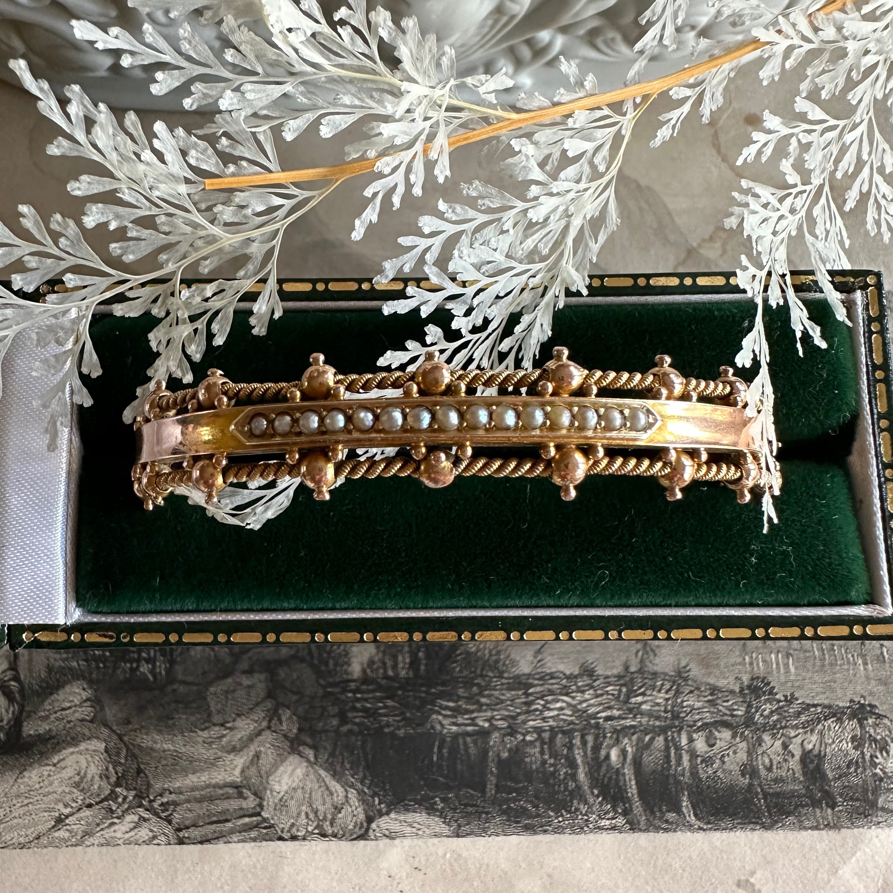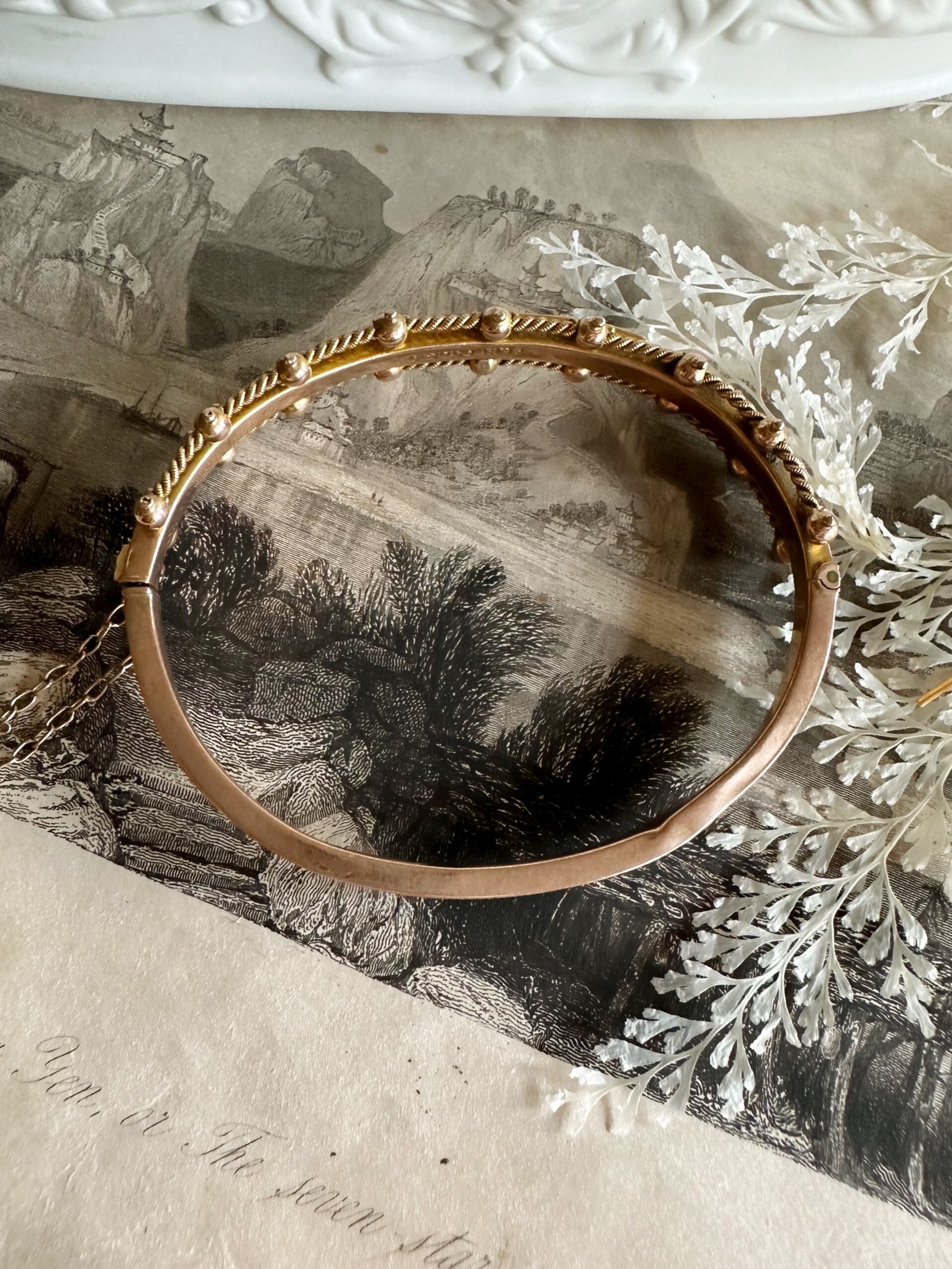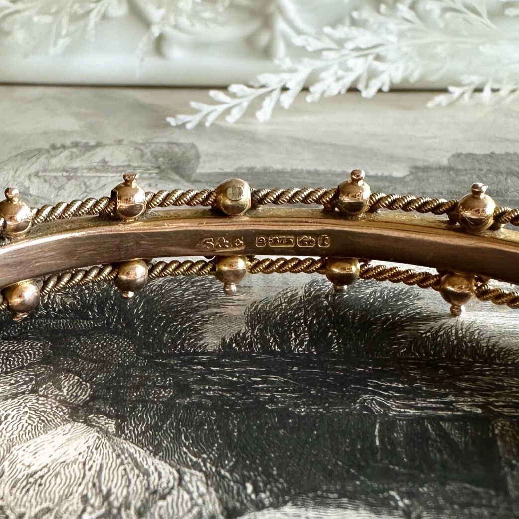 こちらのバングルをご覧頂きますとわかるように、エトルスカンリバイバルヴィクトリアンジュエリーの特徴的な要素は、ゴールドで作られた繊細で緻密な装飾です。1つ1つのパーツを丁寧にロウ付けをして作成され、そのすべてがもちろん手作業です。