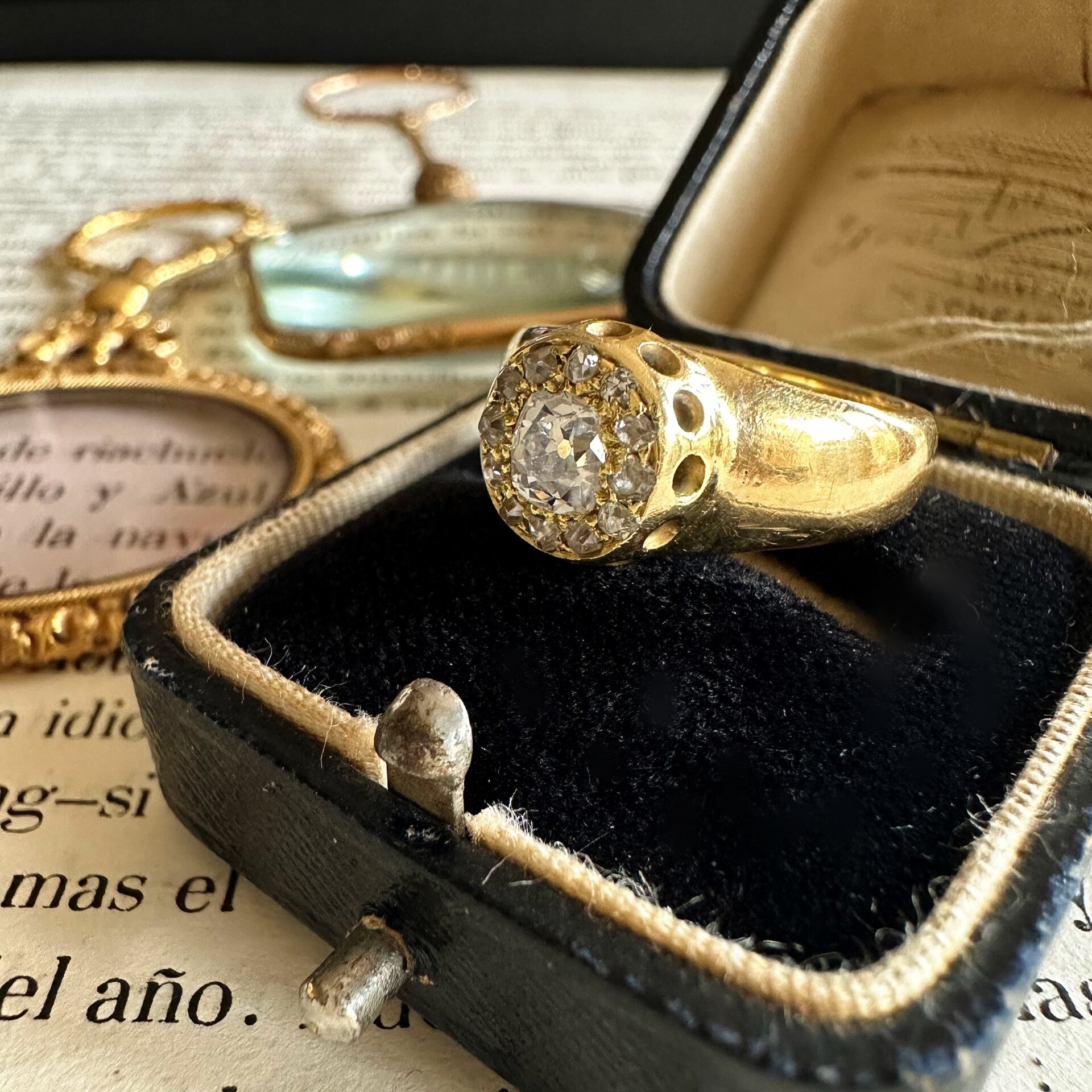 こちらのクラスターリングは通常の物とひと味違い、幅広のゴールドのアームがポイントなのではないでしょうか?ヴィクトリアン時代のクラシックな中にモダンなエレガンスを引き立て、かっこよさを演出してくれています。