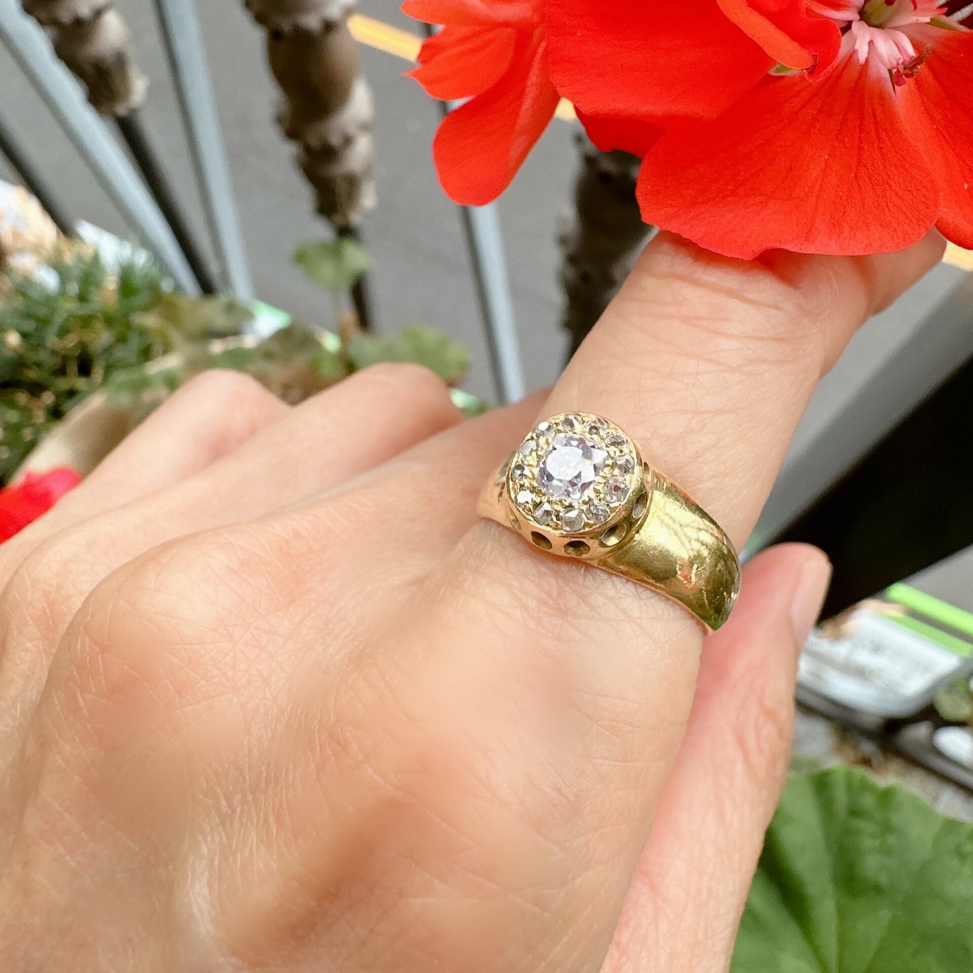 また、オールドマインカットダイヤモンドの魅力もクラスターリングに一層の魅力を与えています。オールドマインカットダイヤモンドは、独自のファイア(光の反射)とブリリアンス(輝き)を持っています。