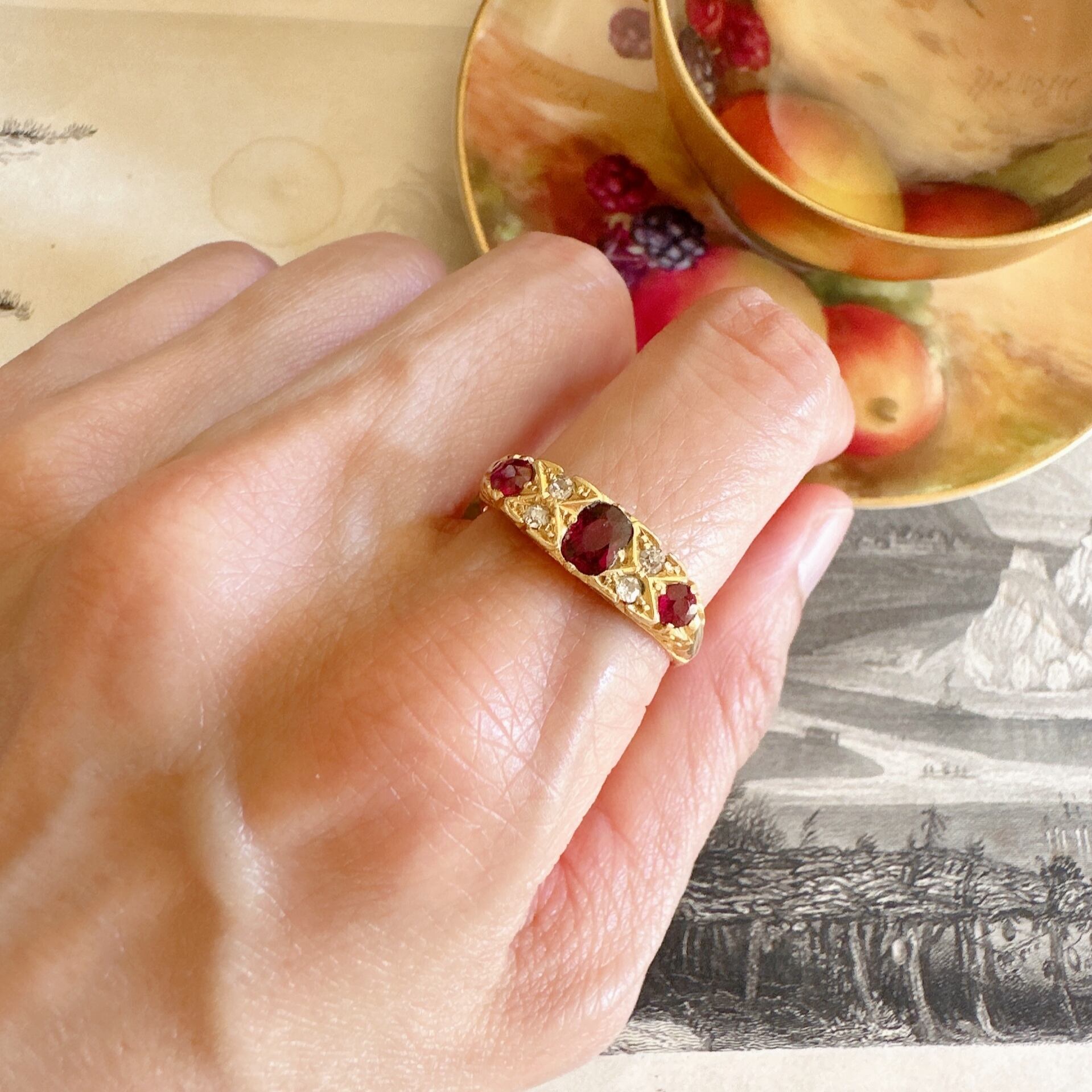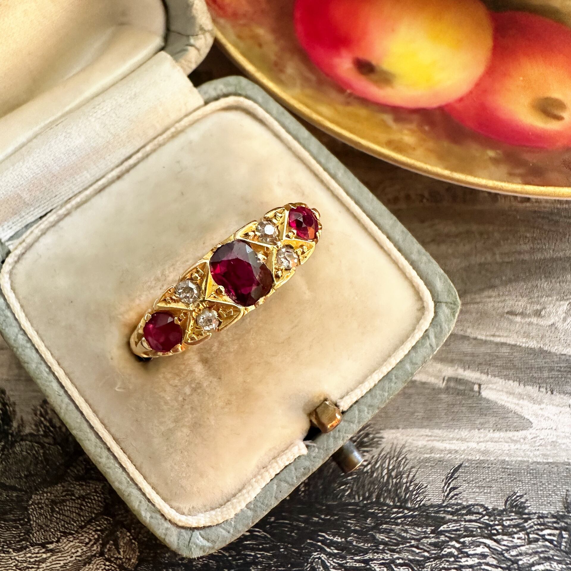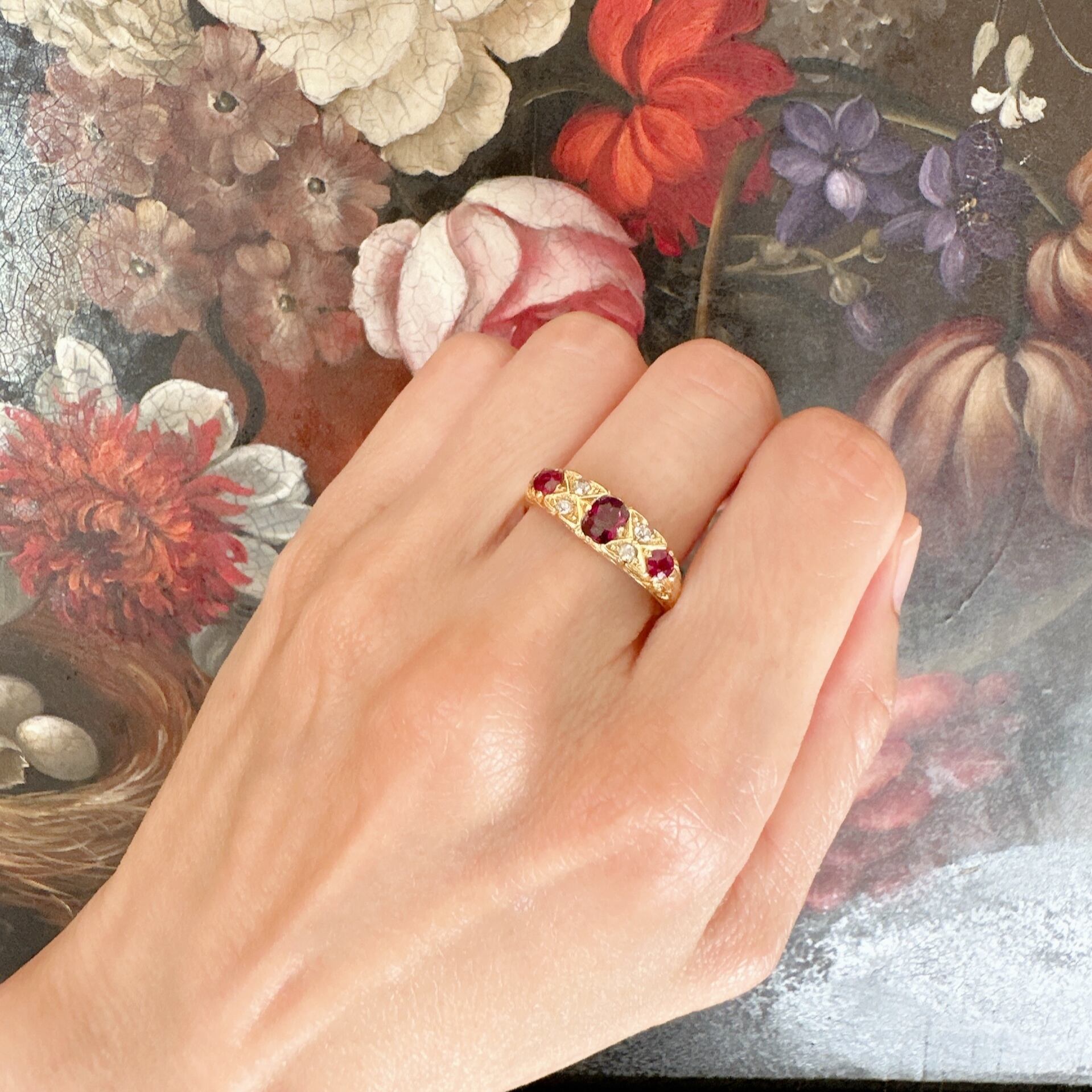鮮やかな赤色は、情熱と愛の象徴として、周囲に優雅な輝きを放ち、ルビーたちの間に配置された小さなオールドシングルカットダイヤモンドが4石輝きを添えています。これらのダイヤモンドは、煌めく光を散りばめながら、リング全体に上品で華やかな輝きを与えてくれています。