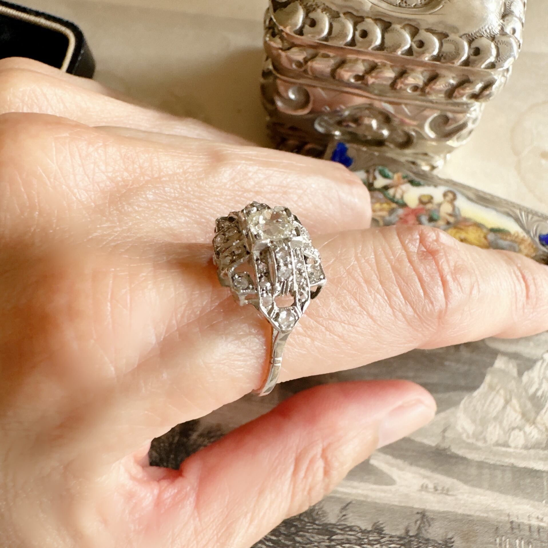 アールデコの幾何学的なクールさが漂いながらも、エドワーディアンの繊細なタッチが見事に融合した、複雑な印象を与えるアールデコリング。