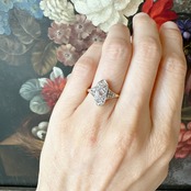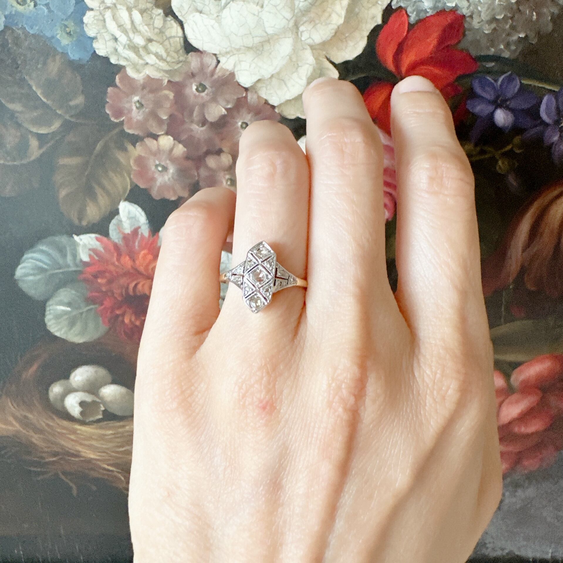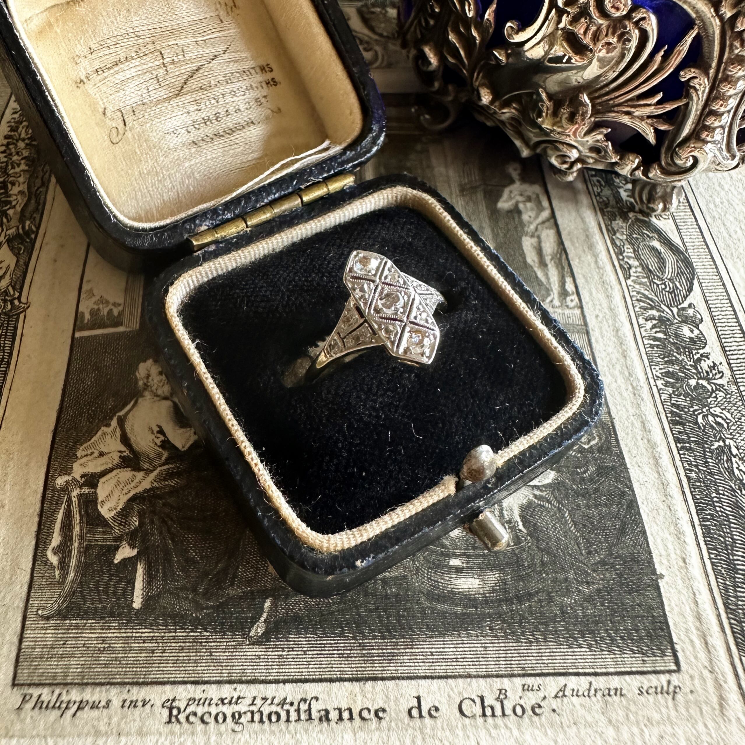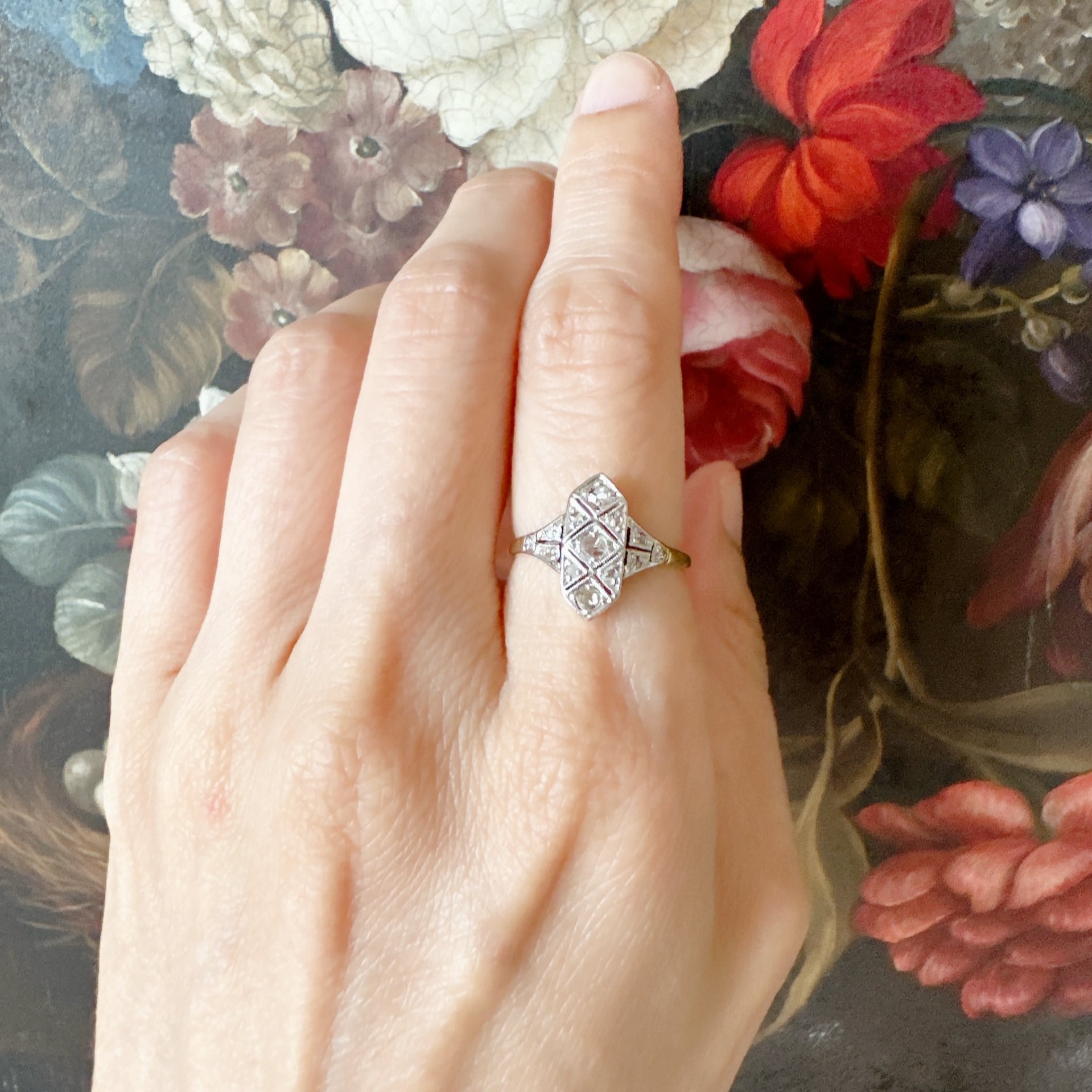 このリングは、その美しいプラチナフェイスとダイヤモンドの輝き、繊細なミルグレンと幾何学的な透し彫り、ベルエポックとアールデコの移行期の魅力を存分に引き出しています。