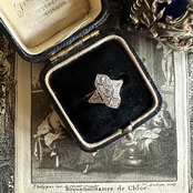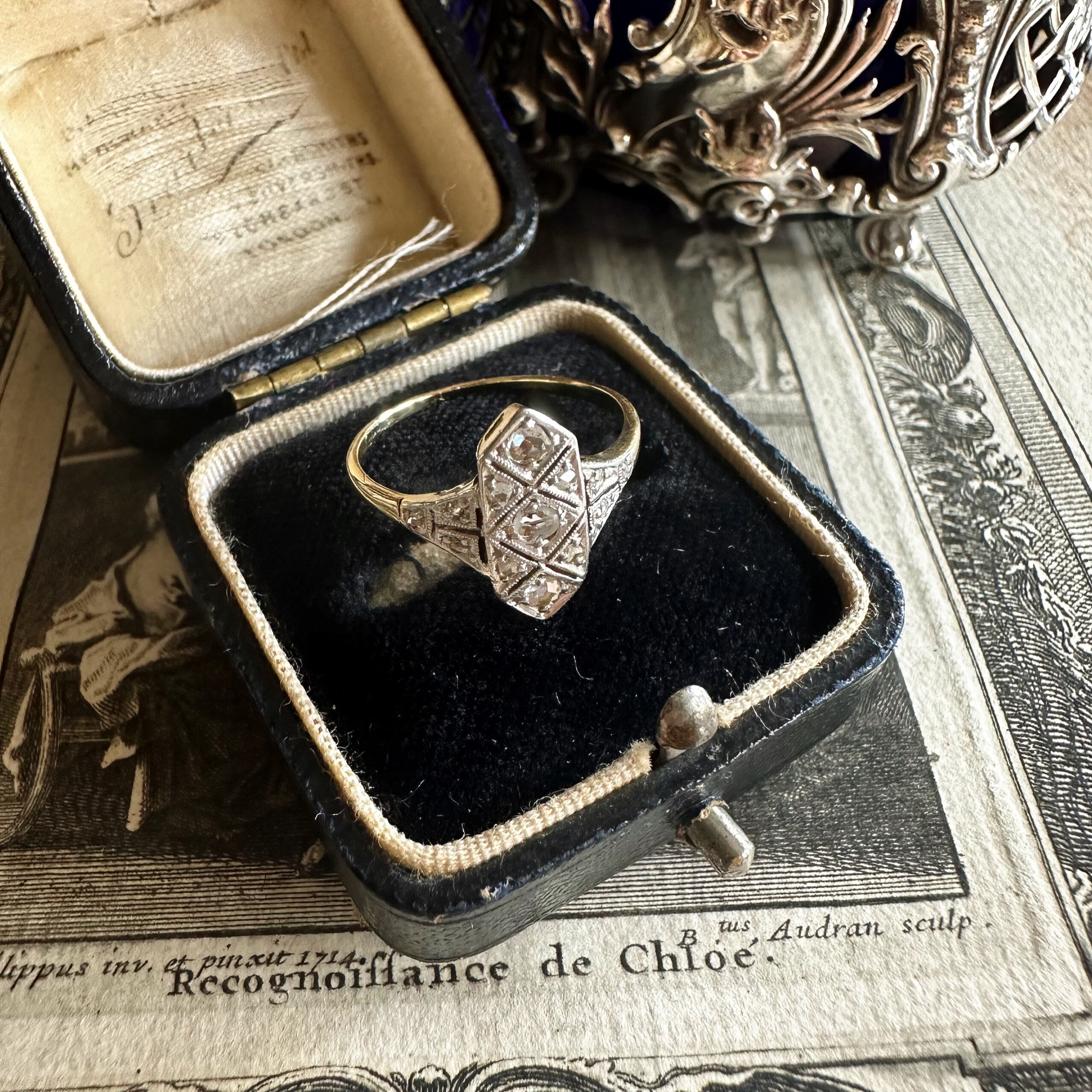 この小さな縦長のヘキサゴン(六角形)のプラチナフェイスを持つリングは、その雰囲気から醸し出すエレガンスからベルエポックからアールデコへの移行期を象徴しています。