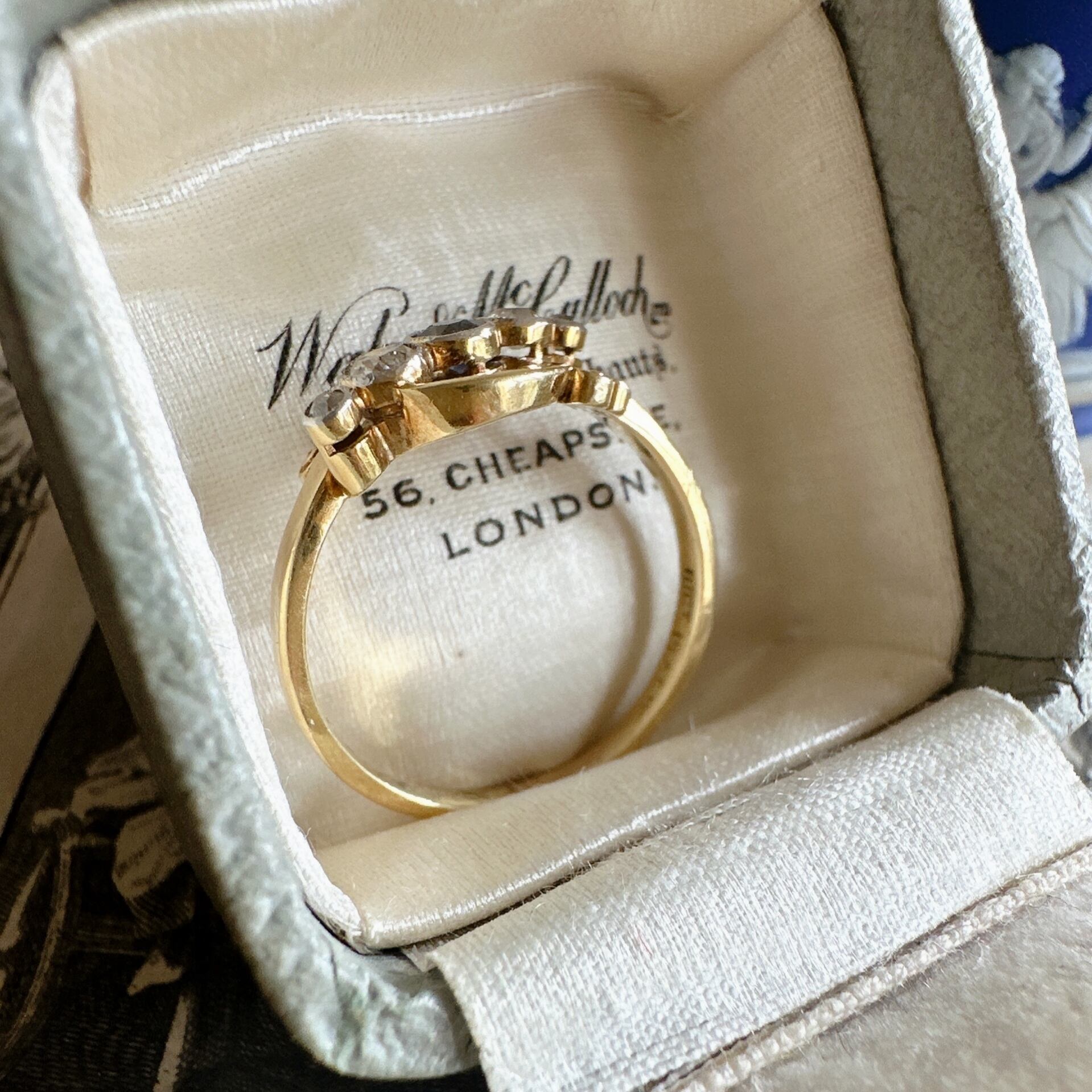 鮮やかなロイヤルブルーカラーのサファイアの輝きが中心に引き立ち、その両側には2石ずつのオールドカットダイヤモンドが配置されており、合計4石のダイヤモンドがエレガントな輝きを与えてた、デザイン性に富んだ美しいリングのご紹介です。