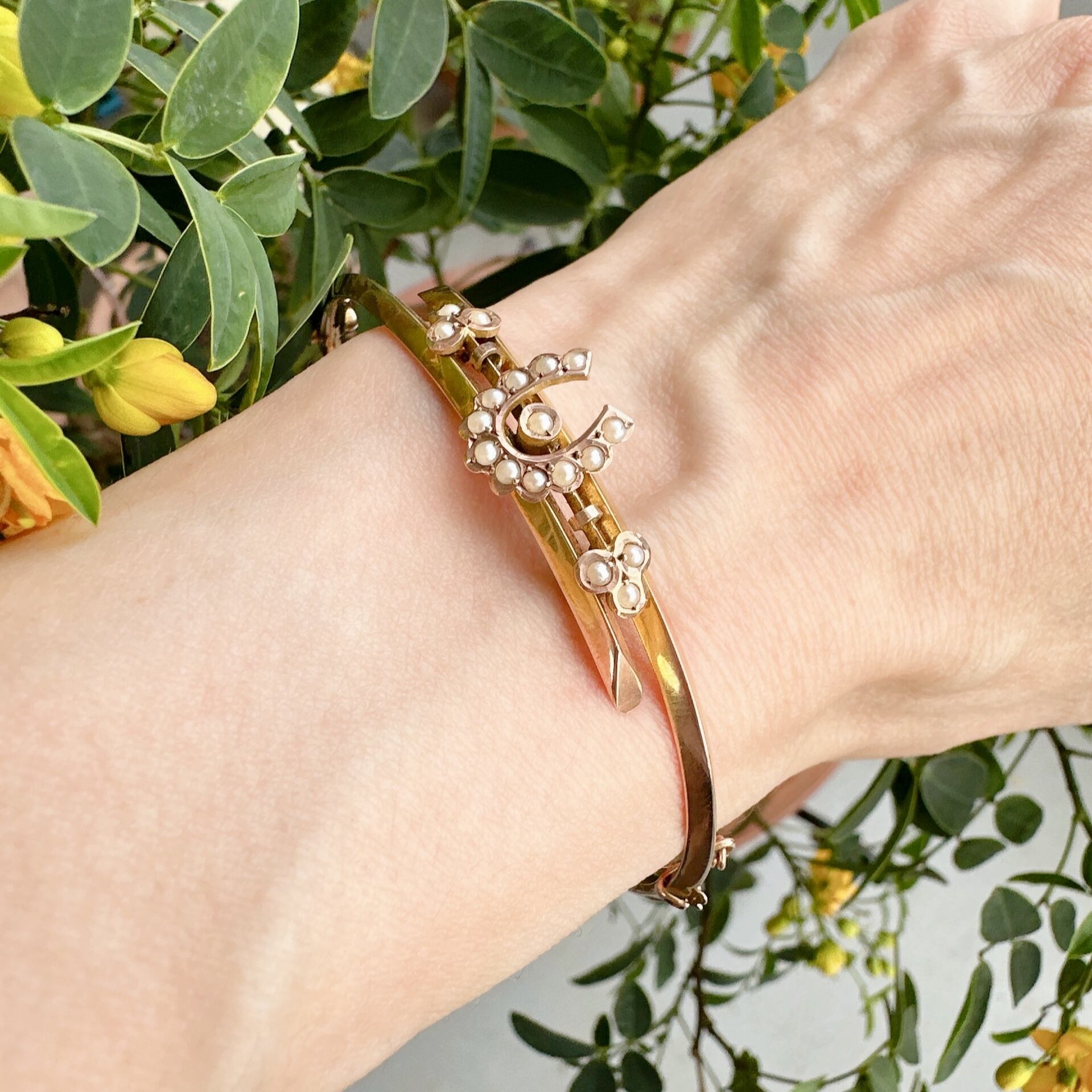 アンティークならではのシックで円やかな9金無垢ゴールドのヴィクトリアンバングルは、時を超えて輝き続ける美しさを持ちながら、ホースシューとシャムロックのシンボルがもたらす幸運を運んできてくれそうなスペシャルなひと品ではないでしょうか。