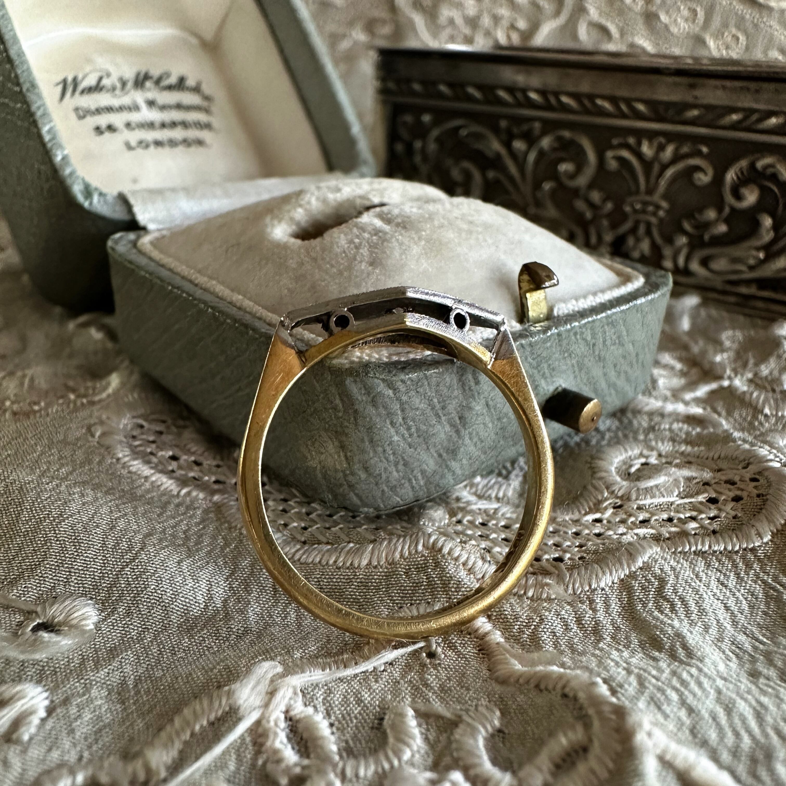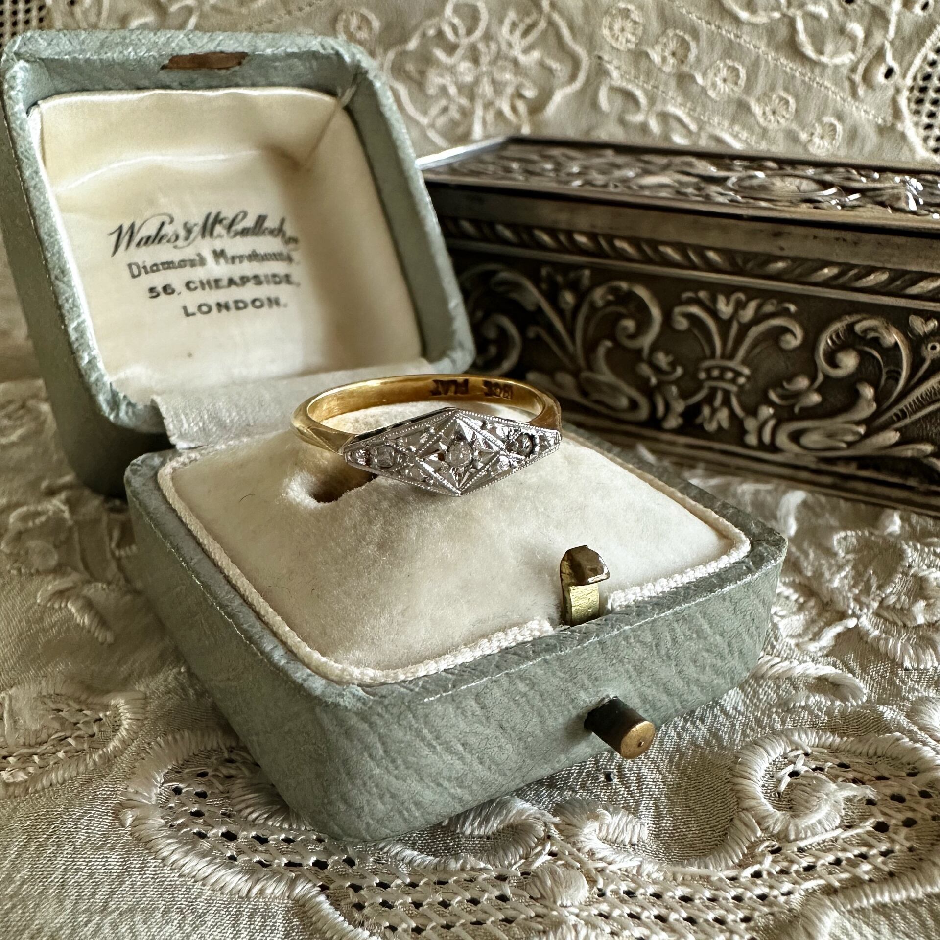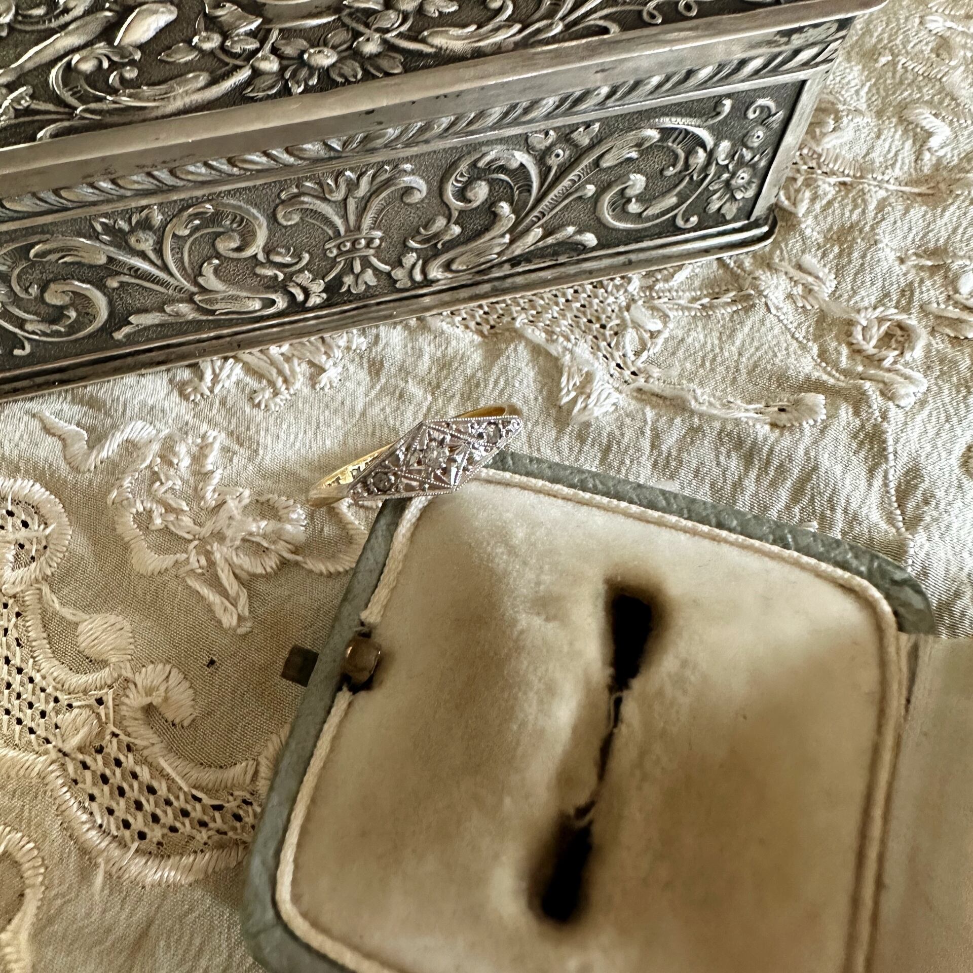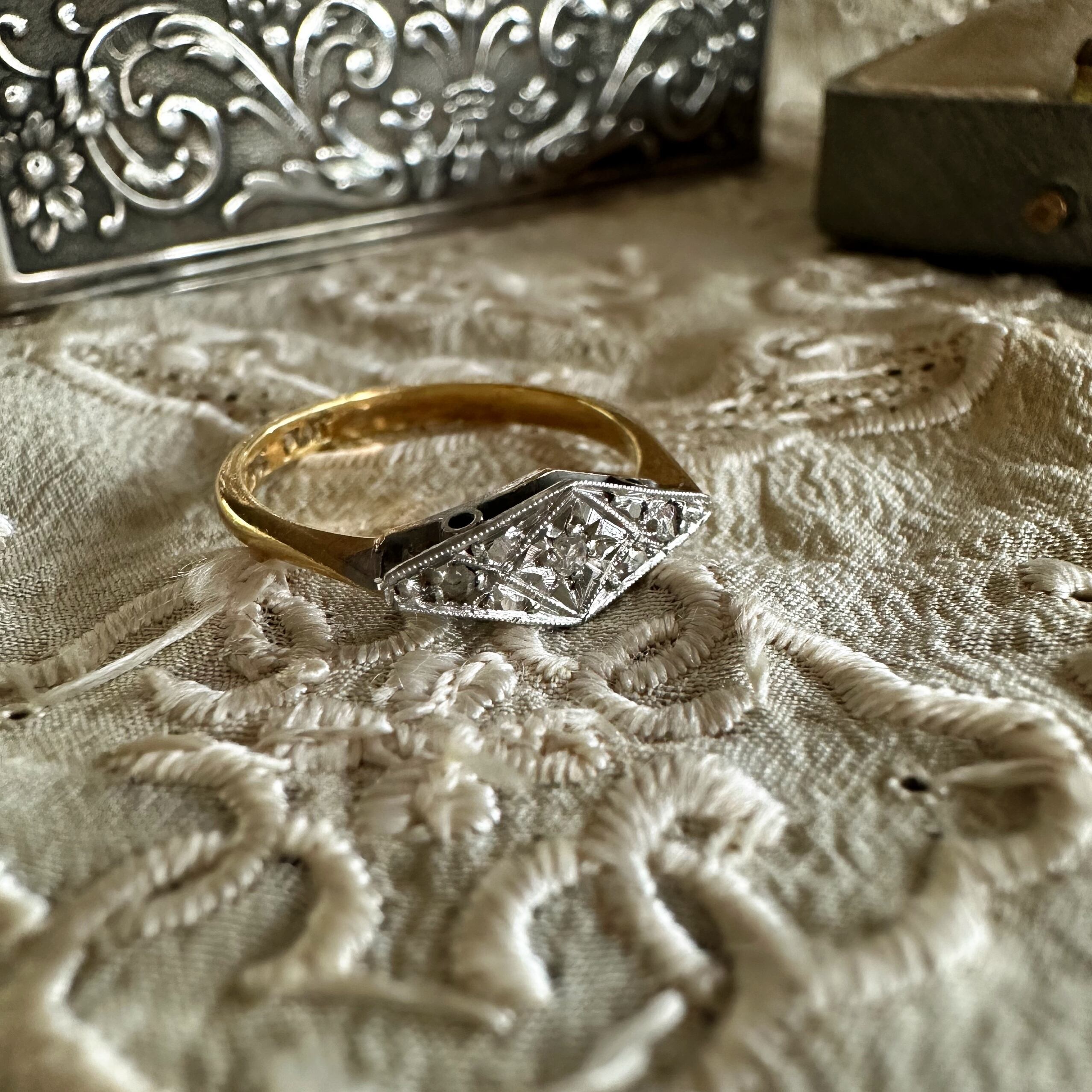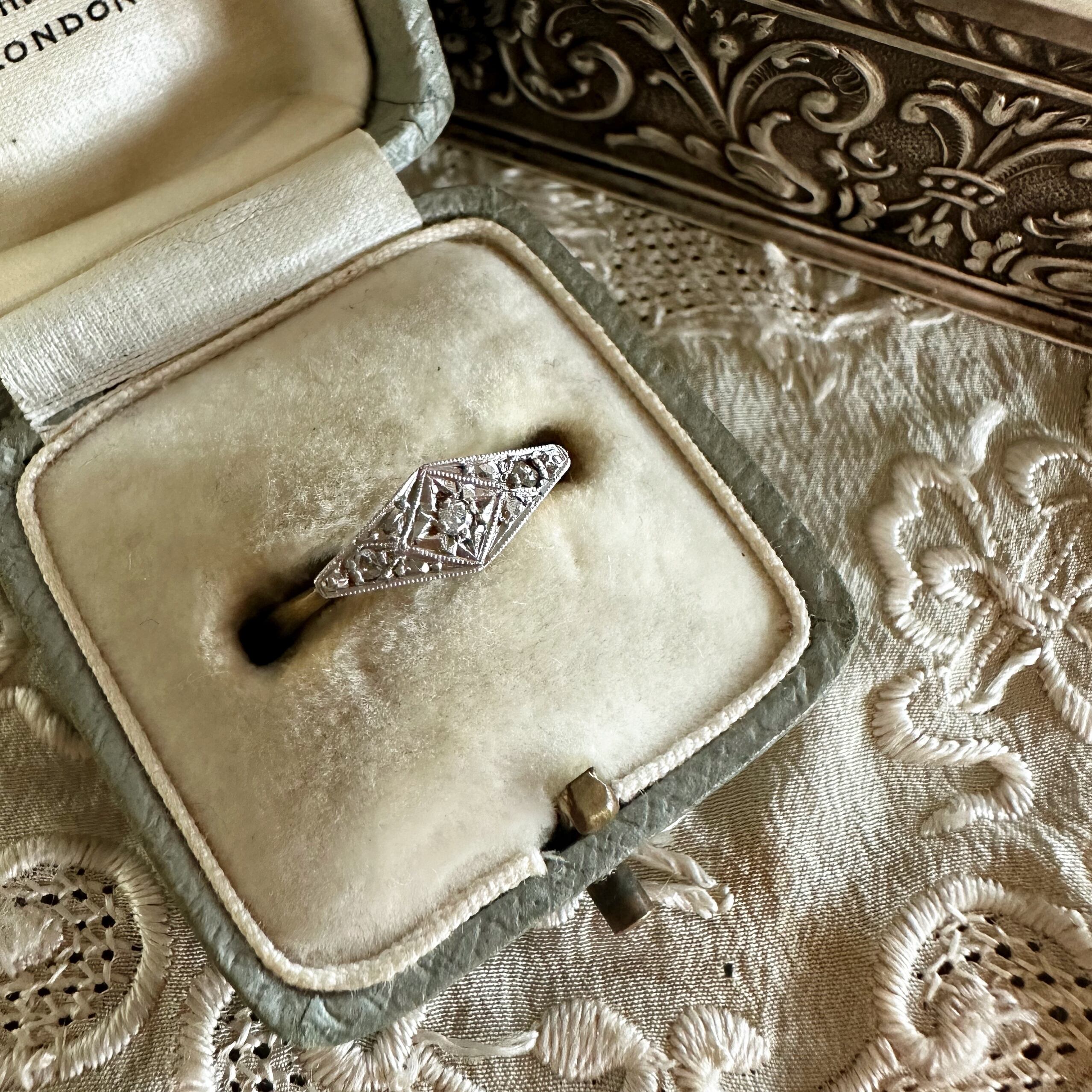 おしゃれで個性的なエレガンスを纏った、キリッとクールなシャープな菱形のアールデコリングをご紹介いたします。そのフェイスには幾何学模様の美しい彫金が施され、細部にまでこだわりが感じられます。このリングは、他のリングとは異なる独自の美しさがあり、ダイヤモンドの大きさや品質によってのみ評価されるリングとは一線を画しています。ですのでダイヤモンドのクオリティー重視の方には物足りない物となってしまうかもしれません。