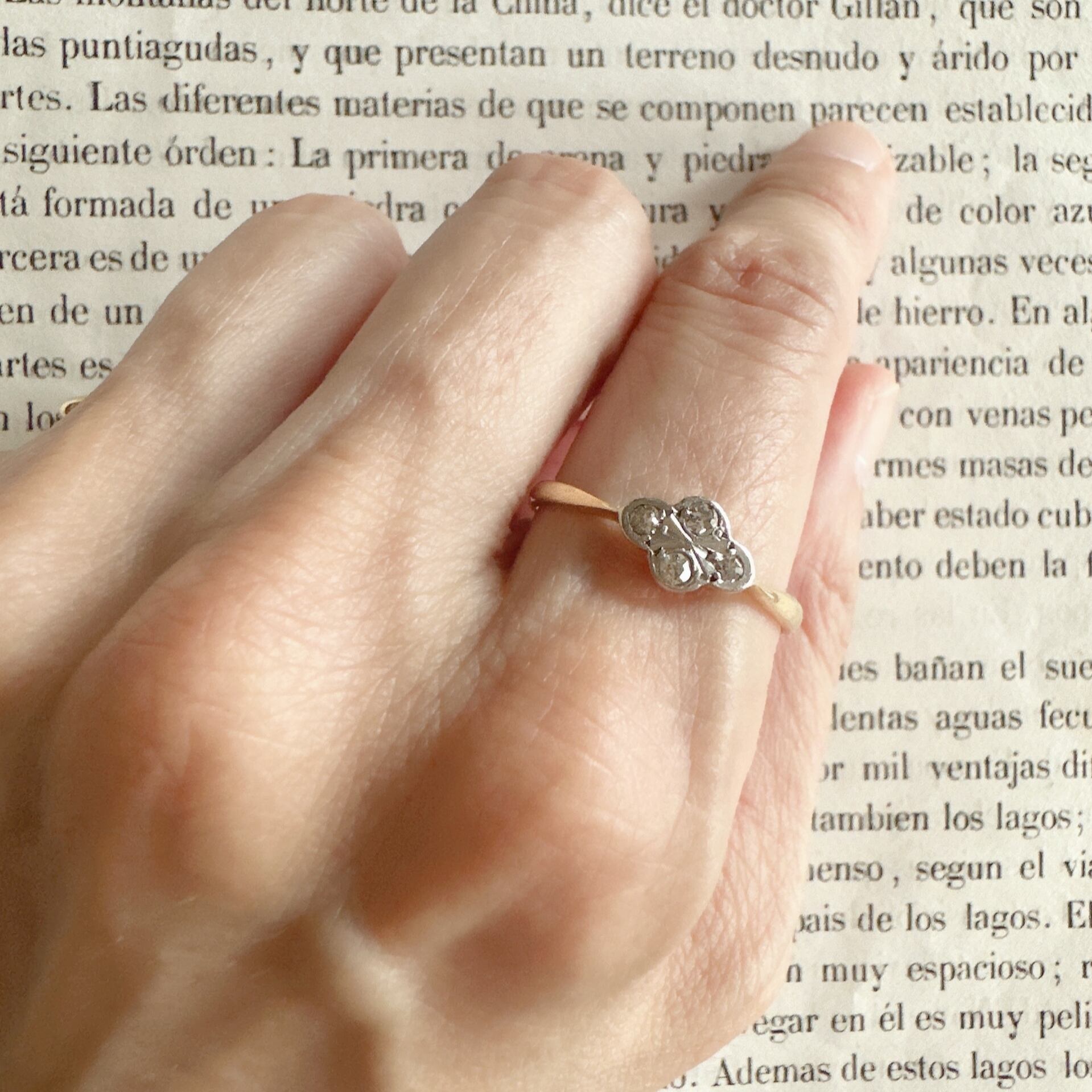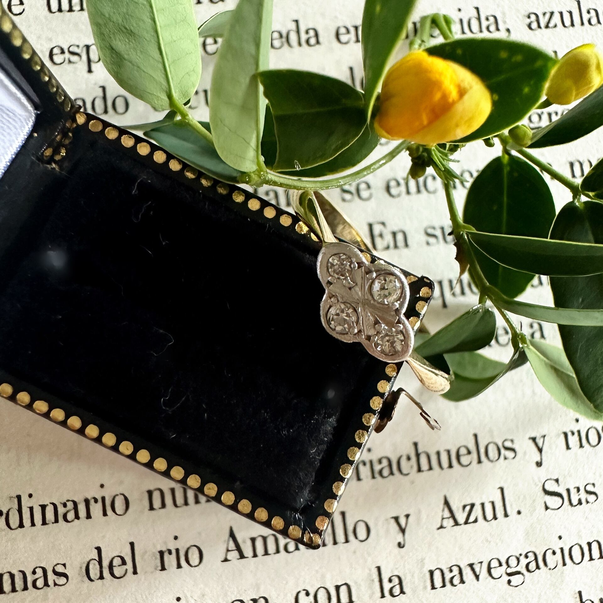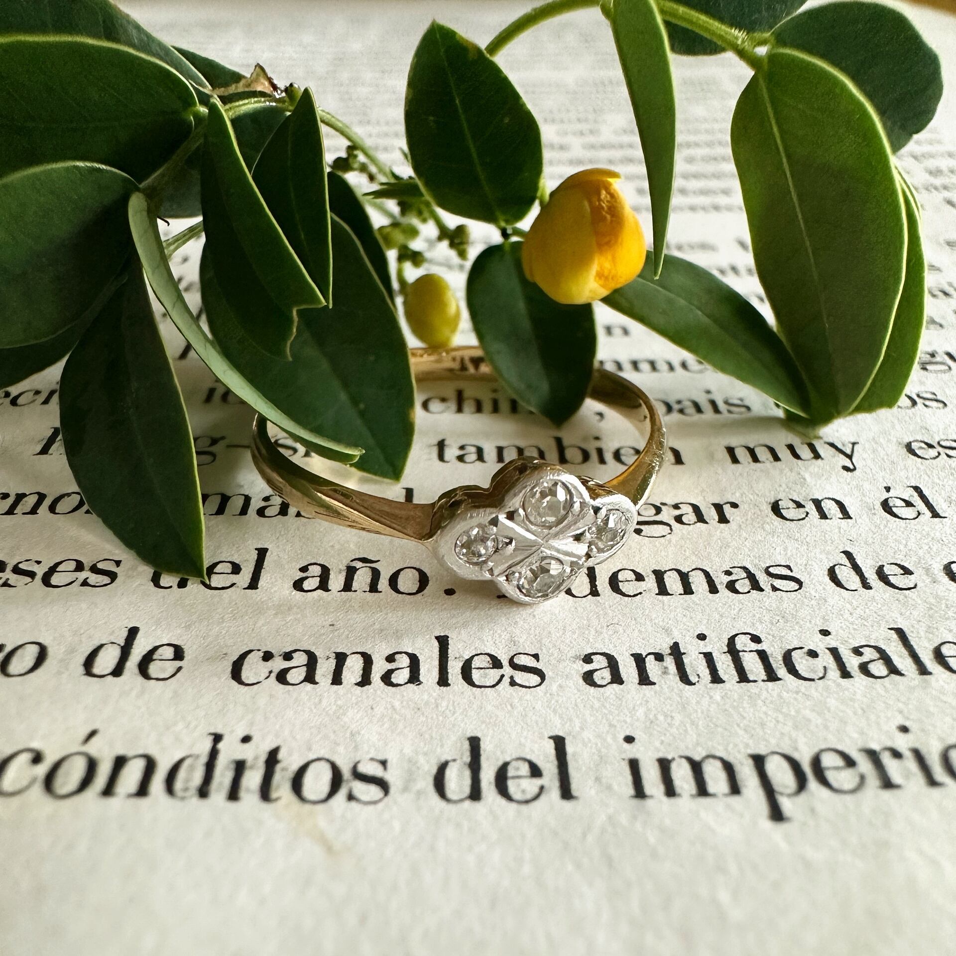 微かな朝露に濡れた小さなクローバーが、太陽の光を受けて煌めく情景をリングに込めたような、四つ葉のクローバーをイメージし、それぞれの葉先にオールドシングルカットダイヤモンドを散りばめた、愛らしいひと品です。