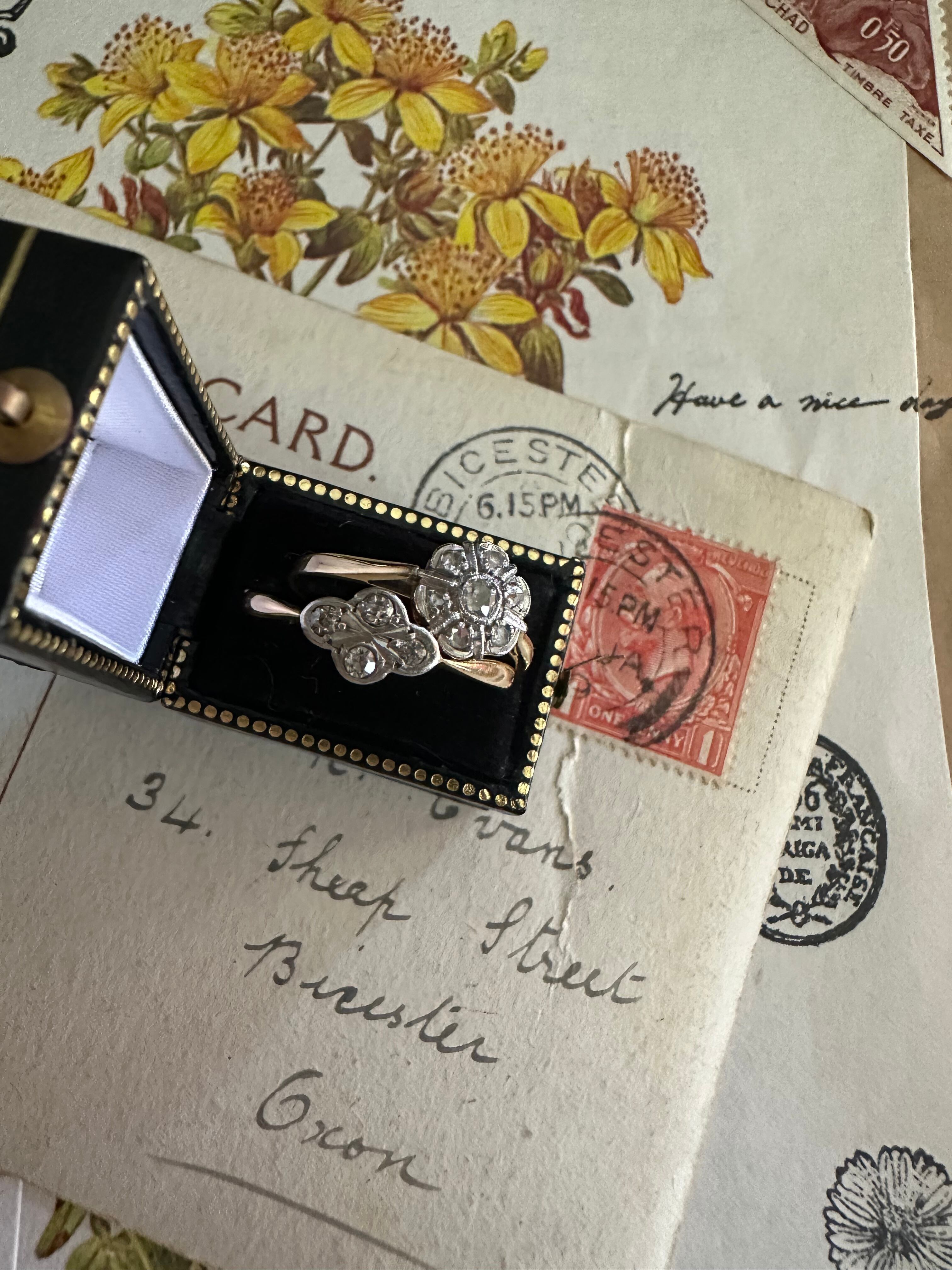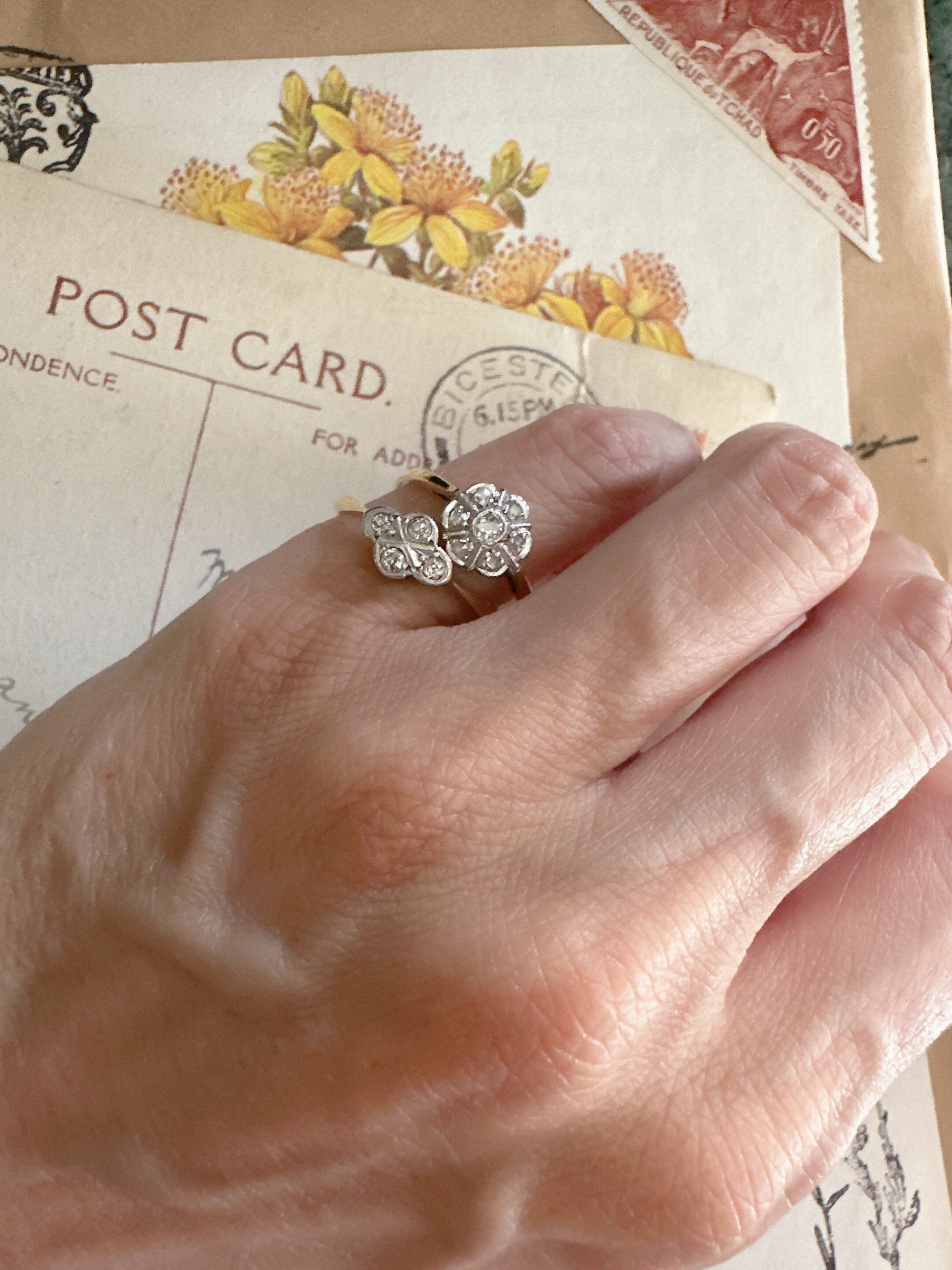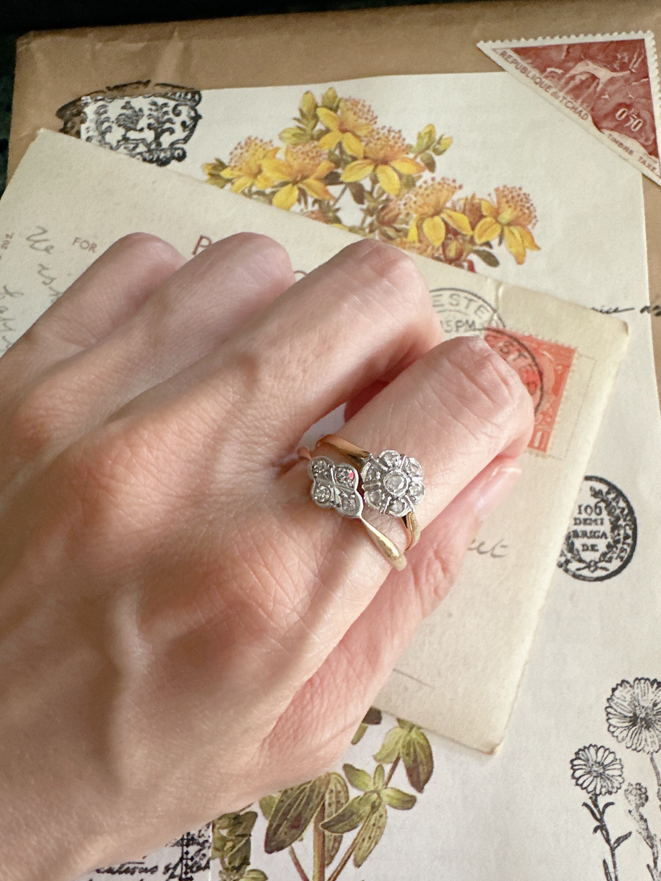 微かな朝露に濡れた小さなクローバーが、太陽の光を受けて煌めく情景をリングに込めたような、四つ葉のクローバーをイメージし、それぞれの葉先にオールドシングルカットダイヤモンドを散りばめた、愛らしいひと品です。