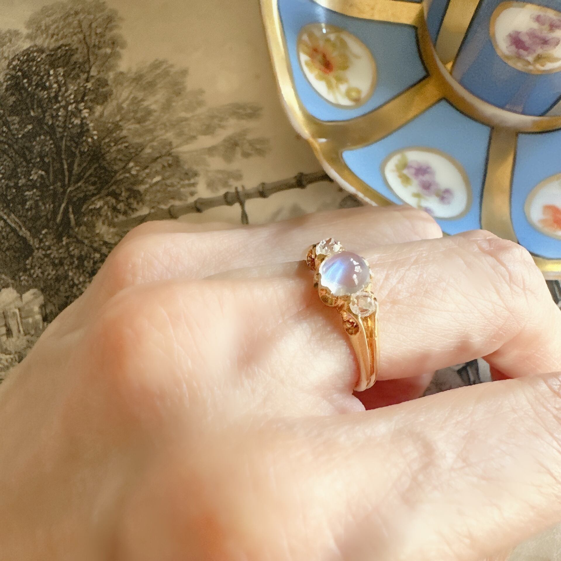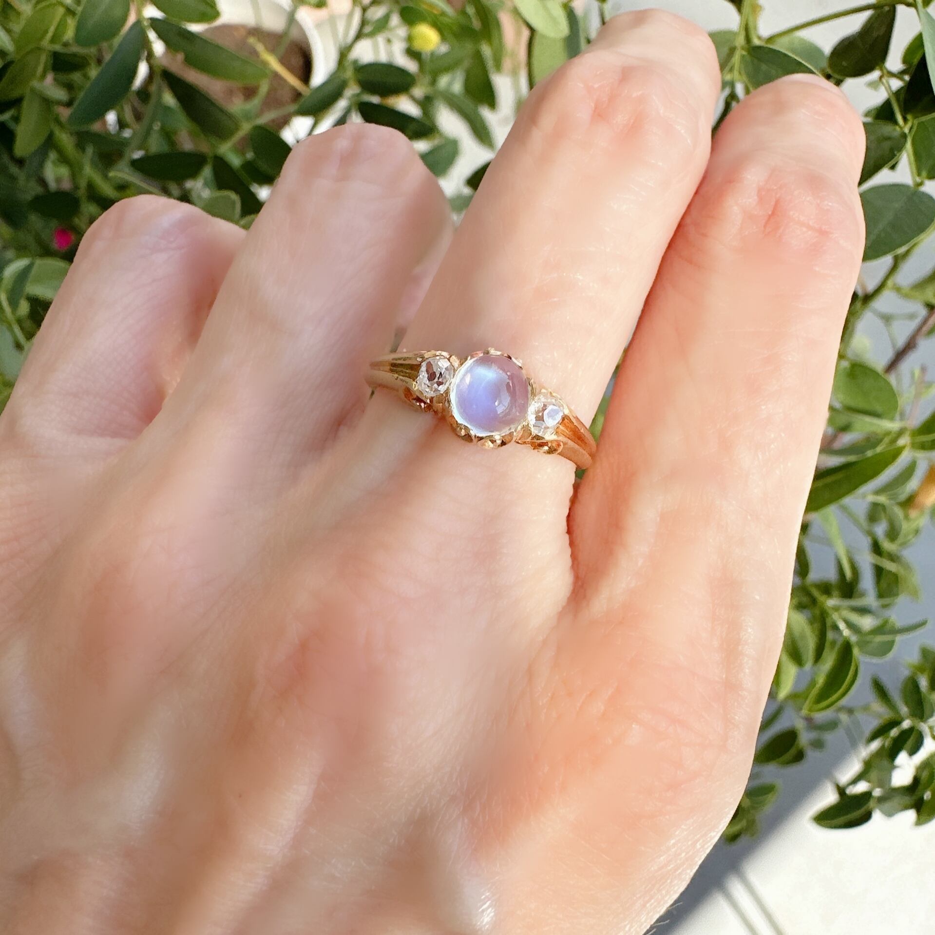 月光に輝く神秘の石、ムーンストーンが、ダイヤモンドと共にその輝きを携えて優雅に天から舞い降りてきたようなヴィクトリアンリングのご紹介です。